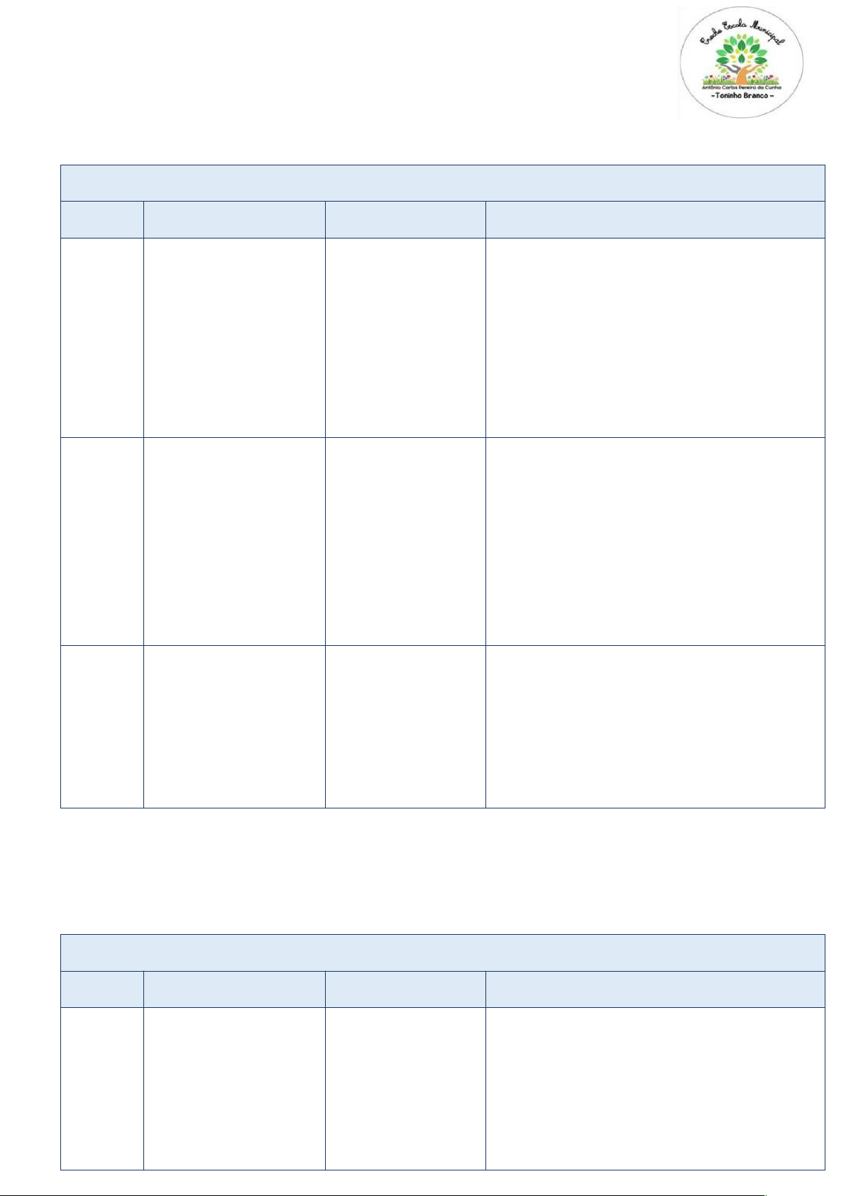 CRECHE ESCOLA ANTÔNIO CARLOS PEREIRA DA CUNHA PLANEJAMENTO QUINZENAL TURMA(A): MARGARIDA PROFESSOR(A): EMÍLIA R1 ANO DE ESCOLARIDADE: ( PRÉ I) PERÍODO: 20/08 a 29/08 Tema: FOLCLORE DATA HABILIDADES RECURSOS PROPOSTAS 4ª feira 20/08 (EI02ET03) Reproduzir movimentos de danças, brincadeiras e gestos. (EI02EF03) Reconhecer letras iniciais de palavras significativas. . Livro/figura do Saci, cartolina vermelha, lápis de cor. Rotina, rodinha, musicalização,chamadinha,alfabeto. Atividades: Saci-Pererê 1. Roda de conversa: Apresentação do personagem Saci. Contação de história. 2. Movimento: Brincadeira do “pula saci” (pular com um pé só). 3. Folhinha: Circular a letra S em palavras (Saci, sapo, sol). Colorir o desenho do Saci. 4. Artes: Fazer um chapéu vermelho de cartolina (do Saci). 5ª feira 21/08 (EI02CG01) Interessar-se e cuidar do ambiente e da natureza. (EI02EF03) Reconhecer letras iniciais de palavras significativas. . Imagens, folhas secas, cola, quebra-cabeça simples. Rotina, rodinha, musicalização,chamadinha,alfabeto. Curupira Roda de conversa: História do Curupira, protetor da floresta. Jogo: Montar quebra-cabeça de árvores. Folhinha: Pintar o Curupira e ligar a letra C a imagens (casa, cachorro, coração). Colagem de folhas secas em cartaz coletivo 6ª feira 22/08 (EI02TS02) Expressar-se por meio de desenhos e pinturas. (EI02EF03) Reconhecer letras iniciais de palavras significativas. Papel crepom, figuras da Iara, lápis de cor. Rotina, rodinha, musicalização,chamadinha,alfabeto. Iara Roda de conversa: História da Iara (a sereia das águas). Música: Cantar “Peixe Vivo” (adaptação infantil). Folhinha: Circular a letra I e colorir a sereia. Artes: Fazer colagem com papel crepom azul (ondas do rio). Tema: FOLCLORE DATA HABILIDADES RECURSOS PROPOSTAS 4ª feira 27/08 (EI02TS01) Criar produções artísticas coletivas. (EI02ET03) Reproduzir movimentos de danças e cantigas. . Música gravada, pratos de papel, tinta, pince Rotina, rodinha, musicalização,chamadinha,alfabeto. Boi-Bumbá Roda de conversa: Explicação do Bumba Meu Boi. Música/dança: Brincar com música do Boi-Bumbá. Folhinha: Colorir o boi e circular a letra B. Artes: Construção de máscara de boi com pratos de papel. 5ª feira 28/08 (EI02TS02) Usar imaginação em produções artísticas. (EI02EF03) Identificar letras iniciais de palavras. Papel colorido, cola, imagem da Cuca. . Rotina, rodinha, musicalização,chamadinha,alfabeto. Cuca História: Conversar sobre a personagem Cuca (sem assustar, de forma lúdica). Jogo: “Quem tem medo da Cuca?” – corrida e pega-pega divertido. Folhinha: Circular a letra C e pintar a figura da Cuca. Artes: Fazer colagem de escamas da Cuca com papel colorido 6ª feira 29/08 (EI02CG02) Valorizar manifestações culturais. (EI02ET03) Participar de jogos e brincadeiras. Cartazes, comidas típicas, folhas impressas. Rotina, rodinha, musicalização,chamadinha,alfabeto. Festa Folclórica Apresentação: Relembrar todos os personagens trabalhados. Jogo coletivo: Caça às letras iniciais no pátio (cartazes com S, C, I, B). Folhinha: Atividade de ligar cada personagem à sua letra inicial. Culinária: Degustação de comidas típicas do folclore (pamonha, bolo de milho, pipoca). image1.png