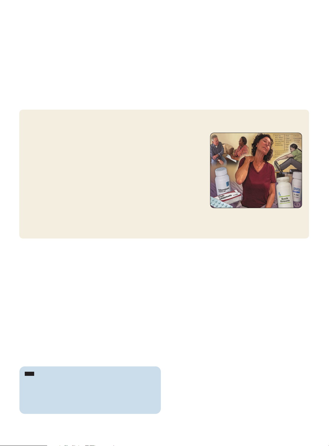 February 2023 ◆ Volume 107, Number 2 www.aafp.org/afp American Family Physician 137 Fibromyalgia is characterized by diffuse mus- culoskeletal pain, fatigue, poor sleep, and other somatic symptoms.1 Chronic diffuse pain affects 10% to 15% of adults in the general population worldwide, many of whom have fibromyalgia.2,3 Approximately 2% of people in the United States have fibromyalgia, although the prevalence var- ies across populations and with the diagnostic criteria used.3 Fibromyalgia can occur in chil- dren and adults and is found worldwide and across cultures. Women are diagnosed more frequently than men; a Scottish survey found that women are diagnosed between two and 14 times as often as men depending on the crite- ria used.3,4 Changes in the diagnostic criteria over the past decade, including the elimination of specific tender points, have resulted in more patients with chronic pain meeting the criteria for fibromyalgia.3-5 Pathophysiology Fibromyalgia is likely caused by disordered cen- tral nociceptive signal processing that leads to sensitization expressed as hyperalgesia and allo- dynia, which is similar to chronic pain conditions such as irritable bowel syndrome, interstitial cys- titis, chronic pelvic pain, and chronic low back pain.6,7 Functional brain imaging suggests that this aberrant processing may be attributed to an imbalance between excitatory and inhibitory neu- rotransmitters, particularly within the insula.8 Suggested etiologies include dysfunction of the hypothalamic-pituitary-adrenal axis and the autonomic nervous system, diffuse inflammation, glial cell activation, small fiber neuropathy, and infections such as the Epstein-Barr virus, Lyme disease, and viral hepatitis.9 Twin studies suggest a genetic component may also be a factor.10 Fibromyalgia: Diagnosis and Management Bradford T. Winslow, MD, University of Colorado School of Medicine, Aurora, Colorado; Swedish Family Medicine Residency, Englewood, Colorado Carmen Vandal, MD, and Laurel Dang, MD, Swedish Family Medicine Residency, Englewood, Colorado CME This clinical content conforms to AAFP criteria for CME. See CME Quiz on page 127. Author disclosure: No relevant financial relationships. Patient information: A handout on this topic, written by the authors of this article, is available with the online version of this article. Fibromyalgia is a chronic, centralized pain syndrome characterized by disordered processing of painful stimuli. Fibromyal- gia is diagnosed more frequently in women and occurs globally, affecting 2% of people in the United States. Patients with fibromyalgia have diffuse chronic pain, poor sleep, fatigue, cognitive dysfunc- tion, and mood disturbances. Comorbid conditions, such as functional somatic syndromes, psychiatric diagnoses, and rheumatologic conditions may be pres- ent. The Fibromyalgia Rapid Screening Tool is a helpful screening method for patients with diffuse chronic pain. The American College of Rheumatology criteria or the Analgesic, Anesthetic, and Addiction Clinical Trial Translations Innovations Opportunities and Networks–American Pain Society Pain Taxonomy diagnostic criteria can diagnose fibromyalgia. Establishing the diagnosis and providing education can reassure patients and decrease unnecessary testing. A multidisciplinary approach that incorporates nonpharmacologic therapies and medications to address problematic symptoms is most effective. Patient educa- tion, exercise, and cognitive behavior therapy can improve pain and function. Duloxetine, milnacipran, pregabalin, and amitriptyline are potentially effective medications for fibromyalgia. Nonsteroi- dal anti-inflammatory drugs and opioids have not demonstrated benefits for fibromyalgia and have significant limitations. (Am Fam Physician. 2023; 107(2): 137-144. Copyright © 2023 American Academy of Family Physicians.) Ill u st ra tio n b y Jo n at h an D im e s Downloaded from the American Family Physician website at www.aafp.org/afp. Copyright © 2023 American Academy of Family Physicians. For the private, non- commercial use of one individual user of the website. All other rights reserved. Contact copyrights@aafp.org for copyright questions and/or permission requests. Downloaded from the American Family Physician website at www.aafp.org/afp. Copyright © 2023 American Academy of Family Physicians. For the private, non- commercial use of one individual user of the website. All other rights reserved. Contact copyrights@aafp.org for copyright questions and/or permission requests. 138 American Family Physician www.aafp.org/afp Volume 107, Number 2 ◆ February 2023 FIBROMYALGIA Clinical Presentation Chronic diffuse pain is the predominant symptom in most patients with fibromyalgia. Patients may also experience muscle stiffness and tenderness. The physical examination in patients with fibromyalgia generally finds diffuse tenderness without other unusual findings. If joint swelling, inflammation, or deformities are present, an alternative or additional diagnosis should be investigated.5 Fatigue and sleep disturbances are also com- mon.5,11 Sleep disturbances include difficulty falling and staying asleep, frequent awaken- ings, or feeling unrefreshed after sleeping. Comorbid mental health diagnoses are com- mon, as are cognitive symptoms such as poor concentration, forgetfulness, or altered think- ing.5,6,12 This cognitive dysfunction has been termed “fibrofog” and is described by patients as a mental slowing that adversely affects daily activities.13 The presence of another painful disorder does not exclude the diagnosis of fibromyal- gia. The Fibromyalgia Rapid Screening Tool can screen patients with diffuse chronic pain to help distinguish between fibromyalgia and other conditions (Table 1).14 The tool may SORT: KEY RECOMMENDATIONS FOR PRACTICE Clinical recommendation Evidence rating Comments The diagnosis of fibromyalgia should be considered in patients with diffuse pain, fatigue, and sleep disturbances 
