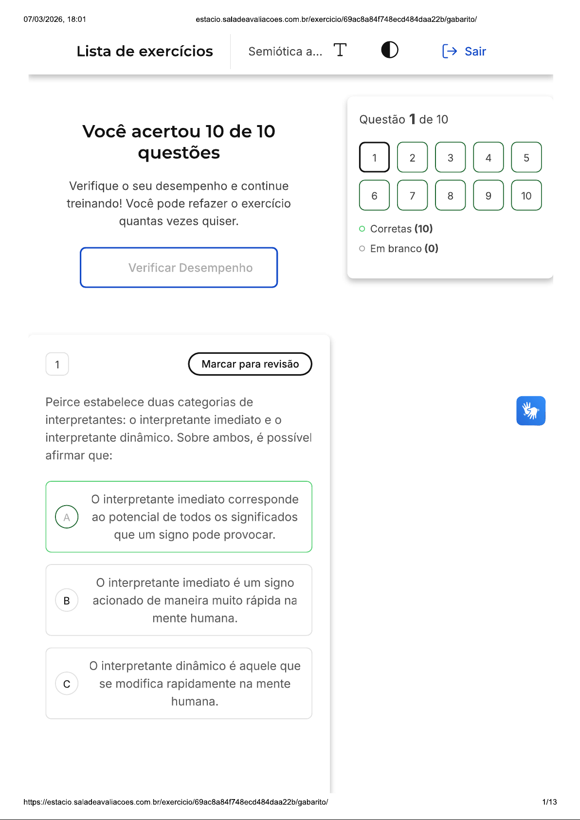 07/03/2026, 18:01 estacio.saladeavaliacoes.com.br/exercicio/69ac8a84f748ecd484daa22b/gabarito/ Lista de exercícios Semiótica a... T Sair Questão 1 de 10 Você acertou 10 de 10 questões 1 2 3 4 5 Verifique seu desempenho e continue 6 7 8 9 10 treinando! Você pode refazer exercício quantas vezes quiser. Corretas (10) Em branco (0) Verificar Desempenho 1 Marcar para revisão Peirce estabelece duas categorias de interpretantes: interpretante imediato e interpretante dinâmico. Sobre ambos, é possível afirmar que: interpretante imediato corresponde A ao potencial de todos os significados que um signo pode provocar. interpretante imediato é um signo acionado de maneira muito rápida na mente humana. interpretante dinâmico é aquele que c se modifica rapidamente na mente humana. 1/1307/03/2026, 18:01 estacio.saladeavaliacoes.com.br/exercicio/69ac8a84f748ecd484daa22b/gabarito/ interpretante imediato está D associado apenas às emoções e sensações mais viscerais. interpretante dinâmico é um símbolo E cujo significado varia de acordo com tempo. Resposta correta Parabéns, você selecionou a alternativa correta. Confira gabarito comentado! Gabarito Comentado De acordo com a teoria de Peirce, interpretante imediato é a primeira interpretação que fazemos de um signo, ou seja, ele corresponde ao potencial de todos os significados que um signo pode provocar. Isso significa que interpretante imediato é a soma de todas as possíveis interpretações que um signo pode ter. Portanto, a alternativa correta é a A: "O interpretante imediato corresponde ao potencial de todos os significados que um signo pode provocar". 2 Marcar para revisão Baseando-se nos estudos de Peirce sobre a Semiótica, é correto afirmar que: 2/1307/03/2026, 18:01 estacio.saladeavaliacoes.com.br/exercicio/69ac8a84f748ecd484daa22b/gabarito/ A ciência Semiótica preocupa-se, acima de tudo, com as percepções A visuais do receptor, pois é por meio de imagens que os signos são formados. estudo da Semiótica inicia-se com a intenção de compreender as percepções visuais e sonoras, bases da comunicação humana. A ciência Semiótica nasce com o objetivo de compreender o processo c de produção de sentido estabelecidos em determinada mensagem. Para a Semiótica, apenas as percepções sensoriais humanas têm D relevância no processo de comunicação. A Semiótica é uma ciência que valoriza somente signos formados por E imagens, visto que a percepção visual é a grande responsável pela comunicação. Resposta correta Parabéns, você selecionou a alternativa correta. Confira gabarito comentado! Gabarito Comentado A alternativa correta é a C, que afirma que a ciência Semiótica nasce com objetivo de compreender processo de produção de sentido estabelecidos em determinada mensagem. Isso significa que a Semiótica 3/1307/03/2026, 18:01 estacio.saladeavaliacoes.com.br/exercicio/69ac8a84f748ecd484daa22b/gabarito/ não se limita apenas às percepções visuais ou sonoras, mas sim ao processo de como sentido é produzido e interpretado em uma mensagem. Portanto, a Semiótica é uma ciência que estuda os signos e os processos de significação nas mais diversas formas de comunicação. 3 Marcar para revisão Estabelecimento de uma unidade social entre seres humanos pelo uso de signos de linguagem. Compartilhamento de conjunto comum de regras, para atividades que visam um objetivo. Processo por meio de signos em que um organismo afeta outro. Procedimento por meio dos quais uma mente pode afetar outra. Essas definições se referem a: A À comunicação À informação c À evolução D Ao canal E À redundância https://estacio.saladeavaliacoes.com.br/exercicio/69ac8a84f748ecd484daa22b/gabarito/ 4/1307/03/2026, 18:01 estacio.saladeavaliacoes.com.br/exercicio/69ac8a84f748ecd484daa22b/gabarito/ Resposta correta Parabéns, você selecionou a alternativa correta. Confira gabarito comentado! Gabarito Comentado As definições apresentadas no enunciado se referem ao conceito de comunicação. A comunicação é um processo de troca de informações que ocorre por meio de signos e sistemas de mensagens. Ela envolve a transmissão de ideias, sentimentos, pensamentos, entre outros, e é fundamental para a interação e entendimento entre os seres humanos. Portanto, a alternativa correta é a letra A: "À comunicação". 4 Marcar para revisão Qual par de elementos, a seguir, pode ser associado à categoria de índice? A Terra molhada Chuva. Bandeira País Placa de trânsito - Proibição para c estacionar. 5/1307/03/2026, 18:01 estacio.saladeavaliacoes.com.br/exercicio/69ac8a84f748ecd484daa22b/gabarito/ D Pintura Personalidade histórica. E Tatuagem Homenagem. Resposta correta Parabéns, você selecionou a alternativa correta. Confira gabarito comentado! Gabarito Comentado par "Terra molhada Chuva" é um exemplo de índice, pois a presença de terra molhada é um indicativo direto de que choveu, sem necessidade de interpretação ou conhecimento prévio. A terra molhada é um sinal físico que aponta para a ocorrência da chuva. Portanto, a alternativa correta é a letra 5 Marcar para revisão De acordo com a perspectiva peirciana, a categoria objeto pode ser dividida em: A Objetos imediatos e dinâmicos. Índices e símbolos. c Objetos icônicos e indicativos. https://estacio.saladeavaliacoes.com.br/exercicio/69ac8a84f748ecd484daa22b/gabarito/ 6/1307/03/2026, 18:01 estacio.saladeavaliacoes.com.br/exercicio/69ac8a84f748ecd484daa22b/gabarito/ D Representamen e índex. E Objetos semânticos e semióticos. Resposta correta Parabéns, você selecionou a alternativa correta. Confira gabarito comentado! Gabarito Comentado Na perspectiva peirciana, a categoria objeto é dividida em objetos imediatos e dinâmicos. objeto imediato é objeto tal como signo o representa, é a ideia que temos do objeto. Já objeto dinâmico é objeto tal como ele é, independentemente de como percebemos ou representamos. Portanto, a alternativa c