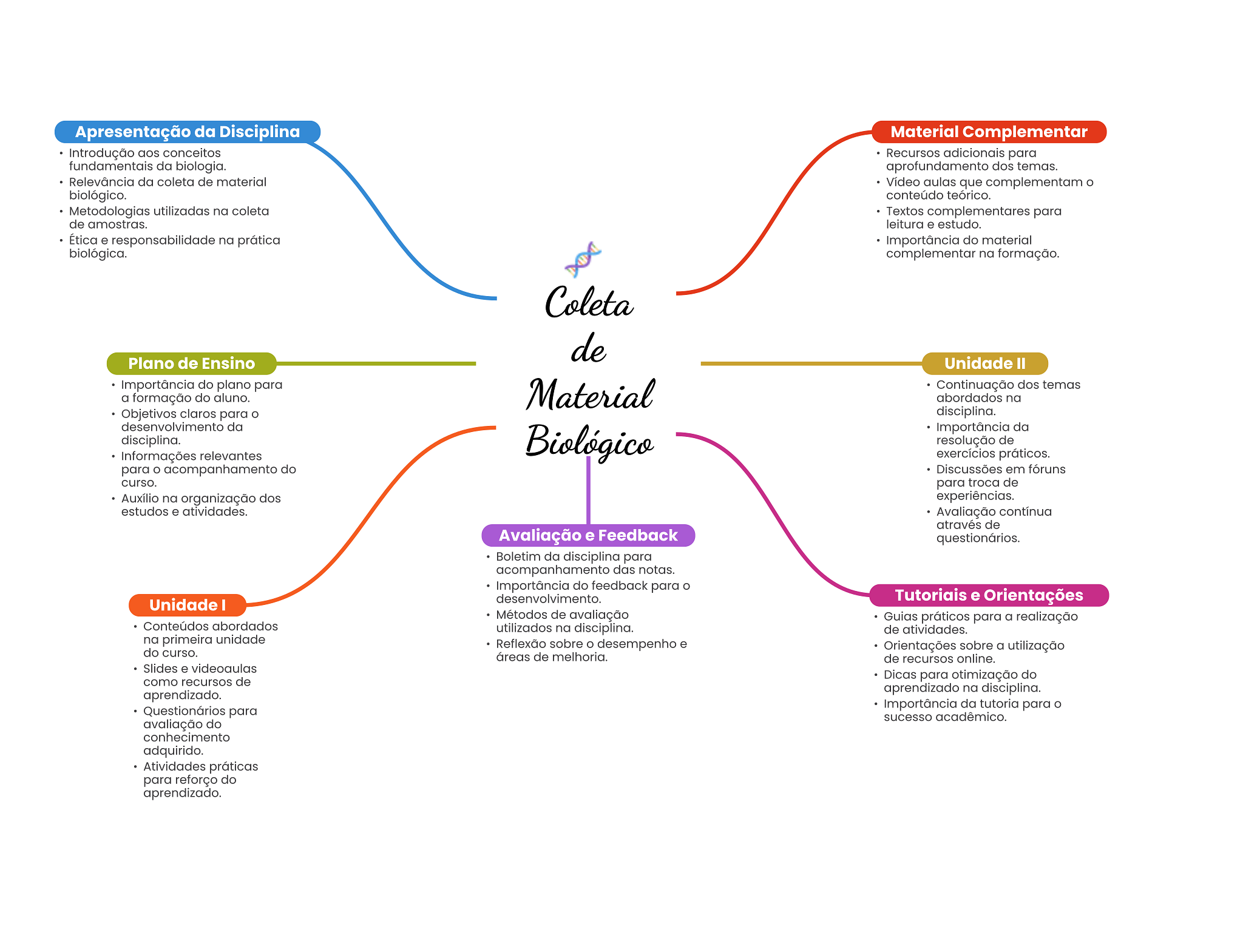 Apresentação da Disciplina Material Complementar Introdução aos conceitos Recursos adicionais para fundamentais da biologia. aprofundamento dos temas. Relevância da coleta de material Vídeo aulas que complementam biológico. conteúdo teórico. Metodologias utilizadas na coleta Textos complementares para de amostras. leitura e estudo. Ética e responsabilidade na prática Importância do material biológica. complementar na formação. Coleta de Plano de Ensino Unidade II Importância do plano para a formação do aluno. Material Continuação dos temas abordados na Objetivos claros para O disciplina. desenvolvimento da Importância da disciplina. Biológico resolução de Informações relevantes exercícios práticos. para acompanhamento do Discussões em fóruns curso. para troca de Auxílio na organização dos experiências. estudos e atividades. Avaliação contínua através de Avaliação e Feedback questionários. Boletim da disciplina para acompanhamento das notas. Importância do feedback para O Unidade I Tutoriais e Orientações Métodos de avaliação Guias práticos para a realização Conteúdos abordados utilizados na disciplina. de atividades. na primeira unidade Reflexão sobre desempenho e do curso. Orientações sobre a utilização áreas de melhoria. de recursos online. Slides e videoaulas como recursos de Dicas para otimização do aprendizado. aprendizado na disciplina. Questionários para Importância da tutoria para sucesso acadêmico. avaliação do conhecimento adquirido. Atividades práticas para reforço do aprendizado.