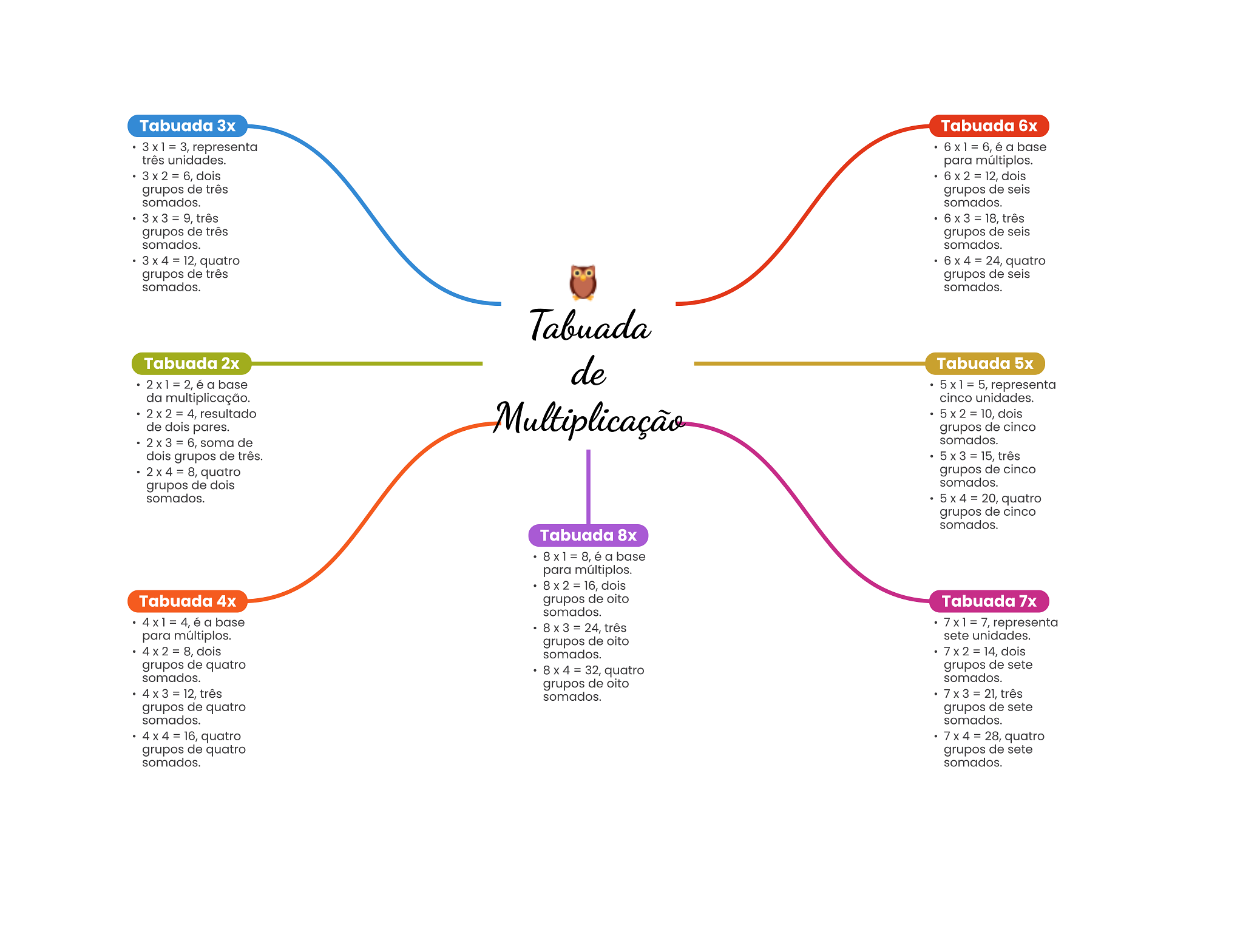 Tabuada Tabuada 6x representa 6x1 = 6, é a base três unidades. para múltiplos. 6 X 2 = 12, dois grupos de três grupos de seis somados. somados. 6 X 3 = 18, três grupos de três grupos de seis somados. somados. 3 X 4 = 12, quatro 6 4 = 24, quatro grupos de três grupos de seis somados. somados. Tabuada Tabuada 2x de Tabuada 5x = 5, representa da multiplicação. cinco unidades. de dois pares. Multiplicação 5 X 2 = 10, dois grupos de cinco 2 3 = 6, soma de somados. dois grupos de três. = 15, três 2 X 4 = 8, quatro grupos de cinco grupos de dois somados. somados. 5 X 4 = 20, quatro grupos de cinco somados. Tabuada 8x para múltiplos. X 2 = 16, dois Tabuada 4x grupos de oito Tabuada somados. 7x1=7, representa para múltiplos. sete unidades. grupos de oito = 8, dois somados. 7 X 2 = 14, dois grupos de quatro quatro grupos de sete somados. somados. grupos de oito X 3 = 12, três somados. 7 X 3 = 21, três grupos de quatro grupos de sete somados. somados. 4 X 4 = 16, quatro 7 X 4 = 28, quatro grupos de quatro grupos de sete somados. somados.