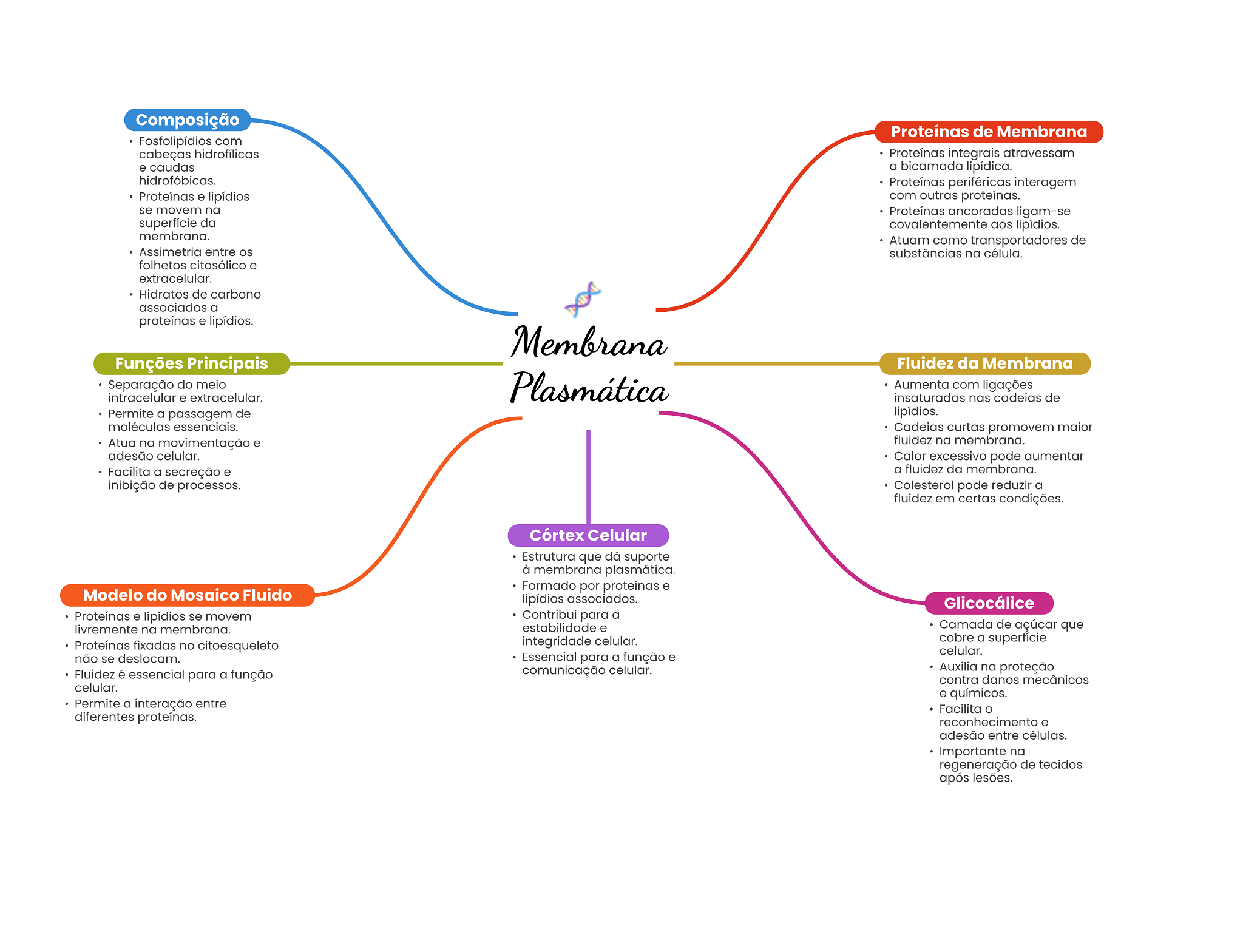 Composição Proteínas de Membrana Fosfolipídios com cabeças hidrofílicas Proteínas integrais atravessam e caudas a bicamada lipídica. hidrofóbicas. Proteínas periféricas interagem Proteínas e lipídios com outras proteínas. se movem na Proteínas ancoradas ligam-se superfície da covalentemente aos lipídios. membrana. Atuam como transportadores de Assimetria entre substâncias na célula. folhetos citosólico e extracelular. Hidratos de carbono associados a proteínas e lipídios. Membrana Funções Principais Fluidez da Membrana Separação do meio Plasmática Aumenta com ligações intracelular e extracelular. insaturadas nas cadeias de Permite a passagem de lipídios. moléculas essenciais. Cadeias curtas promovem maior Atua na movimentação e fluidez na membrana. adesão celular. Calor excessivo pode aumentar Facilita a secreção e a fluidez da membrana. inibição de processos. Colesterol pode reduzir a fluidez em certas condições. Córtex Celular Estrutura que dá suporte à membrana plasmática. Formado por proteínas e Modelo do Mosaico Fluido lipídios associados. Glicocálice Proteínas e lipídios se movem Contribui para a livremente na membrana. estabilidade e Camada de açúcar que Proteínas fixadas no citoesqueleto integridade celular. cobre a superfície celular. não se deslocam. Essencial para a função e comunicação celular. Auxilia na proteção Fluidez é essencial para a função contra danos mecânicos celular. e químicos. Permite a interação entre Facilita diferentes proteínas. reconhecimento e adesão entre células. Importante na regeneração de tecidos após lesões.