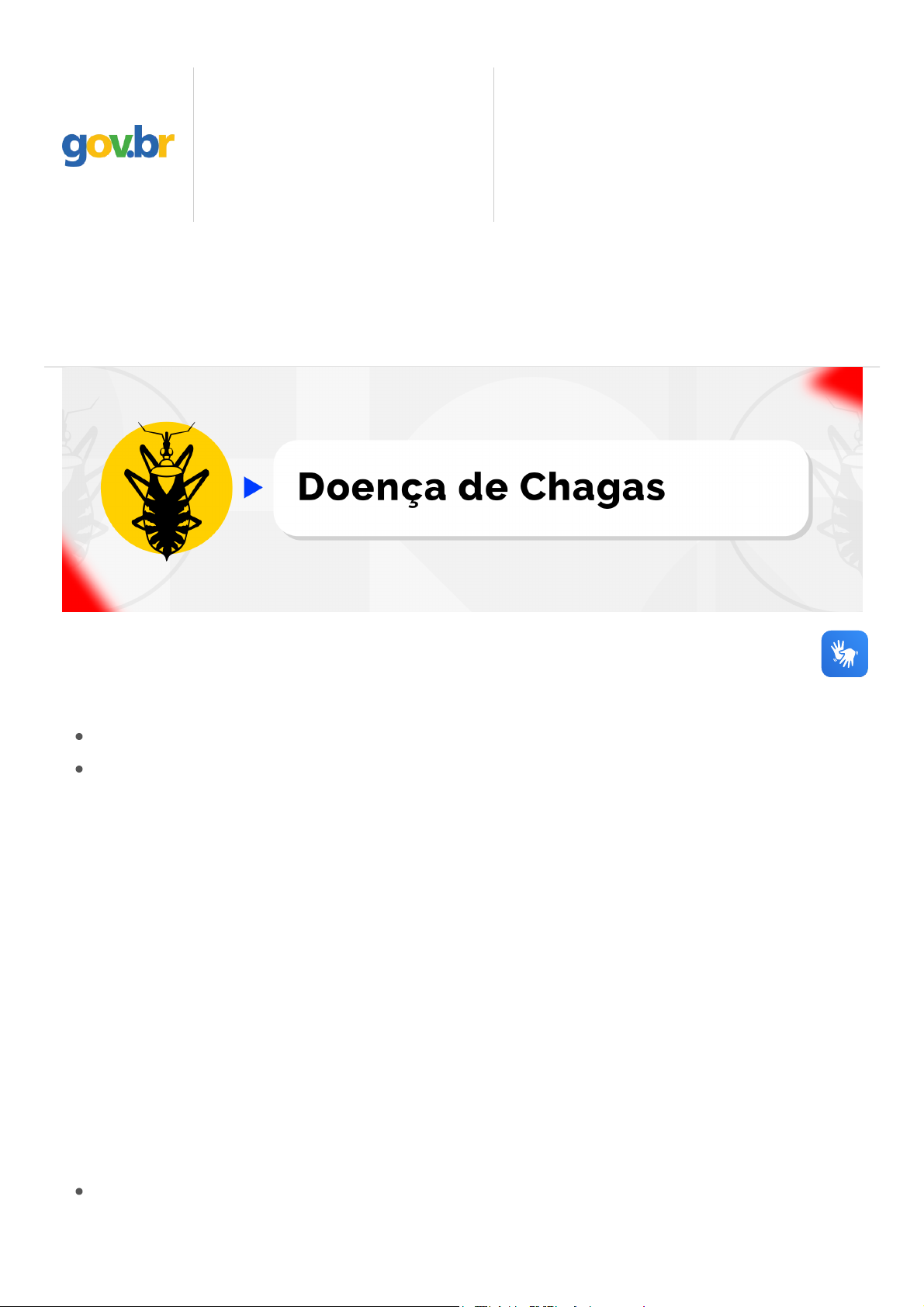 > Assuntos > Saúde de A a Z > D > Doença de Chagas A doença de Chagas é uma infecção causada por um parasita chamado Trypanosoma cruzi. Ela pode evoluir em duas fases: Fase aguda: acontece logo após a infecção. A pessoa pode ter sintomas ou não. Fase crônica: pode surgir anos depois. Em muitos casos não apresenta sintomas, mas pode causar problemas no coração e no sistema digestivo. O que são os triatomíneos? Os triatomíneos são insetos conhecidos como barbeiro, chupão, procotó ou bicudo. Eles passam pelas fases de ovo, ninfa e adultos. Tanto as ninfas quanto os adultos se alimentam de sangue e, quando estão infectados, podem transmitir o parasita da doença de Chagas. Período de incubação É o tempo entre a infecção e o aparecimento dos sintomas: Vetorial: 4 a 15 dias Transfusão ou transplante: 30 a 40 dias ou mais Governo Federal Órgãos do Governo Acesso à Informação Legislação Acessibilidade Entrar com gov.br Ministério da Saúde CONTEÚDO 1 PÁGINA INICIAL 2 NAVEGAÇÃO 3 BUSCA 4 MAPA DO SITE 5 17/03/2026, 21:00 Doença de Chagas — Ministério da Saúde https://www.gov.br/saude/pt-br/assuntos/saude-de-a-a-z/d/doenca-de-chagas 1/6 https://www.gov.br/saude/pt-br https://www.gov.br/saude/pt-br https://www.gov.br/saude/pt-br/assuntos https://www.gov.br/saude/pt-br/assuntos/saude-de-a-a-z https://www.gov.br/saude/pt-br/assuntos/saude-de-a-a-z/d https://www.gov.br/pt-br https://www.gov.br/pt-br https://www.gov.br/pt-br/orgaos-do-governo https://www.gov.br/acessoainformacao/pt-br http://www4.planalto.gov.br/legislacao https://www.gov.br/governodigital/pt-br/acessibilidade-digital https://www.gov.br/saude/pt-br https://www.gov.br/ Oral: 3 a 22 dias Acidental: até 20 dias Vertical: pode ocorrer em qualquer momento da gestação ou no parto A doença de Chagas pode ser transmitida de várias formas: Vetorial: quando as fezes do barbeiro infectado entram em contato com feridas na pele ou mucosas após a picada. Oral: pela ingestão de alimentos ou bebidas contaminadas com o parasita. Vertical (congênita): da mãe infectada para o bebê durante a gravidez ou o parto. Transfusão ou transplante: por sangue ou órgãos de doadores infectados. Acidental: contato com material contaminado, geralmente em laboratórios ou durante a manipulação de animais silvestres. FORMAS DE TRANSMISSÃO Certificação da eliminação da transmissão vertical SINTOMAS Fase aguda Os sintomas mais comuns são: Febre por mais de 7 dias e dor de cabeça; Fraqueza intensa, inchaço no rosto e nas pernas; Ferida parecida com furúnculo no local da entrada do parasita (em casos de transmissão pelo barbeiro). Fase crônica No início, a pessoa pode não sentir nada. Com o tempo, podem surgir: Problemas no coração, incluindo insuficiência cardíaca; Problemas digestivos, como aumento do intestino (megacólon); ou Aumento do esôfago (megaesôfago). CONTEÚDO 1 PÁGINA INICIAL 2 NAVEGAÇÃO 3 BUSCA 4 MAPA DO SITE 5 17/03/2026, 21:00 Doença de Chagas — Ministério da Saúde https://www.gov.br/saude/pt-br/assuntos/saude-de-a-a-z/d/doenca-de-chagas 2/6 https://www.gov.br/saude/pt-br/composicao/svsa/certificacao-da-eliminacao-da-transmissao-vertical https://www.gov.br/ Na fase aguda, o diagnóstico é feito com base nos sintomas e na situação de risco, como surtos. Na fase crônica, muitas pessoas não têm sintomas, por isso é importante investigar se a pessoa: Morou ou mora em áreas com barbeiro Viveu em casas que facilitam a presença do inseto Veio de áreas com histórico da doença Recebeu transfusão de sangue antes de 1992 Tem familiares com diagnóstico de doença de Chagas Gestantes com risco devem fazer o exame durante o pré-natal - O diagnóstico é confirmado por exame de sangue, feito gratuitamente pelo SUS. Procure um profissional de saúde para orientação. DIAGNÓSTICO O tratamento deve ser indicado por um médico após a confirmação da doença. O principal medicamento é o benznidazol, fornecido gratuitamente pelo SUS. Na fase aguda, o tratamento deve começar o quanto antes. Na fase crônica, o uso do medicamento depende de cada caso. Quando necessário, o nifurtimox pode ser usado como alternativa. Pessoas com problemas no coração ou no sistema digestivo precisam de acompanhamento contínuo. Em dezembro de 2023, o Ministério da Saúde retomou o fornecimento do único medicamento pediátrico indicado para o tratamento da doença de Chagas no Brasil. Após oito anos de descontinuidade, o fármaco antiparasitário benznidazol 12,5 mg voltou a ser ofertado para o tratamento de crianças infectadas pela doença. TRATAMENTO A prevenção está ligada à forma de transmissão da doença. Uma medida importante é evitar a presença de barbeiros nas casas, com ações feitas pelas equipes de saúde. Também é recomendado: PREVENÇÃO CONTEÚDO 1 PÁGINA INICIAL 2 NAVEGAÇÃO 3 BUSCA 4 MAPA DO SITE 5 17/03/2026, 21:00 Doença de Chagas — Ministério da Saúde https://www.gov.br/saude/pt-br/assuntos/saude-de-a-a-z/d/doenca-de-chagas 3/6 https://www.gov.br/ Usar telas em portas e janelas ou mosquiteiros Utilizar repelentes e roupas de manga longa, principalmente à noite e em áreas de mata Prevenção da transmissão oral Para evitar a transmissão pelos alimentos: Lave bem frutas, verduras e legumes com água potável Observe os alimentos antes de triturar ou bater Mantenha o local de preparo limpo e protegido Guarde alimentos em recipientes fechados Realize orientações e treinamentos para quem manipula alimentos Os PITs são locais nos serviços de saúde onde a população pode levar barbeiros encontrados em casa. Nesses postos, o inseto é identificado e encaminhado para análise. Os PITs ajudam a descobrir rapidamente a presença do barbeiro na comunidade e orientam a população sobre prevenção. Eles são muito importantes para o controle da doença de Chagas e para apoiar o trabalho das equipes de saúde. Ao encontrar triatomíneos no domicílio, o mo