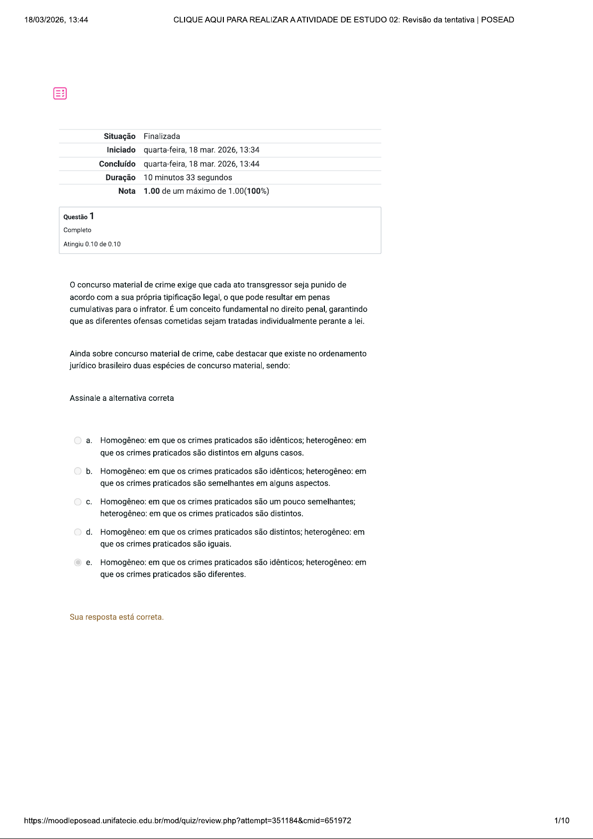 18/03/2026, 13:44 CLIQUE AQUI PARA REALIZAR AATIVIDADE DE ESTUDO 02: Revisão da tentativa POSEAD Situação Finalizada Iniciado quarta-feira, 18 mar. 2026, 13:34 Concluído quarta-feira, 18 mar. 2026, 13:44 Duração 10 minutos 33 segundos Nota 1.00 de um máximo de 1.00(100%) Questão 1 Completo Atingiu 0.10 de 0.10 concurso material de crime exige que cada ato transgressor seja punido de acordo com a sua própria tipificação legal, o que pode resultar em penas cumulativas para o infrator. É um conceito fundamental no direito penal, garantindo que as diferentes ofensas cometidas sejam tratadas individualmente perante a lei. Ainda sobre concurso material de crime, cabe destacar que existe no ordenamento jurídico brasileiro duas espécies de concurso material, sendo: Assinale a alternativa correta a. Homogêneo: em que os crimes praticados são idênticos; heterogêneo: em que os crimes praticados são distintos em alguns casos. b. Homogêneo: em que os crimes praticados são idênticos; heterogêneo: em que os crimes praticados são semelhantes em alguns aspectos. Homogêneo: em que os crimes praticados são um pouco semelhantes; heterogêneo: em que os crimes praticados são distintos. d. Homogêneo: em que os crimes praticados são distintos; heterogêneo: em que os crimes praticados são iguais. e. Homogêneo: em que os crimes praticados são idênticos; heterogêneo: em que os crimes praticados são diferentes. Sua resposta está correta. 1/1018/03/2026, 13:44 CLIQUE AQUI PARA REALIZAR AATIVIDADE DE ESTUDO 02: Revisão da tentativa POSEAD Questão 2 Completo Atingiu 0.10 de 0.10 "Crime Continuado: ocorre quando o autor, por meio de várias ações ou omissões, comete dois ou mais delitos da mesma natureza e, devido a fatores como tempo, local, método de execução e similares, os crimes subsequentes são considerados uma continuação do primeiro. Nesse cenário, é aplicada a pena de apenas um dos crimes, se eles forem idênticos, ou a pena do crime mais grave, se diferirem, aumentada, em qualquer caso, de um sexto a dois terços." A partir dos conceitos estudados sobre Crime Continuado, assinale Verdadeiro (V) ou Falso (F): () Condições semelhantes de lugar: para a jurisprudência são considerações lugares semelhantes, bairros próximos ou mesmo cidades vizinhas. Condições de tempo: em regra, o prazo entre os crimes não deve superar 30 dias; pode-se citar como exceções alguns crimes tributários que não podem ser cometidos em intervalos de 30 dias. () Modo de execução semelhante: deveria ser observada a eventual mudança de comparsas, qualificadoras, armas, etc. No entanto, na prática, como o instituto objetiva diminuir o rigor do concurso material, a literalidade do dispositivo não é averiguada com precisão. Requisito subjetivo: trata-se de requisito não previsto em lei, mas exigido pelos tribunais. É preciso que, na mente do indivíduo, um delito seja continuidade do outro (HC546.360/PB). Assinale a alternativa correta. a. V-V-V-F. b. V-F-V-F. V-V-V-V. d. F-V-V-V. e. F-V-F-F. Sua resposta está correta. 2/1018/03/2026, 13:44 CLIQUE AQUI PARA REALIZAR AATIVIDADE DE ESTUDO 02: Revisão da tentativa POSEAD Questão 3 Completo Atingiu 0.10 de 0.10 Considere a seguinte situação hipotética: "José, em um momento de distração ao estar dirigindo, avançou o sinal vermelho em um cruzamento movimentado e acabou colidindo violentamente com outro veículo. impacto resultou na morte de duas pessoas que estavam atravessando a rua na faixa de pedestres. Esse trágico incidente levou José a enfrentar sérias acusações legais relacionadas a homicídio culposo de trânsito e negligência no trânsito, destacando a importância do cumprimento das regras de trânsito para evitar consequências fatais." A partir do caso hipotético apresentado no texto acima, e considerando os conceitos estudados sobre concurso de crime material, assinale qual situação se aplica como concurso material. a. Homogêneo: em que os crimes praticados são idênticos, haja vista que o motorista avançou o sinal vermelho, ocasionando em dois homicídios culposos. b. Homogêneo: em que os crimes praticados são diferentes, haja vista que o motorista avançou o sinal vermelho, ocasionando em dois homicídios culposos. Heterogêneo: em que os crimes praticados são idênticos, haja vista que o motorista avançou o sinal vermelho, ocasionando em dois homicídios culposos. d. Heterogêneo: em que os crimes praticados são diferentes, haja vista que o motorista avançou o sinal vermelho, ocasionando em dois homicídios culposos. e. Heterogêneo: em que os crimes praticados são pouco parecidos, haja vista que o motorista avançou o sinal vermelho, ocasionando em dois homicídios culposos. Sua resposta está correta. 3/1018/03/2026, 13:44 CLIQUE AQUI PARA REALIZAR AATIVIDADE DE ESTUDO 02: Revisão da tentativa POSEAD Questão 4 Completo Atingiu 0.10 de 0.10 A ação penal pública é aquela em que o Ministério Público ou outro órgão estatal é responsável por iniciar e conduzir o processo criminal contra o acusado. Com base nessa informação, analise as asserções abaixo: I. A modalidade pública das ações penais pode ser compreendida simplesmente devido à presença do Ministério Público como parte na ação ativamente. PORQUE II. A promotoria é incumbida de realizar a peça inicial do processo penal, por meio de uma denúncia formulada, ou seja, parte do MP a desconstrução da inércia judiciária. A respeito dessas asserções, assinale a opção correta. a. asserção lé uma proposição verdadeira e a é uma proposição falsa. b. As asserções I e são proposições verdadeiras, mas a não é uma justificativa correta da I. A asserção lé uma proposição falsa e a é uma proposição verdadeira. d. As asserções I e são proposições falsas. e. As asserções I e são proposições verdadeiras e a é uma justificativa correta da I. Sua resposta está correta. 4/1018/03/2
