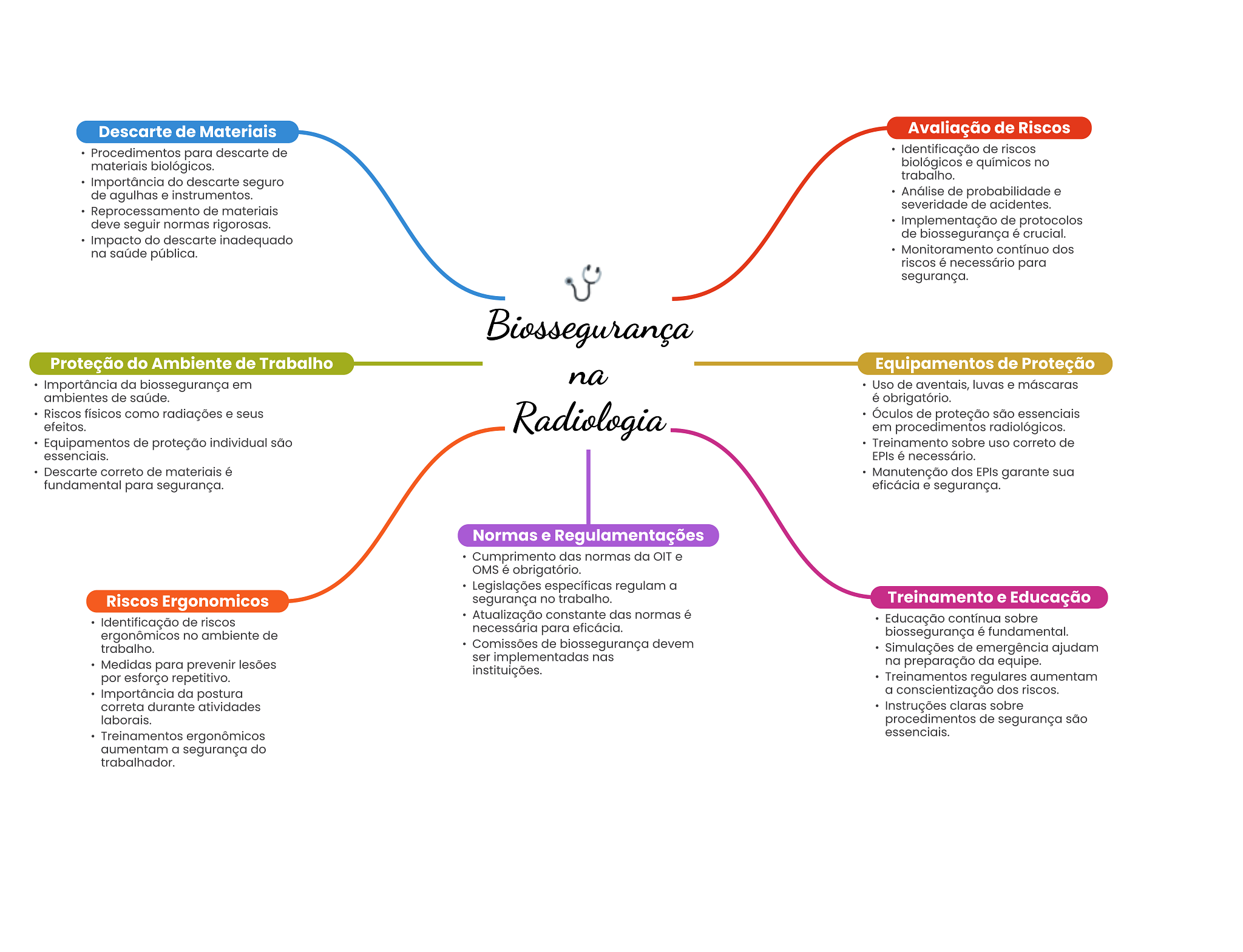 Descarte de Materiais Avaliação de Riscos Procedimentos para descarte de Identificação de riscos materiais biológicos. biológicos e químicos no trabalho. Importância do descarte seguro de agulhas e instrumentos. Análise de probabilidade e severidade de acidentes. Reprocessamento de materiais deve seguir normas rigorosas. Implementação de protocolos Impacto do descarte inadequado de biossegurança é crucial. na saúde pública. Monitoramento contínuo dos riscos é necessário para segurança. Biossegurança Proteção do Ambiente de Trabalho Equipamentos de Proteção Importância da biossegurança em na Uso de aventais, luvas e máscaras ambientes de saúde. é obrigatório. Riscos físicos como radiações e seus Radiologia Óculos de proteção são essenciais efeitos. em procedimentos radiológicos. Equipamentos de proteção individual são Treinamento sobre uso correto de essenciais. EPIs é necessário. Descarte correto de materiais é Manutenção dos EPIs garante sua fundamental para segurança. eficácia e segurança. Normas e Regulamentações Cumprimento das normas da OIT e OMS é obrigatório. Legislações específicas regulam a Riscos Ergonomicos segurança no trabalho. Treinamento e Educação Atualização constante das normas é Identificação de riscos Educação contínua sobre necessária para eficácia. ergonômicos no ambiente de biossegurança é fundamental. trabalho. Comissões de biossegurança devem Simulações de emergência ajudam ser implementadas nas Medidas para prevenir lesões na preparação da equipe. instituições. por esforço repetitivo. Treinamentos regulares aumentam Importância da postura a conscientização dos riscos. correta durante atividades Instruções claras sobre laborais. procedimentos de segurança são Treinamentos ergonômicos essenciais. aumentam a segurança do trabalhador.