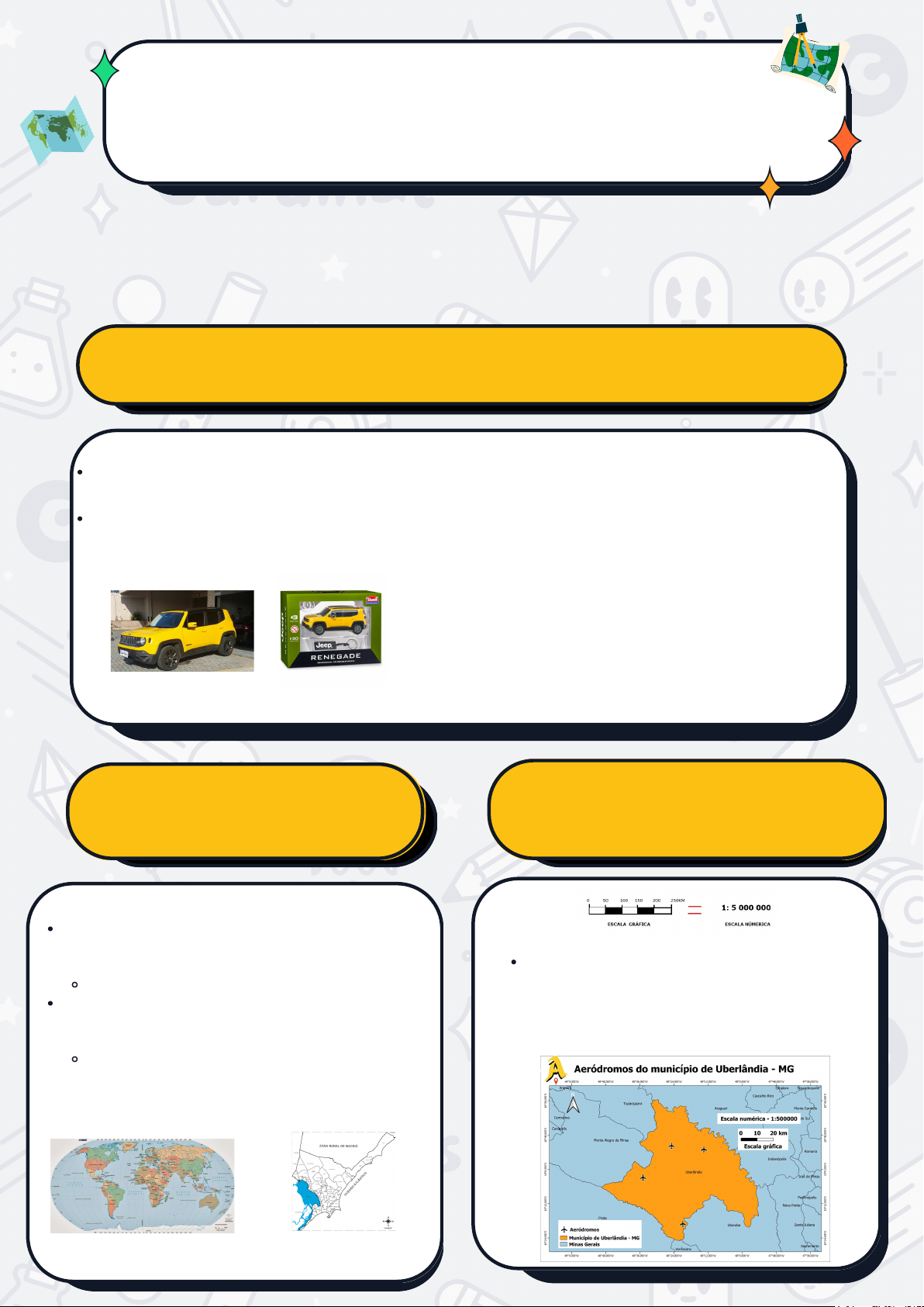 Atividade: Descobrindo a Escala dos Mapas Nome do Aluno(a): _______________________________________ Data:___ /___/____ 6º Ano ________ Turno: ______________ Professora: Juliana Fortunato Componente Curricular: Geografia O que é Escala? Escala é como um "zoom" que nos ajuda a saber quantas vezes o mapa diminuiu o tamanho real das coisas. Mapa Pequeno, Lugar Grande Um mapa é um desenho que mostra um lugar diminuído. A Escala no Mapa Nos mapas, a escala geralmente aparece como um número ou uma barrinha. Pense assim: Quando você tira uma foto do seu brinquedo, ele fica menor na foto, certo? A foto "diminuiu" o seu brinquedo. O mapa faz a mesma coisa com lugares grandes! Escala: Grande ou Pequena? Quando o mapa mostra um lugar muito grande (como o mundo), ele tem poucos detalhes. Dizemos que a escala é PEQUENA. Exemplo A: Mapa-múndi. Quando o mapa mostra um lugar menor (como seu bairro), ele tem muitos detalhes. Dizemos que a escala é GRANDE. Exemplo B: Mapa do bairro. Exemplo: Se a escala for 1:100, quer dizer que 1 centímetro no mapa é igual a 100 centímetros na vida real (ou 1 metro). Vamos viajar pelos mapas e descobrir um segredo? Os mapas são desenhos da Terra, de uma cidade ou de um bairro. Mas, a Terra é muito grande, não é? Para caber no papel, precisamos diminuir o tamanho de tudo. Observe as imagens e marque um X: A miniatura é menor que o carro de verdade. ( ) A miniatura é maior que o carro de verdade. ( ) Carro de verdade Miniatura Circule no mapa onde você encontra a escala! Escala é PEQUENA ( ) Escala é GRANDE ( ) Escala é PEQUENA ( ) Escala é GRANDE ( ) A B Observe os mapas abaixo e marque um X na informação correta.