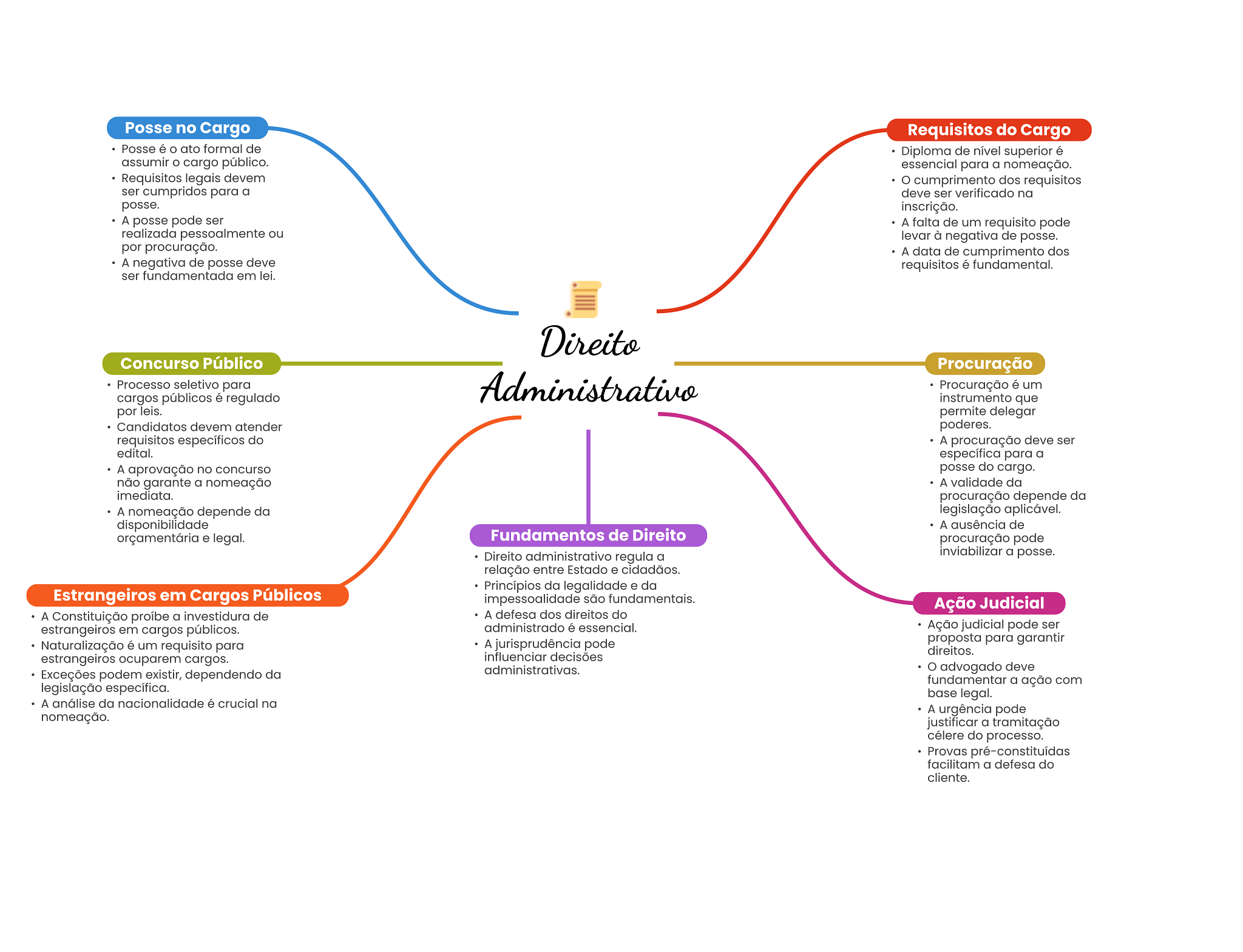 Posse no Cargo Requisitos do Cargo Posse é ato formal de Diploma de nível superior é assumir cargo público. essencial para a nomeação. Requisitos legais devem O cumprimento dos requisitos ser cumpridos para a deve ser verificado na posse. inscrição. A posse pode ser A falta de um requisito pode realizada pessoalmente ou levar à negativa de posse. por procuração. A data de cumprimento dos A negativa de posse deve requisitos é fundamental. ser fundamentada em lei. Direito Concurso Público Procuração Processo seletivo para Administrativo Procuração é um cargos públicos é regulado instrumento que por leis. permite delegar Candidatos devem atender poderes. requisitos específicos do A procuração deve ser edital. específica para a A aprovação no concurso posse do cargo. não garante a nomeação A validade da imediata. procuração depende da A nomeação depende da legislação aplicável. disponibilidade A ausência de orçamentária e legal. Fundamentos de Direito procuração pode Direito administrativo regula a inviabilizar a posse. relação entre Estado e cidadãos. Princípios da legalidade e da Estrangeiros em Cargos Públicos impessoalidade são fundamentais. Ação Judicial A Constituição proíbe a investidura de A defesa dos direitos do estrangeiros em cargos públicos. administrado é essencial. Ação judicial pode ser A jurisprudência pode proposta para garantir Naturalização é um requisito para direitos. estrangeiros ocuparem cargos. influenciar decisões administrativas. advogado deve Exceções podem existir, dependendo da fundamentar a ação com legislação específica. base legal. A análise da nacionalidade é crucial na A urgência pode nomeação. justificar a tramitação célere do processo. Provas pré-constituídas facilitam a defesa do cliente.