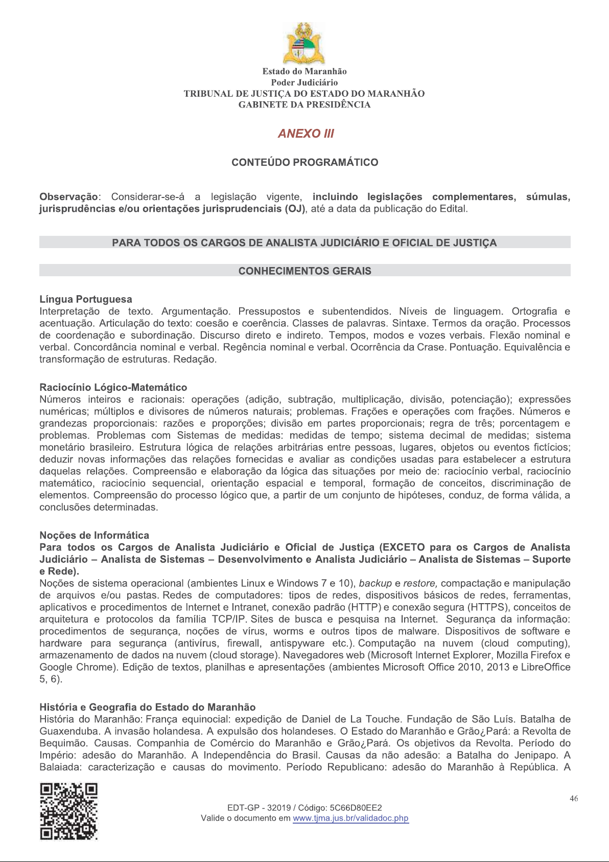 Estado do Maranhão Poder Judiciário TRIBUNAL DE JUSTIÇA DO ESTADO DO MARANHÃO GABINETE DA PRESIDÊNCIA ANEXO III CONTEÚDO PROGRAMÁTICO Observação: Considerar-se-á a legislação vigente, incluindo legislações complementares, súmulas, jurisprudências e/ou orientações jurisprudenciais (OJ), até a data da publicação do Edital. PARA TODOS CARGOS DE ANALISTA JUDICIÁRIO E OFICIAL DE JUSTIÇA CONHECIMENTOS GERAIS Língua Portuguesa Interpretação de texto. Argumentação. Pressupostos e subentendidos. Níveis de linguagem. Ortografia e acentuação. Articulação do texto: coesão e coerência. Classes de palavras. Sintaxe. Termos da oração. Processos de coordenação e subordinação. Discurso direto e indireto. Tempos, modos e vozes verbais. Flexão nominal e verbal. Concordância nominal e verbal. Regência nominal e verbal. Ocorrência da Crase. Pontuação. Equivalência e transformação de estruturas. Redação. Raciocínio Lógico-Matemático Números inteiros e racionais: operações (adição, subtração, multiplicação, divisão, potenciação); expressões numéricas; múltiplos e divisores de números naturais; problemas. Frações e operações com frações. Números e grandezas proporcionais: razões e proporções; divisão em partes proporcionais; regra de três; porcentagem e problemas. Problemas com Sistemas de medidas: medidas de tempo; sistema decimal de medidas; sistema monetário brasileiro. Estrutura lógica de relações arbitrárias entre pessoas, lugares, objetos ou eventos fictícios; deduzir novas informações das relações fornecidas e avaliar as condições usadas para estabelecer a estrutura daquelas relações. Compreensão e elaboração da lógica das situações por meio de: raciocínio verbal, raciocínio matemático, raciocínio sequencial, orientação espacial e temporal, formação de conceitos, discriminação de elementos. Compreensão do processo lógico que, a partir de um conjunto de hipóteses, conduz, de forma válida, a conclusões determinadas. Noções de Informática Para todos os Cargos de Analista Judiciário e Oficial de Justiça (EXCETO para os Cargos de Analista Judiciário Analista de Sistemas Desenvolvimento e Analista Judiciário Analista de Sistemas Suporte e Rede). Noções de sistema operacional (ambientes Linux e Windows 7 e 10), backup e restore, compactação e manipulação de arquivos e/ou pastas. Redes de computadores: tipos de redes, dispositivos básicos de redes, ferramentas, aplicativos e procedimentos de Internet e Intranet, conexão padrão (HTTP) e conexão segura (HTTPS), conceitos de arquitetura e protocolos da família TCP/IP. Sites de busca e pesquisa na Internet. Segurança da informação: procedimentos de segurança, noções de vírus, worms e outros tipos de malware. Dispositivos de software e hardware para segurança (antivírus, firewall, antispyware etc.). Computação na nuvem (cloud computing), armazenamento de dados na nuvem (cloud storage). Navegadores web (Microsoft Internet Explorer, Mozilla Firefox e Google Chrome). Edição de textos, planilhas e apresentações (ambientes Microsoft Office 2010, 2013 e LibreOffice 5, 6). História e Geografia do Estado do Maranhão História do Maranhão: França equinocial: expedição de Daniel de La Touche. Fundação de São Luís. Batalha de Guaxenduba. A invasão holandesa. A expulsão dos holandeses. Estado do Maranhão e Grão¿Pará: a Revolta de Bequimão. Causas. Companhia de Comércio do Maranhão e Grão¿Pará. Os objetivos da Revolta. Período do Império: adesão do Maranhão. A Independência do Brasil. Causas da não adesão: a Batalha do Jenipapo. A Balaiada: caracterização e causas do movimento. Período Republicano: adesão do Maranhão à República. A 46 EDT-GP 32019 / Código: 5C66D80EE2 Valide o documento em www.tjma.jus.br/validadoc.phpEstado do Maranhão Poder Judiciário TRIBUNAL DE JUSTIÇA DO ESTADO DO MARANHÃO GABINETE DA PRESIDÊNCIA mecânica e arquitetura relacionada às edificações e instalações dos tribunais, fóruns e juizados. Acessibilidade a edificações, mobiliário, espaços e equipamentos urbanos, ABNT NBR 9050. Legislação aplicada à economia de recursos naturais e sustentabilidade nas edificações. Normas de segurança do trabalho aplicadas à construção civil. NBR 12721 Custo Unitário Básico. Resoluções 114 do CNJ e 70 do CSJT aplicadas às obras e serviços de engenharia. NBR 5.674 Manutenção de edificações Requisitos para o sistema de gestão de manutenção. Lei n° 8.666/93, lei n° 8.883/94, Decreto n° 7.983/13 e Lei Complementar n° 101 de 4/05/2000 (LRP). Analista Judiciário Assistente Social Questão social e suas expressões no Brasil contemporâneo. Transformações no mundo do trabalho. Fundamentos Teóricos e Metodológicos do Serviço Social nas diferentes linhas interpretativas. Projeto Ético- Político do Serviço Social e Legislação Profissional: Lei de Regulamentação da Profissão; Código de Ética Profissional e Resoluções do Conselho Federal de Serviço Social sobre Exercício Profissional. Dimensão técnico-operativa do serviço social: Concepções sobre instrumentos e técnicas; Entrevista; Visita Domiciliar; Visita Institucional; Ação Socioeducativa com Indivíduos, Família e Grupos; Abordagens individual e coletiva; Estudo Social; Perícia Social; Relatório Social; Laudo Social; Parecer Social. Serviço Social e as instituições: Intersetorialidade, interdisciplinaridade e trabalho em rede. Direitos Sociais e Humanos dos diferentes grupos e segmentos da sociedade brasileira. Estado e políticas sociais: Aspectos teóricos e históricos; capítulo da Ordem Social da Constituição Federal de 1988. Diretrizes atuais das políticas sociais: Democratização, participação social, universalização e matricialidade familiar. Políticas Setoriais aspectos conceituais e normativos: Lei n° 8.212/1991, complementos e alterações (Lei Orgân