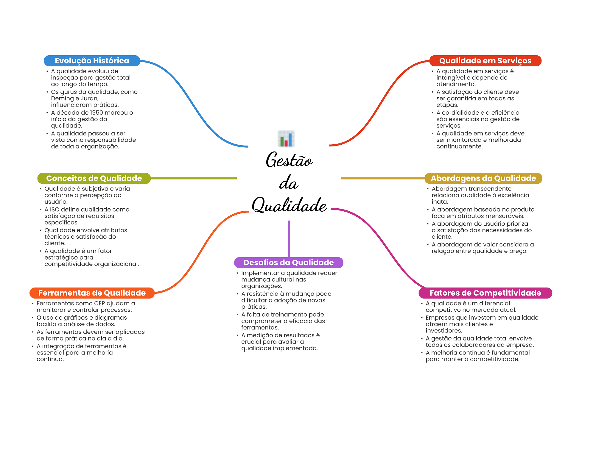 Evolução Histórica Qualidade em Serviços A qualidade evoluiu de A qualidade em serviços é inspeção para gestão total intangível e depende do ao longo do tempo. atendimento. Os gurus da qualidade, como A satisfação do cliente deve Deming e Juran, ser garantida em todas as influenciaram práticas. etapas. A década de 1950 marcou A cordialidade e a eficiência início da gestão da são essenciais na gestão de qualidade. serviços. A qualidade passou a ser A qualidade em serviços deve vista como responsabilidade ser monitorada e melhorada de toda a organização. continuamente. Gestão Conceitos de Qualidade da Abordagens da Qualidade Qualidade é subjetiva e varia Abordagem transcendente conforme a percepção do relaciona qualidade à excelência usuário. A ISO define qualidade como Qualidade inata. A abordagem baseada no produto satisfação de requisitos foca em atributos mensuráveis. específicos. A abordagem do usuário prioriza Qualidade envolve atributos a satisfação das necessidades do técnicos e satisfação do cliente. cliente. A abordagem de valor considera a A qualidade é um fator relação entre qualidade e preço. estratégico para competitividade organizacional. Desafios da Qualidade Implementar a qualidade requer mudança cultural nas organizações. Ferramentas de Qualidade A resistência à mudança pode Fatores de Competitividade Ferramentas como CEP ajudam a dificultar a adoção de novas monitorar e controlar processos. práticas. A qualidade é um diferencial competitivo no mercado atual. uso de gráficos e diagramas A falta de treinamento pode comprometer a eficácia das Empresas que investem em qualidade facilita a análise de dados. atraem mais clientes e ferramentas. As ferramentas devem ser aplicadas investidores. de forma prática no dia a dia. A medição de resultados é crucial para avaliar a A gestão da qualidade total envolve A integração de ferramentas é qualidade implementada. todos colaboradores da empresa. essencial para a melhoria A melhoria contínua é fundamental contínua. para manter a competitividade.