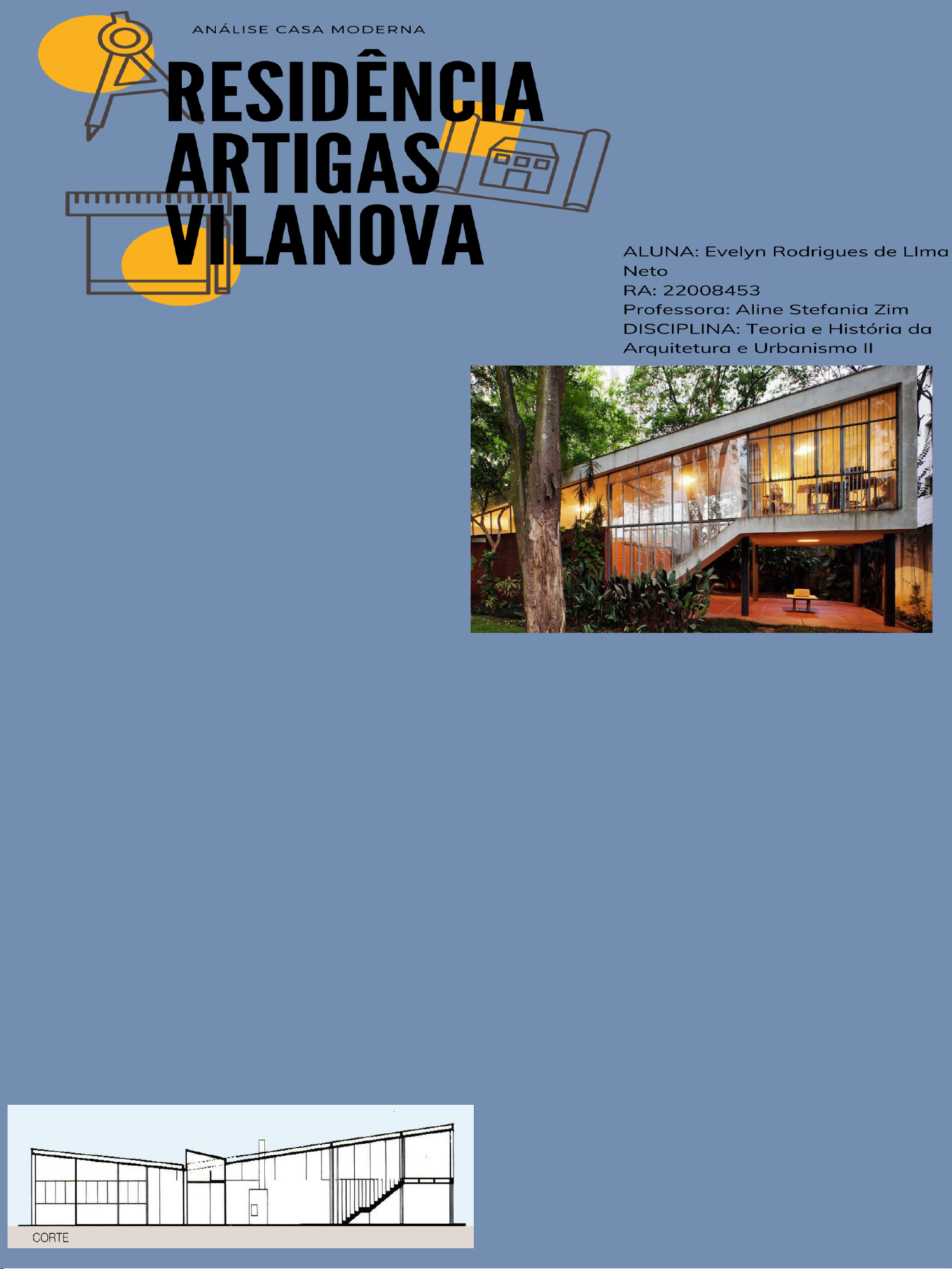 Feito entre os anos de 1948 - 1950 pelo o arquiteto Artigas Vilanova, que usou como base o concreto, ferro e vidro aparente. Projetou e deu vida a uma residência de apenas um pavimentos com 223 m² em um terreno de 1000 m². Localizada na Rua Barão de Jaceguai n.º 1151 - Campo Belo - São Paulo, a residência do arquiteto agora é usada de ponto turístico e conta com um café para os visitantes, o atual proprietário é o filho do arquiteto, quem permitiu o uso da casa como um ponto crucial dos estudantes de arquitetura que querem conhecer as construções dos antigos movimentos. O movimento usado para a casa foi da Escola Paulista, sendo ele o grande precursor do brutalismo no Brasil, deixando claro quais os materiais usados em cada parede da residência e a sua estrutura, apenas mudando a cor mas não mudando sua forma, moderno, usando alguns dos cinco pontos da arquitetura moderna de Le Corbusier, sendo eles: Janelas em fita, Planta livre e Fachada livre, e o conceito orgânico de Frank Lloyd Wright, fez uma casa sem muitas divisões entre os cômodos sociais como, sala, cozinha e sala de jantar, não usou paredes para dividir esses cômodos para que tenha a maior interação da família entre esses cômodos mais usados nas casas. Os quartos não tem uma hierarquia, sendo todos do mesmo tamanho e layout incluindo o quarto da empregada, que muitas vezes era planejado de forma mínima para o conforto. Artigas Vila Novas usou desses conceitos com base no seus ideais socialista, a casa demorou para ser construída porque era usada como ponto de encontro dos mesmos que compartilhavam desses ideais, o que era proibido, por conta do governo da época. Surgiu em um período pós-guerra na década de 1950, ano no qual estava surgindo o brutalismo na Europa. Ambos movimentos faziam o uso da técnica construtiva de concreto armado e faziam questão de deixá-lo aparente. Como dava ênfase na técnica construtiva, esse era o ponto que a diferenciava da escola carioca, que dava mais valor para a questão das belas artes, enquanto a paulista buscava a modernização da arquitetura e isso só seria possível com o abandono dos velhos conceitos da arquitetura. O Brasil na década de 1950, estava passando por mudanças políticas e sociais. Na época em que a casa estava sendo construída o presidente em que estava no poder era Getúlio Vargas, quem vazia a caça aos comunistas e que por muito tempo, os arquitetos brasileiros compactuam da mesma ideologia comunista, pensamento no qual Artigas Vilanova seguia e tentava implantar no país. Sendo esse um dos motivos pelo o qual a residência do arquiteto demorou para ficar pronta, era onde aconteciam as reuniões entre eles e outras influências que compartilhavam dos ideias. Tanto que a casa seguiu esse mesmo pensamento, sem hierarquia, sem quarto de empregada, pois o proletário deve ter sua casa para não morar na casa do patrão. A valorização da estrutura era ponto da Escola Paulista, mostrando o uso de vigas e pilares e como estão sendo usados é valorizado no movimento, o que gerou um aval de críticas em algumas obras, por conta da estética que não era muito agradável. O uso de concreto aparente, é de suma importância para a escola paulista, o objetivo era mostrar o real estado das obras sem revestimentos ou qualquer outro material que fosse usado para "apagar" a verdadeira edificação. Toda a parte esquerda da edificação é escondida pelos muros diagonais da entrada, que é limitada pelos muros da garagem. Após a entrada na edificação vê a parte interessante da estrutura, no mesmo nível que o pilotis está a parte do edifício que engloba a cozinha, sala, banheiro comum, quartos e sala de jantar, no nível acima do pilotis fica o escritório, que tem um acesso divido entre dois lances de escada com um patamar de descanso entre elas. A edificação é um grande retângulo assimétrico de 27 metros de comprimento com 6 metros de largura, e todos os elementos da construção externos contribuem para a essa forma ser linear e assimétrica ao mesmo tempo. Todas as paredes da construção, foi usada tijolos maciços que foram pintados sem nenhum reboco ou qualquer outro material usado em superfícies para não “apagar” o seu verdadeiro estado. As cores das pinturas da casa escolhidas pelo o arquiteto tiveram base no branco, vermelho e azul, outros elementos foram usados tons mais fechados. Dessa forma a harmonia entre os cômodos é feita e bem distribuída, deixando a casa mais orgânica. Pela a setorização da casa podemos ver como a forma e o conceito em que Artigas, queria aplicar e todas as outras obras. A residência do arquiteto foi um grande experimento para todos os seus novos ideais de arquitetura. Tendo em mente o modo em que os dormitórios não deveriam ser hierarquizados, a quebra das divisões das áreas comuns, como: sala, cozinha e sala de jantar, ajudam na compreensão da forma da família junta e os quartos usados apenas para suas particularidades sem que a família ficasse em segundo plano. João Batista Artigas Vilanova, nasceu no dia 23 de Junho do ano de 1915, na capital do Paraná, Curitiba. Sua arquitetura foi moldada com os princípios da Escola Paulista, movimento no qual focava na valorização da estrutura e dava ênfase na técnica construtiva. A maioria dos seus projetos eram focados na harmonia do estado natural dos materiais com a natureza. Faleceu no ano de 1985, em São Paulo. Foi um grande precursor da Escola Paulista e uma grande influência no nome da arquitetura brasileira. Como o terreno é grande, essa edificação é conhecida como a segunda residência do arquiteto, a primeira chamada de Casinha, foi feita no ano de 1942. Ambas as casas foram projetadas em momentos em que as políticas públicas estavam sendo reformadas ou sofrendo mudanças por meio da população. Formou-se em engenharia e arquitetura pela Escola Politécnica da Universidade de São Paulo no ano de 1937. Foi estagi