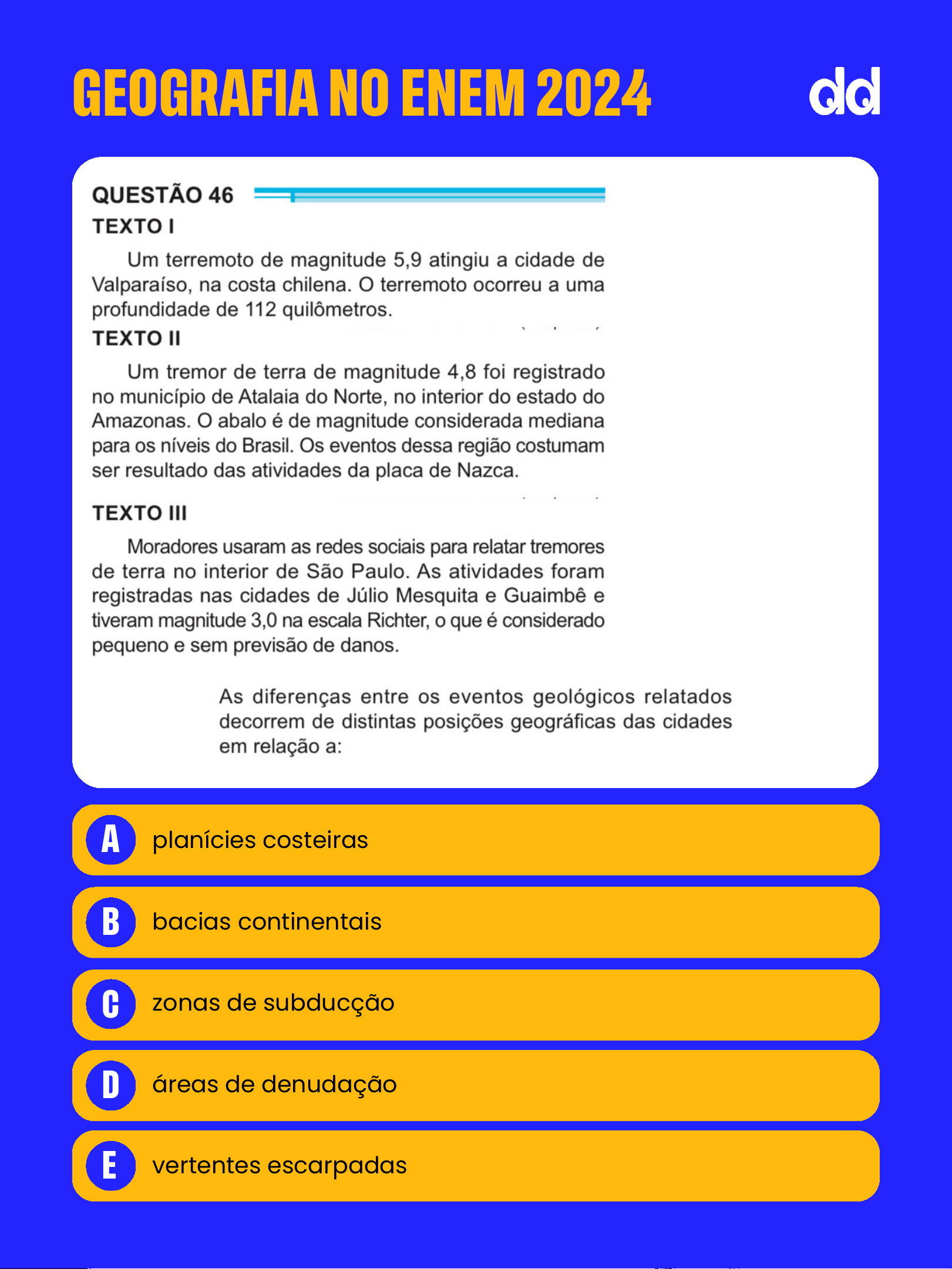 GEOGRAFIA NO ENEM 2024 A B C D E planícies costeiras zonas de subducção bacias continentais áreas de denudação vertentes escarpadas GEOGRAFIA NO ENEM 2024 A B C D E flexibilização de parâmetros ambientais fragilização de vínculos afetivos consolidação de identidades regionais supressão de práticas exploratórias recuperação de tradições ancestrais GEOGRAFIA NO ENEM 2024 A B C D E variabilidade solar anual declividade do relevo local temperatura média mensal dinâmica tectônica regional gradação da turbidez fluvial GEOGRAFIA NO ENEM 2024 A B C D E desindustrialização da economia concentração da produção desregulamentação do mercado distribuição de renda dinamização dos fluxos GEOGRAFIA NO ENEM 2024 A B C D E circulação de ventos alísios média de temperatura oceânica aquecimento dos solos locais índice de refletividade superficial intensidade de chuvas convectivas GEOGRAFIA NO ENEM 2024 A B C D E preservação de espaços naturais revalorização de culturas reprimidas emancipação de sujeitos marginais inversão de hierarquias estabelecidas sustentação de hegemonias territoriais GEOGRAFIA NO ENEM 2024 A B C D E organização de rotas de fuga na floresta tropical divulgação de receitas de fármacos nas zonas ribeirinhas criação de postos de trabalho nos seringais nortistas construção de redes de sociabilidade no interior brasileiro ampliação de ambientes de lazer nos territórios autóctones GEOGRAFIA NO ENEM 2024 A B C D E derrame de lava vulcânica acão do intemperismo químico encontro de placas tectônicas sedimentação de erosão eólica derretimento de geleiras glaciais GEOGRAFIA NO ENEM 2024 A B C D E consevação de lugares afetivos redefinição de fronteiras nacionais aumento de áreas desertificadas artificialização do espaço geográfico mudança da dinâmica macroclimática GEOGRAFIA NO ENEM 2024 A B C D E criação de faixas sinalizadoras implantação de parques públicos incineração de resíduos sólidos verticalização de espaços centrais construção de estacionamentos privados GEOGRAFIA NO ENEM 2024 A B C D E promover a ocupação rural descentralizar a gestão pública favorecer a liberdade religiosa incentivar a pluralidade cultural assegurar a integridade territorial GEOGRAFIA NO ENEM 2024 A B C D E manejo tradicional conscumo consciente reciclagem residual exploração predatória reaproveitamento energético GEOGRAFIA NO ENEM 2024 A B C D E concervação do meio rural interferéncia do espaço geográfico crescimendo da vegetação ciliar equilíbrio do ambiente das cidades controle da proliferação dos animais GEOGRAFIA NO ENEM 2024 A B C D E flexibilização legal da prática de aborto crescimento dos casos de gravidez precoce envelhecimento da população brasileira participação feminina no mercado de trabalho diminuição dos benefícios na licença-maternidade GEOGRAFIA NO ENEM 2024 A B C D E elevação da biomassa diminuição da fertilidade redução da salinização ampliação da microfauna decomposição do substrato GEOGRAFIA NO ENEM 2024 A B C D E ocupação de lugares ociosos valorização do mercado externo densificação da área central priorização de insumos químicos mecanização de técnicas de cultivo GEOGRAFIA NO ENEM 2024 A B C D E adoção do dumping comercial criação de holding empresarial fusão da função administrativa limitação do mercado monopolista modernização da produção industrial GEOGRAFIA NO ENEM 2024 A B C D E expandir o transporte marítimo monitorar as atividades vulcânicas incentivar os fluxos migratórios controlar as emissões de carbono priorizar a utilização de termoelétricas GEOGRAFIA NO ENEM 2024 A B C D E obsolescência associada ao uso da tecnologia alienação decorrente da organização do trabalho orientação voltada à administração de conflitos isonomia remanescente da geração de riquezas produtividade vinculada ao fortalecimento da autonomia