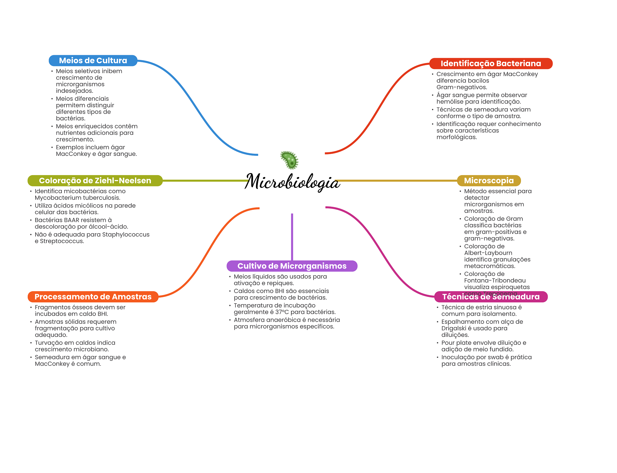 Meios de Cultura Identificação Bacteriana Meios seletivos inibem crescimento de Crescimento em ágar MacConkey diferencia bacilos microrganismos Gram-negativos. indesejados. Meios diferenciais Ágar sangue permite observar permitem distinguir hemólise para identificação. diferentes tipos de Técnicas de semeadura variam bactérias. conforme tipo de amostra. Meios enriquecidos contêm Identificação requer conhecimento nutrientes adicionais para sobre características crescimento. morfológicas. Exemplos incluem ágar MacConkey e ágar sangue. Coloração de Ziehl-Neelsen Microbiologia Microscopia Identifica micobactérias como Método essencial para Mycobacterium tuberculosis. detectar Utiliza ácidos micólicos na parede microrganismos em celular das bactérias. amostras. Bactérias BAAR resistem à Coloração de Gram descoloração por álcool-ácido. classifica bactérias Não é adequada para Staphylococcus em gram-positivas e e Streptococcus. gram-negativas. Coloração de Albert-Laybourn identifica granulações Cultivo de Microrganismos metacromáticas. Meios líquidos são usados para Coloração de Fontana-Tribondeau ativação e repiques. visualiza espiroquetas Caldos como BHI são essenciais Processamento de Amostras para crescimento de bactérias. Técnicas de Semeadura Fragmentos ósseos devem ser Temperatura de incubação Técnica de estria sinuosa é incubados em caldo BHI. geralmente é 37°C para bactérias. comum para isolamento. Amostras sólidas requerem Atmosfera anaeróbica é necessária Espalhamento com alça de fragmentação para cultivo para microrganismos específicos. Drigalski é usado para adequado. diluições. Turvação em caldos indica Pour plate envolve diluição e crescimento microbiano. adição de meio fundido. Semeadura em ágar sangue e Inoculação por swab é prática MacConkey é comum. para amostras clínicas.