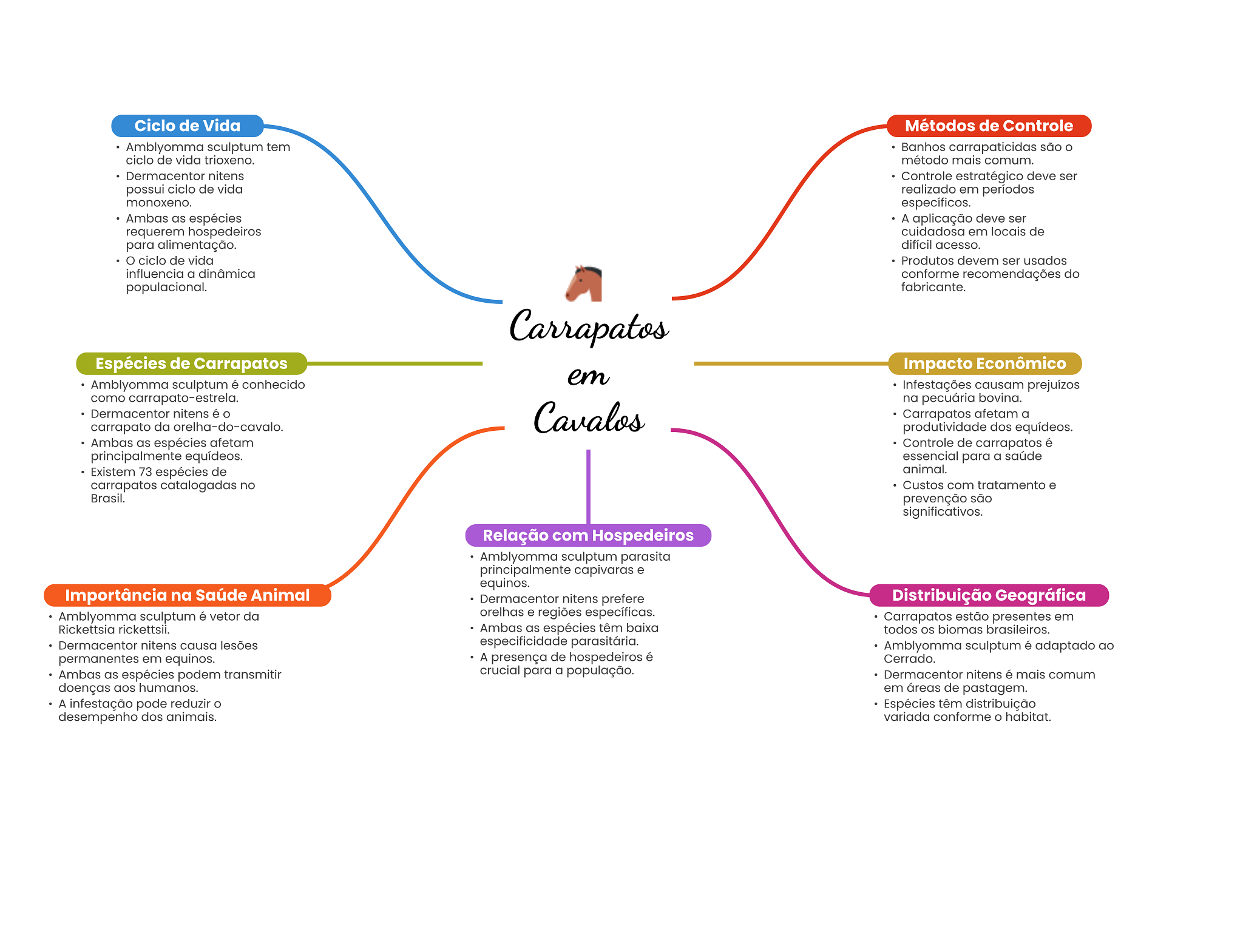 Ciclo de Vida Métodos de Controle Amblyomma sculptum tem Banhos carrapaticidas são ciclo de vida trioxeno. método mais comum. Dermacentor nitens Controle estratégico deve ser possui ciclo de vida realizado em períodos monoxeno. específicos. Ambas as espécies A aplicação deve ser requerem hospedeiros cuidadosa em locais de para alimentação. difícil acesso. ciclo de vida Produtos devem ser usados influencia a dinâmica conforme recomendações do populacional. fabricante. Carrapatos Espécies de Carrapatos Impacto Econômico em Amblyomma sculptum é conhecido Infestações causam prejuízos como carrapato-estrela. na pecuária bovina. Dermacentor nitens é O carrapato da orelha-do-cavalo. Cavalos Carrapatos afetam a produtividade dos equídeos. Ambas as espécies afetam Controle de carrapatos é principalmente equídeos. essencial para a saúde Existem 73 espécies de animal. carrapatos catalogadas no Custos com tratamento e Brasil. prevenção são significativos. Relação com Hospedeiros Amblyomma sculptum parasita principalmente capivaras e equinos. Importância na Saúde Animal Dermacentor nitens prefere Distribuição Geográfica Amblyomma sculptum é vetor da orelhas e regiões específicas. Carrapatos estão presentes em Rickettsia rickettsii. Ambas as espécies têm baixa todos OS biomas brasileiros. Dermacentor nitens causa lesões especificidade parasitária. Amblyomma sculptum é adaptado ao permanentes em equinos. A presença de hospedeiros é Cerrado. Ambas as espécies podem transmitir crucial para a população. Dermacentor nitens é mais comum doenças aos humanos. em áreas de pastagem. A infestação pode reduzir Espécies têm distribuição desempenho dos animais. variada conforme O habitat.