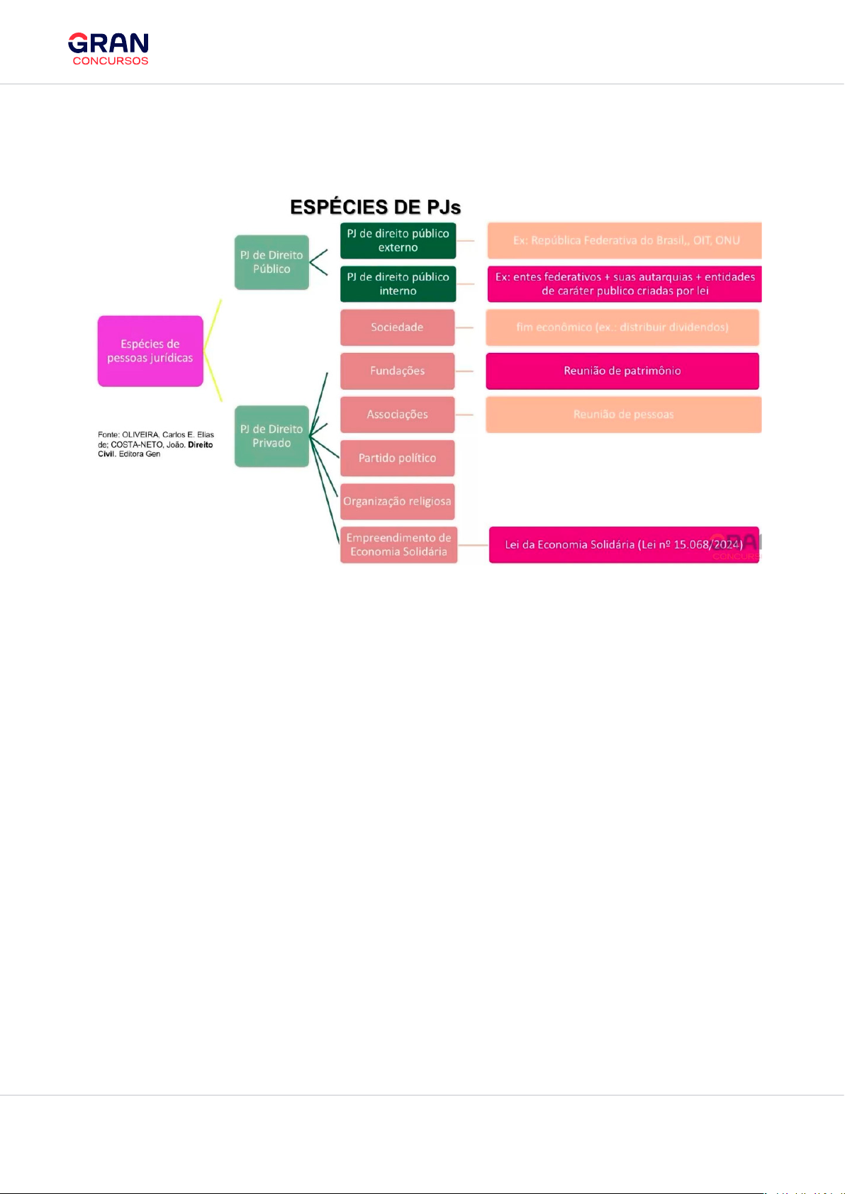 1 de 11gran.com.br Parte Geral – Adicional II DIREITO CIVIL PARTE GERAL – ADICIONAL II O Código civil lista quais são as pessoas jurídicas (arts. 41 e 44, CC), que podem ser de direito público ou de direito privado. As pessoas jurídicas de direito público possuem poderes que decorrem do direito público como um todo e podem ser subdivididas em duas espécies: externo e interno. PJ de Direito Público • PJ de direito público externo: regida por direito internacional público. Ex.: República Federativa do Brasil, e os outros estados estrangeiros soberanos, como os Estados Unidos da América, República Fundamentalista do Irã, entre outros. Além desses, há os organismos internacionais, como a ONU, a OIT, a Santa Sé. − São regidos por outras regras (em princípio nascem por uma constituição, no caso dos estados soberanos, ou por tratados internacionais, no casos de organismos internacionais). Obs.: o ato de criar uma constituição não necessariamente cria um estado; para isso, deve haver reconhecimento internacional. • PJ de direito público interno: são assim chamados por estarem dentro do território brasileiro. Ex.: entes federativos (União, estados, municípios e DF) + suas respectivas autarquias. Dentro do conceito de autarquia, também estão as associações públicas https://www.gran.com.br https://www.gran.com.br 2 de 11gran.com.br Parte Geral – Adicional II DIREITO CIVIL (disciplinada na Lei n. 11.107), as agências reguladoras e as entidades de caráter público criadas por lei (mencionadas no art. 44, CC). − A criação das pessoas jurídicas de direito público interno ocorre pela Constituição Federal ou por lei. Elas possuem "super-poderes" e somente lei pode dá-los. Exemplo de poderes: de polícia, normativo. PJ de Direito Privado (ART. 44, CC) • Criação ocorre por meio do registro no órgão competente do ato constitutivo, que pode ser um contrato social ou estatuto social (art. 45, CC). Considera-se órgão competente a junta comercial ou o cartório de registro civil de pessoas jurídicas; e a OAB, no caso de sociedade de advogados. Obs.: registro no TSE para partidos políticos não cria pessoa jurídica, trata-se apenas de um alvará de funcionamento eleitoral. Será registrado no TSE somente após o registro no cartório de registro civil de pessoas jurídicas. • Pessoas jurídicas de direito privado não possuem "super-poderes". • Em algumas hipóteses é necessário lei para autorização de criação, como, por exemplo, empresas públicas e sociedade de economia mista. Deve haver uma lei para autorizar a criação, mas a criação propriamente se dá com o registro do ato constitutivo, que pode ser um contrato social ou estatuto social. • O art. 44 lista as pessoas jurídicas de direito privado: − Sociedade: união de pessoas para fins econômicos (distribuição de dividendos); − Associações: que faz uma reunião de pessoas sem fins econômicos (quando não há interesse na distribuição de dividendos); − Fundações: trata-se de patrimônio destinado à uma finalidade não econômica, somente para os fins listados no art. 62 do Código Civil. Exemplo: recurso deixado para a criação de uma fundação de amparo às crianças carentes, que será fiscalizado pelo Ministério Público; − Partidos políticos (há uma lei especial que trata sobre os partidos políticos); − Organização religiosa: é um tipo de pessoa jurídica própria e pode ter maior liberdade. Abrange igrejas evangélicas, terreiros, mesquitas, etc. Obs.: Não abrange a igreja católica, já que esta tem uma personalidade jurídica sui generis. Há um tratado internacional feito com o Vaticano que dá uma característica diferente. As arquidioceses possuem CNPJ que podem figurar em contratos. − Empreendimento de Economia Solidária (EES): trata-se de uma pessoa jurídica criada pela Lei da Economia Solidária (Lei n. 15.068/2024), também conhecida como Lei Paul Singer. Há debates teóricos para definir se trata-se de pessoa jurídica ou não. https://www.gran.com.br https://www.gran.com.br 3 de 11gran.com.br Parte Geral – Adicional II DIREITO CIVIL Obs.: Em princípio, a ideia da mpreendimento de Economia Solidária é uma pessoa jurídica criada para exercer o que se chama de Economia Solidária. Trata-se da ideia de vários trabalhadores se unirem e serem donos dos meios de produção para ganhar dinheiro. Na prática, o empreendimento de Economia Solidária já era exercido pelas sociedades cooperativas. No entanto, para fins de prova, deve-se considerar o texto da lei, e segundo o art. 44 do Código Civil, o EES é pessoa jurídica de direito privado. DESCONSIDERAÇÃO DA PERSONALIDADE JURÍDICA TEORIA MAIOR • É a regra geral (art. 50 do CC). − A lei pode pedir suspensão temporária da autonomia patrimonial da pessoa jurídica, ou seja, é poder penhorar bens do sócio ou do administrador por dívida da pessoa jurídica, nos casos em que tiver os requisitos da desconsideração. • Requisitos (ao menos um dos seguintes requisitos), tem que ter abuso da personalidade jurídica, mas não é qualquer abuso. − Confusão patrimonial (teoria maior objetiva), como quando a pessoa jurídica, paga os boletos bancários de dívidas pessoais do sócio, reiteradamente. − Desvio de finalidade (teoria maior subjetiva), que é quando se usa a pessoa jurídica para causar danos a credores com o objetivo de dar calote. TEORIA MENOR • É exceção e tem de ser prevista em lei específica ou, no caso de dívidas trabalhistas, em princípio constitucional. O TST aplica na prática para dívidas trabalhistas. • Requisito − Basta o mero inadimplemento da dívida. Não é necessário provar confusão patrimonial nem desvio de finalidade. • Casos de dívidas: − Perante consumidor (art. 28, § 5º, CDC). − Decorrentes de danos ambientais (art. 4º, Lei n. 9.605/1998). − Trabalhistas ( jurisprudência do TST, que aplica, por analogia