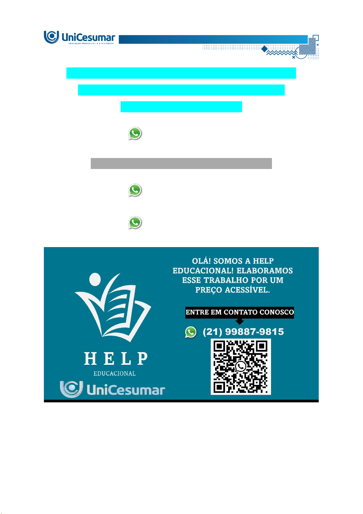 ATIVIDADE 1 – EDU – EDUCAÇÃO FÍSICA NA ED. INFANTIL E NOS ANOS INICIAIS DO ENSINO FUNDAMENTAL - 51_2026 (21) 99887-9815 ASSESSORIA NOS SEUS TRABALHOS (21) 99887-9815 (21) 99887-9815 Para a BNCC, na educação infantil, as interações e a brincadeira são consideradas os eixos estruturantes das aprendizagens e do desenvolvimento das crianças, com o objetivo de garantir-lhes os direitos de conviver, brincar, participar, explorar, ex- pressar-se e conhecer-se. Dessa forma, as demandas curriculares para a educação de zero a cinco anos são organizadas com base em cinco campos de experiências, sendo eles, 1. O eu, o outro e o nós; 2. Corpo, gestos e movimentos; 3. Traços, sons, cores e formas; 4. Escuta, fala, pensamento e imaginação; e 5. Espaços, tempos, quantidades, relações e transformações. Esses campos de experiên- cias, constituem um arranjo curricular que acolhe as situações e as experiências concretas da vida cotidiana das crianças e seus saberes, entrelaçando-os aos co- nhecimentos que fazem parte do patrimônio cultural (SILVEIRA, 2022). SILVEIRA, Juliano. Educação física, educação infantil e BNCC: refletindo sobre pos- síveis expectativas curriculares. In: Revista Pensar a Prática. V25, 2022. Diante disso, realize a leitura do artigo intitulado de “Educação física, educação infantil e BNCC: refletindo sobre possíveis expectativas curriculares” disponí- vel em MATERIAL DA DISCIPLINA. Após a leitura e baseado nesse material responda: Tomando como base todos os cincos campos de experiências (1. O eu, o outro e o nós; 2. Corpo, gestos e movi- mentos; 3. Traços, sons, cores e formas; 4. Escuta, fala, pensamento e imaginação; e 5. Espaços, tempos, quantidades, relações e transformações), como a Educação Física poderia desenvolver ações pedagógicas contemplando seus elementos, vi- sando uma coerência com as demandas curriculares específicas da educação infan- til? OLÁ! SOMOS A HELP EDUCACIONAL! ELABORAMOS ESSE TRABALHO POR UM PREÇO ACESSÍVEL. ENTRE EM CONTATO CONOSCO (21) 99887-9815
