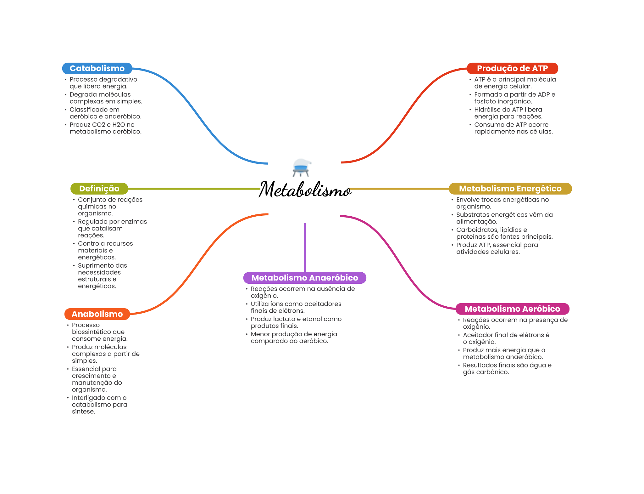 Catabolismo Produção de ATP Processo degradativo ATP é a principal molécula que libera energia. de energia celular. Degrada moléculas Formado a partir de ADP e complexas em simples. fosfato inorgânico. Classificado em Hidrólise do ATP libera aeróbico e anaeróbico. energia para reações. Produz CO2 e H2O no Consumo de ATP ocorre metabolismo aeróbico. rapidamente nas células. Definição Metabolismo Metabolismo Energético Conjunto de reações Envolve trocas energéticas no químicas no organismo. organismo. Substratos energéticos vêm da Regulado por enzimas alimentação. que catalisam Carboidratos, lipídios e reações. proteínas são fontes principais. Controla recursos Produz ATP, essencial para materiais e atividades celulares. energéticos. Suprimento das necessidades estruturais e Metabolismo Anaeróbico energéticas. Reações ocorrem na ausência de oxigênio. Utiliza ions como aceitadores finais de elétrons. Metabolismo Aeróbico Anabolismo Produz lactato e etanol como Reações ocorrem na presença de Processo produtos finais. oxigênio. biossintético que Menor produção de energia Aceitador final de elétrons é consome energia. comparado ao aeróbico. O oxigênio. Produz moléculas Produz mais energia que complexas a partir de metabolismo anaeróbico. simples. Resultados finais são água e Essencial para crescimento e gás carbônico. manutenção do organismo. Interligado com O catabolismo para