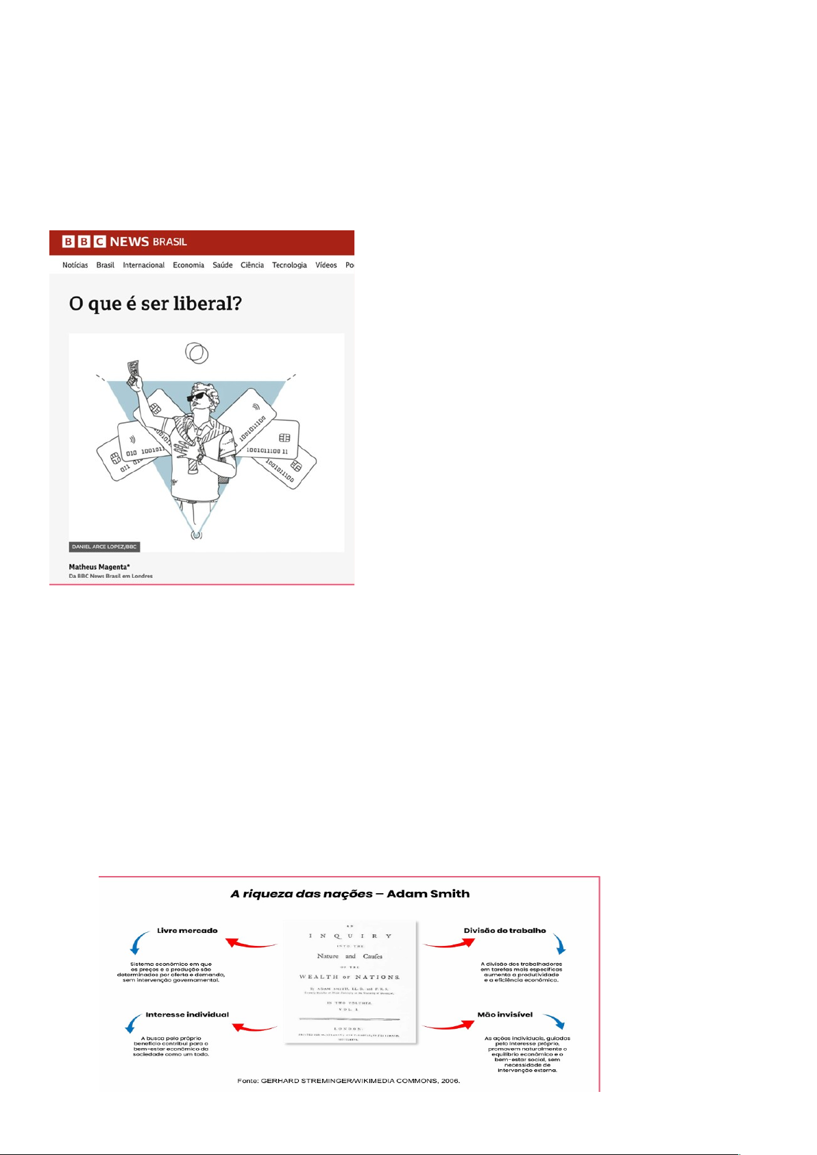 1º bimestre Ensino Fundamental: Aula 2 Anos Finais ●Conteúdos: O pensamento de Adam Smith; ● O liberalismo econômico. ●Objetivos: identificar os ideais do liberalismo econômico defendidos por Adam Smith e suas permanências na contemporaneidade. Para começar: Observe a matéria publicada pela BBC Brasil em 2022 para debater as questões a seguir: • Descreva a imagem que ilustra a matéria. Como as figuras podem estar relacionadas a ser liberal? LIBERDADE INDIVIDUAL – LI-BER-DA-DE IN-DI-VI-DU-AL ESTADO DE DIREITO – ES-TA-DO DE DI-REI-TO VARIAÇÃO – VA- RI-A- ÇÃO · O LIBERALISMO CONTEXTO ILUMINISMO DEFENDIA A LIBERDADE INDIVIDUAL OPUNHA-SE AO CONTROLE ESTATAL image1.png image2.png