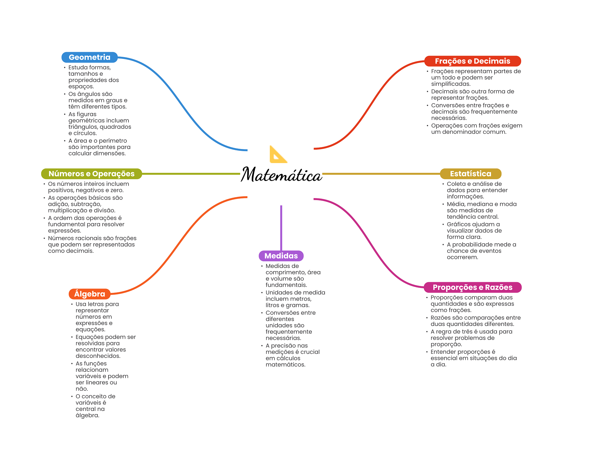 Geometria Frações e Decimais Estuda formas, tamanhos e Frações representam partes de propriedades dos um todo e podem ser espaços. simplificadas. Os ângulos são Decimais são outra forma de medidos em graus e representar frações. têm diferentes tipos. Conversões entre frações e As figuras decimais são frequentemente geométricas incluem necessárias. triângulos, quadrados Operações com frações exigem e círculos. um denominador comum. A área e perímetro são importantes para calcular dimensões. Números e Operações Matemática Estatística Os números inteiros incluem Coleta e análise de positivos, negativos e zero. dados para entender As operações básicas são informações. adição, subtração, Média, mediana e moda multiplicação e divisão. são medidas de A ordem das operações é tendência central. fundamental para resolver Gráficos ajudam a expressões. visualizar dados de Números racionais são frações forma clara. que podem ser representadas A probabilidade mede a como decimais. chance de eventos Medidas ocorrerem. Medidas de comprimento, área e volume são fundamentais. Proporções e Razões Álgebra Unidades de medida incluem metros, Proporções comparam duas Usa letras para litros e gramas. quantidades e são expressas representar Conversões entre como frações. números em diferentes Razões são comparações entre expressões e unidades são duas quantidades diferentes. equações. frequentemente A regra de três é usada para Equações podem ser necessárias. resolver problemas de resolvidas para A precisão nas proporção. encontrar valores medições é crucial Entender proporções é desconhecidos. em cálculos essencial em situações do dia As funções matemáticos. a dia. relacionam variáveis e podem ser lineares ou não. conceito de variáveis é central na álgebra.