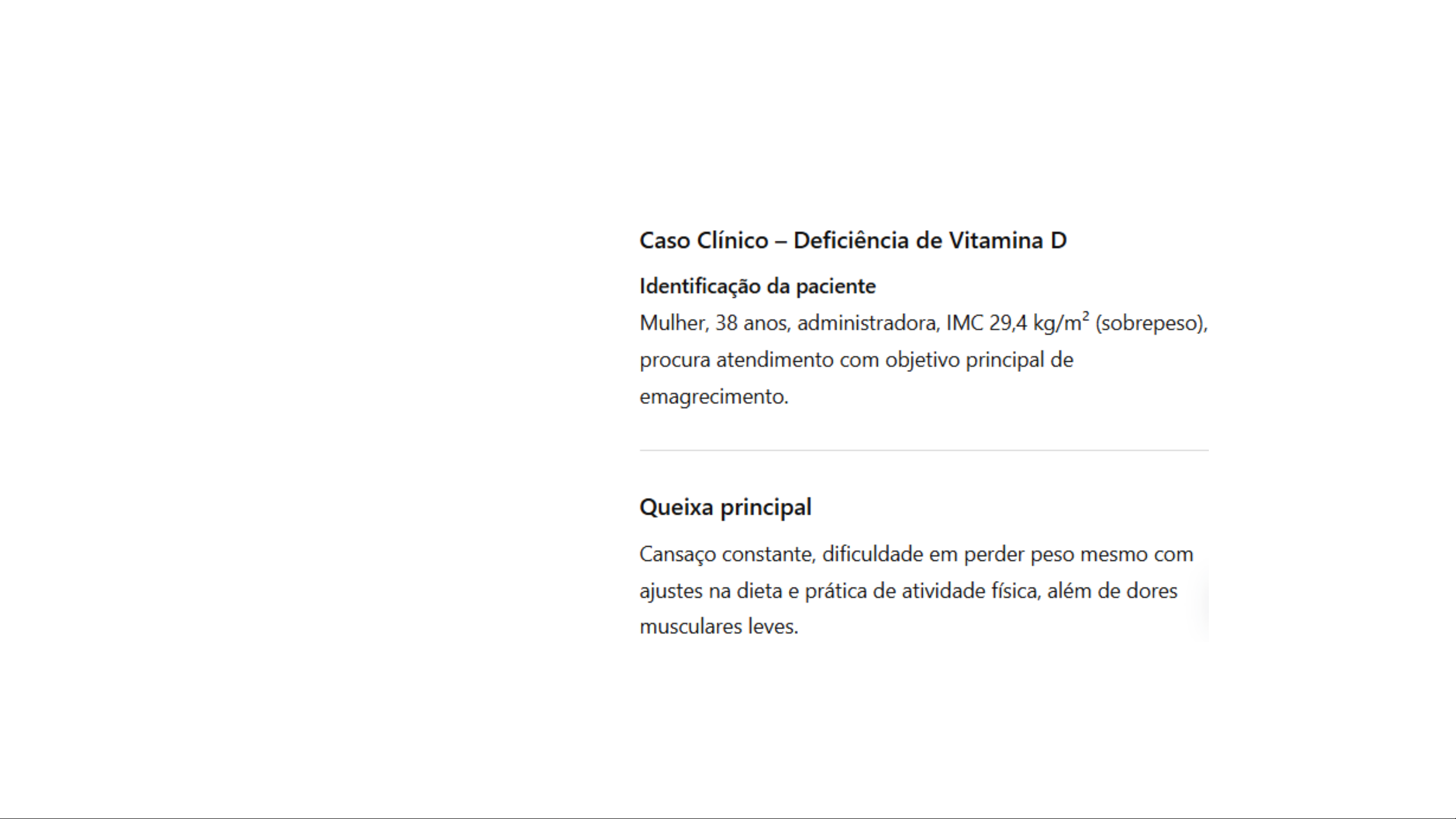 21,4 x 100 = 2140 UI/dia 15 x 100 = 1500 UI/dia Por que pode haver deficiência de Vitamina D no paciente com excesso de gordura corporal? Por que pode haver deficiência de Vitamina D no paciente com excesso de gordura corporal? Por que pode haver deficiência de Vitamina D no paciente com excesso de gordura corporal? Por que pode haver deficiência de Vitamina D no paciente com excesso de gordura corporal?