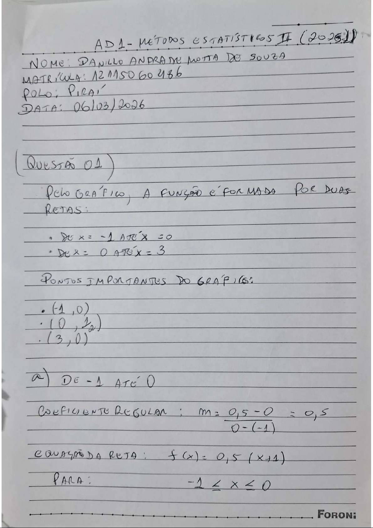 AD1- METODOS II NOME: DANILLO MOTTA SOUZA DATA: 06/03/2026 QUESTÃO Pew A POR DUAS -1 = = 3 PONTOS Do Co: (-1 0) 12) (3,0) a) 0 REGULAR : = = 0,5 o, (-1) RETA : f 0,5 ( FORON:0 3 : m = 2 6 3-0 f(x) = 0,5 6 PARA: 3 / 0,5 COMPLETA : POSTA) 0,5 O, CASO CONTRA'RIO b) E f(2) f(-0,5) PRIMETRO = = = 0,25,, RESPOSTA f(2) 6 1 = 0,1667 12 1 611c) P > - 0,5) PRIMEIR L - -0,5 L - = 2 ) 0,5 (x + 1) = + F (- 0,5) = 0,25 ) + 0,5 -0,5) F (- 0,5) = 0,25 18 75 0,25(1) + 0,5 (-1) F(-1)= 0,25 - 0,25 P ≤ - 0,5) - 1875 - (- P (x ≤-0,5) ≤ = 1 16 FORON:= - 1 16 1 - 5) O, 9375, 16 O, 9375 X - PROBABILIDADE = AQUI: = 0,5 LoGo: P (x ) 2 / - J 0,5) CAL N 1 6 dx FORON:- 6 )dx = 5x x - 12 x 2 = 1,5 - 9 = 12 F(2) = 1 = 0,6667 12 >2) = 0,75 - 0,6667 0833= = 1 12 1 15 16 ENTAO: Plx>2 X - 0,5) = 1/12 15/16 x 16 12 15 = 4 45 FORON:ENCONTRAR C TAL Que P (x c) = 0125 : = (0, 5 - 6 ) dx - 12 - F 0,25 (0, - (2) = 25 12 0,5 12 MULTIBLI CANAO POR FINAL: 2 C= = ± V121 2 C= V31 to 1A 1,27 FORON:02) XNU a) UNIFORME): 1 b-a 1 212-208 1 f(x) = 2085x 1 RETA HORIZON. TAL EM 0,25 208 212. FORON:b) COMPRIMENTO = atb 2 = 2 = mm/ LD 220 m 209) = 209-208 = 1 4 PNUMERADOR: = 210 209 N 4 1 4 = 210 - 208 4 4 ENTAO: 1/4 015 RESPOSTA, = 1/2 PARA 90% > = = 0,1 V- 208 : - 4 V = - 208 = 0,4 -D POSTA FORONRESPOSTAS FINAIS: (QUESTÃO 01) a) FUNÇÃO POR PARTUS 1 1 6 o, 9375 To 45 1,27 ( Ques 02) 1/1 4 [208 212] b) 210mm 0,25 d) 05 V: 208, 4 mm FORON: