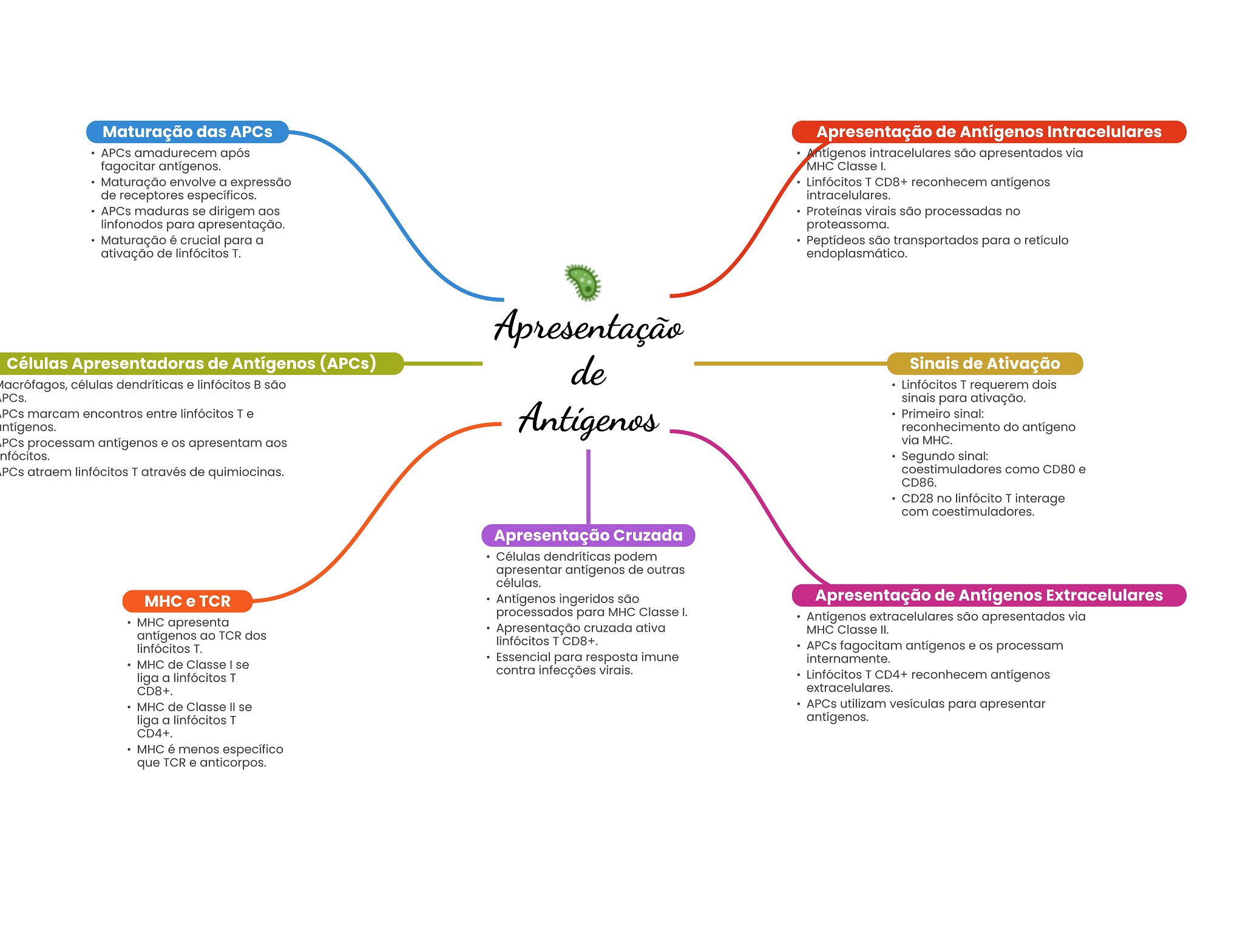 Maturação das APCs Apresentação de Antígenos Intracelulares APCs amadurecem após Antígenos intracelulares são apresentados via fagocitar antígenos. Classe I. Maturação envolve a expressão Linfócitos T CD8+ reconhecem antígenos de receptores específicos. intracelulares. APCs maduras se dirigem aos Proteínas virais são processadas no linfonodos para apresentação. proteassoma. Maturação é crucial para a Peptídeos são transportados para retículo ativação de linfócitos T. endoplasmático. Apresentação Células Apresentadoras de Antígenos (APCS) de Sinais de Ativação Macrófagos, células dendríticas e linfócitos são Linfócitos T requerem dois PCs. sinais para ativação. PCs marcam encontros entre linfócitos T e intígenos. Antigenos Primeiro sinal: reconhecimento do antígeno PCs processam antígenos e apresentam aos via MHC. nfócitos. Segundo sinal: PCs atraem linfócitos T através de quimiocinas. coestimuladores como CD80 e CD86. CD28 no linfócito T interage com coestimuladores. Apresentação Cruzada Células dendríticas podem apresentar antígenos de outras células. MHC e TCR Antígenos ingeridos são Apresentação de Antígenos Extracelulares processados para MHC Classe I. MHC apresenta Antígenos extracelulares são apresentados via Apresentação cruzada ativa MHC Classe II. antígenos ao TCR dos linfócitos T CD8+. linfócitos T. APCs fagocitam antígenos e processam Essencial para resposta imune internamente. de Classe se contra infecções virais. liga a linfócitos T Linfócitos T CD4+ reconhecem antígenos CD8+. extracelulares. MHC de Classe se APCs utilizam vesículas para apresentar liga a linfócitos T antígenos. CD4+. MHC é menos específico que TCR e anticorpos.