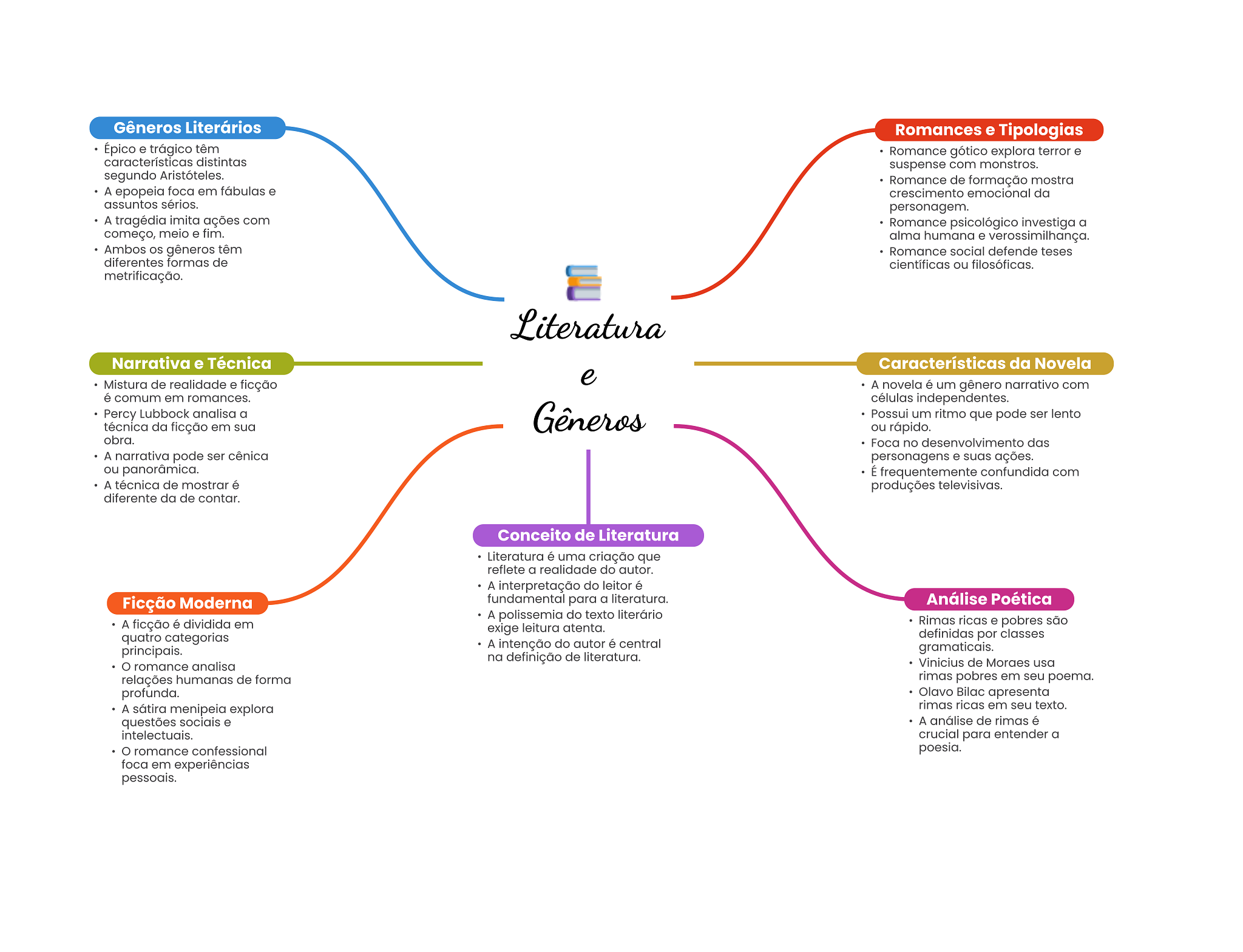 Gêneros Literários Romances e Tipologias Épico e trágico têm Romance gótico explora terror e características distintas suspense com monstros. segundo Aristóteles. Romance de formação mostra A epopeia foca em fábulas e crescimento emocional da assuntos sérios. personagem. A tragédia imita ações com Romance psicológico investiga a começo, meio e fim. alma humana e verossimilhança. Ambos OS gêneros têm Romance social defende teses diferentes formas de científicas ou filosóficas. metrificação. Literatura Narrativa e Técnica Características da Novela Mistura de realidade e ficção e A novela é um gênero narrativo com é comum em romances. células independentes. Percy Lubbock analisa a técnica da ficção em sua Gêneros Possui um ritmo que pode ser lento ou rápido. obra. Foca no desenvolvimento das A narrativa pode ser cênica personagens e suas ações. ou panorâmica. É frequentemente confundida com A técnica de mostrar é produções televisivas. diferente da de contar. Conceito de Literatura Literatura é uma criação que reflete a realidade do autor. A interpretação do leitor é Ficção Moderna fundamental para a literatura. Análise Poética A polissemia do texto literário A ficção é dividida em Rimas ricas e pobres são exige leitura atenta. quatro categorias definidas por classes principais. A intenção do autor é central gramaticais. na definição de literatura. romance analisa Vinicius de Moraes usa relações humanas de forma rimas pobres em seu poema. profunda. Olavo Bilac apresenta A sátira menipeia explora rimas ricas em seu texto. questões sociais e A análise de rimas é intelectuais. crucial para entender a romance confessional poesia. foca em experiências pessoais.
