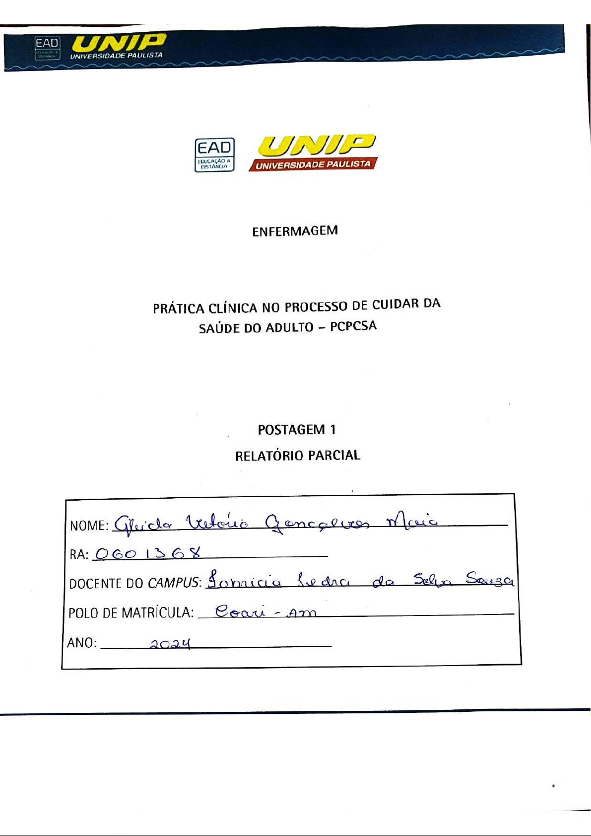 EAD UNIP UNIVERSIDADE PAULISTA EAD UNIP EDUCAÇÃO A UNIVERSIDADE PAULISTA ENFERMAGEM PRÁTICA CLÍNICA NO PROCESSO DE CUIDAR DA SAÚDE DO ADULTO - PCPCSA POSTAGEM 1 RELATÓRIO PARCIAL NOME: Gluida Maia RA: 0601368 DOCENTE DO CAMPUS: Selva POLO DE MATRÍCULA: ANO: 2024EAD UNIP UNIVERSIDADE PAULISTA EAD UNIP EDUCAÇÃO A DISTANCIA UNIVERSIDADE PAULISTA FICHA DE ATIVIDADE DIÁRIA PRÁTICA CLÍNICA NO PROCESSO DE CUIDAR DA SAÚDE DO ADULTO DATA: 2024 - HORÁRIO: as 19 NOME: Guida G. RA: 0601368 POLO: Unip- Coari Am LOCAL QUE REALIZOU A ATIVIDADE PRÁTICA: UBS Batista PROFESSOR RESPONSÁVEL: Sauza DESCREVA ABAIXO QUAL/QUAIS ATIVIDADE(S) VOCÊ REALIZOU EM SUA VISITA: na a UBS Balista na is mentor: a we vocina do ori. apos a vocina u aEAD UNIP UNIVERSIDADE PAULISTA DESCREVA ABAIXO DE QUE FORMA ESTA ATIVIDADE AGREGOU PARA SUA FORMAÇÃO COMO ENFERMEIRO: na Q quonto a vocina um cocla wm de nos como pais a va- Q item que coda a voci- Silva assim no Goren Fabricia Enfermeira ASSINATURA E CARIMBO DO PROFESSOR RESPONSÁVEL: ASSINATURA DO ALUNO: Maia ESTE DOCUMENTO DEVE SER PREENCHIDO DE FORMA MANUSCRITA.EAD UNIP UNIVERSIDADE PAULISTA EAD UNIP A DISTANCIA UNIVERSIDADE PAULISTA FICHA DE ATIVIDADE DIÁRIA PRÁTICA CLÍNICA NO PROCESSO DE CUIDAR DA SAÚDE DO ADULTO DATA: 03/04/ 2024 - HORÁRIO: as Gluda G. Maia RA: POLO: Unip Am LOCAL QUE REALIZOU A ATIVIDADE PRÁTICA: UBS Botista PROFESSOR RESPONSÁVEL: Secha da Sauza DESCREVA ABAIXO QUAL/QUAIS ATIVIDADE(S) VOCÊ REALIZOU EM SUA VISITA: na da UBS Bolista as Agendomento mes uma a Shi- some Q do no as dos SilvaUNIP UNIVERSIDADE PAULISTA DESCREVA ABAIXO DE QUE FORMA ESTA ATIVIDADE AGREGOU PARA SUA FORMAÇÃO COMO ENFERMEIRO: na apundi funciona todo Q a nele que exomes consultas assim & edra ira Fabricia Coren ASSINATURA E CARIMBO DO PROFESSOR RESPONSÁVEL: ASSINATURA DO ALUNO: Vutoria Maia ESTE DOCUMENTO DEVE SER PREENCHIDO DE FORMA MANUSCRITA.CAD UNIP UNIVERSIDADE PAULISTA EAD UNIP DISTANCIA UNIVERSIDADE PAULISTA FICHA DE ATIVIDADE DIÁRIA PRÁTICA CLÍNICA NO PROCESSO DE CUIDAR DA SAÚDE DO ADULTO DATA: 05/04/ 2024 - HORÁRIO: a 19 NOME: 060136 X POLO: Unio Coari- Am LOCAL QUE REALIZOU A ATIVIDADE PRÁTICA: UBS PROFESSOR RESPONSÁVEL: Satricia Sucha Souza DESCREVA ABAIXO QUAL/QUAIS ATIVIDADE(S) VOCÊ REALIZOU EM SUA VISITA: na UBS Batesta realizei na a Ar- do a u no doEAD UNIP UNIVERSIDADE PAULISTA DESCREVA ABAIXO DE QUE FORMA ESTA ATIVIDADE AGREGOU PARA SUA FORMAÇÃO COMO ENFERMEIRO: na puide acorn as me pain assim apendo mais ra Fabricia Enfermeira Coren Am 000.601.8 ASSINATURA E CARIMBO DO PROFESSOR RESPONSÁVEL: ASSINATURA DO ALUNO: Maia ESTE DOCUMENTO DEVE SER PREENCHIDO DE FORMA MANUSCRITA.Souze UNIP Instituto de Ciências da Saúde no Processo UNIVERSIDADE de Cuidar da Saúde do Adulto Nota Nome do Aluno: GLEIDA VITORIA GOÇALVES MAIA RA: Polo: 0601360 Coari-Am Assinatura: Data da Prova: 04 /2024 G. Maic Instruções Essa avaliação compreende 5 questões baseadas no estudo de caso descrito abaixo. Atenção ao preenchimento do gabarito das respostas das questões Não serão aceitas rasuras ou respostas dúbias. Questões não respondidas, rasuradas ou respondidas a lápis serão consideradas erradas; Fazer a prova com tinta azul ou preta; É proibido uso de aparelhos eletrônicos; Tempo máximo para a realização da prova: 2 A prova tem valor de 5,0 pontos que serão acrescidos, ao seu relatório de procedimentos. Atenção: A INTERPRETAÇÃO DO CONTEÚDO DAS QUESTÕES FAZ PARTE DA AVALIAÇÃO BOA PROVA! IMPORTANTE: Essa avaliação será utilizada em conjunto com as outras atividades especificadas no MANUAL da disciplina para compor a nota do RELATÓRIO PARCIAL/ATIVIDADE 1. DE MANEIRA NENHUMA, esta avaliação isolada terá o valor do RELATÓRIO PARCIAL/ATIVIDADE 1. Para a obtenção da nota do RELATÓRIO PARCIAL/ATIVIDADE 1, será necessário a aplicação desta avaliação e das atividades práticas (especificadas no MANUAL). Ressaltamos que para a aprovação na disciplina de PCPCSA é necessário a postagem do RELATÓRIO PARCIAL/ATIVIDADE 1 e do RELATÓRIO FINAL/ATIVIDADE 2 (conforme consta no MANUAL) ESTUDO DE CASO Identificação: R.T.S.; Idade: 38 anos; Sexo: masculino Profissão: Autônomo; Estado civil: Casado; Raça: negra; Residência: Av. 13; Bairro Centro. Histórico Clínico paciente compareceu na unidade básica de saúde para realização de curativo na região abdominal, segundo relato do paciente o mesmo foi atingido por FAB (ferimento de arma branca) a dias e ainda relata dor ao realizar procedimento, foi agendado para uma consulta de enfermagem. Na consulta, informou que, eventualmente, sentia dores constantes com escala de 8 para dor, e desconforto na região da lesão. AP: paciente sedentário, está fazendo de anti-inflamatório conforme prescrição médica. Relata que não realiza OS curativos diário pois não tem habito de ir na unidade básica de saúde. Com ultimo histórico de consulta de rotina há 6 anos atrás. AF: Pai diabético e hipertenso (falecido de AVC). Mãe morreu de infarto aos 76 anos. Tem um irmão de 20 anos com diagnostico de diabetes mellitus. EF: Altura: Peso: 1,73cm / 81kg. Pulso: 82bpm (cheio e irregular). PA: 140 X 80mmHg, Temperatura: 36.5 Mucosas: NDN (normocorada). BRNF2TS/S. MV+ S/RA. Abdome pouco distendido e tenso, dor à palpação. Eliminações +. MMII sem edema, com perfusão periférica discretamente diminuída. 1QUESTÕES Questão 1 (1,0 ponto) - 2 ou CIPESC) prioritários de ao paciente. Apontando características Elenque definidoras, associadas ou fatores risco caso você escolha Questão diagnósticos 2 (1,0 ponto) Descreva 1 Intervenção de Enfermagem (NIC) com 5 atividades de cada acordo com os que você escolheu NANDA-I. OU descreva 5 Intervenções de Enfermagem, para diagnóstico Questão 3 (1,0 ponto) A sonda vesical de demora (SVD) é indicada quando é necessário promover o esvaziamento constante da bexiga. Contudo, descreva os matérias e como realizar o procedime