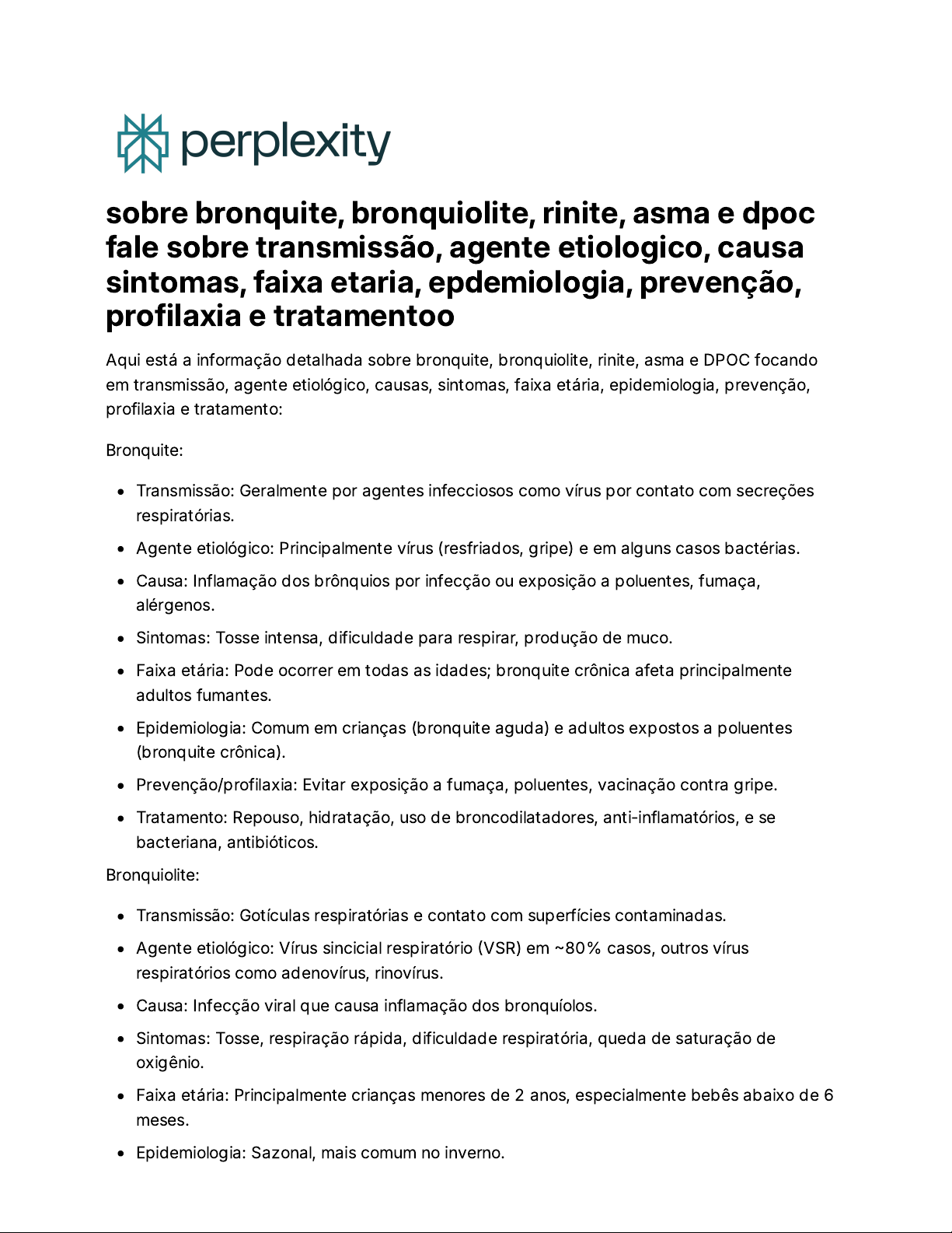 Aqui está a informação detalhada sobre bronquite, bronquiolite, rinite, asma e DPOC focando em transmissão, agente etiológico, causas, sintomas, faixa etária, epidemiologia, prevenção, profilaxia e tratamento: Bronquite: Bronquiolite: sobre bronquite, bronquiolite, rinite, asma e dpoc fale sobre transmissão, agente etiologico, causa sintomas, faixa etaria, epdemiologia, prevenção, profilaxia e tratamentoo Transmissão: Geralmente por agentes infecciosos como vírus por contato com secreções respiratórias. Agente etiológico: Principalmente vírus (resfriados, gripe) e em alguns casos bactérias. Causa: Inflamação dos brônquios por infecção ou exposição a poluentes, fumaça, alérgenos. Sintomas: Tosse intensa, dificuldade para respirar, produção de muco. Faixa etária: Pode ocorrer em todas as idades; bronquite crônica afeta principalmente adultos fumantes. Epidemiologia: Comum em crianças (bronquite aguda) e adultos expostos a poluentes (bronquite crônica). Prevenção/profilaxia: Evitar exposição a fumaça, poluentes, vacinação contra gripe. Tratamento: Repouso, hidratação, uso de broncodilatadores, anti-inflamatórios, e se bacteriana, antibióticos. Transmissão: Gotículas respiratórias e contato com superfícies contaminadas. Agente etiológico: Vírus sincicial respiratório �VSR) em �80% casos, outros vírus respiratórios como adenovírus, rinovírus. Causa: Infecção viral que causa inflamação dos bronquíolos. Sintomas: Tosse, respiração rápida, dificuldade respiratória, queda de saturação de oxigênio. Faixa etária: Principalmente crianças menores de 2 anos, especialmente bebês abaixo de 6 meses. Epidemiologia: Sazonal, mais comum no inverno. Rinite: Asma: DPOC �Doença Pulmonar Obstrutiva Crônica): Essas doenças respiratórias têm causas e mecanismos distintos. As bronquiolite e bronquite geralmente são infecciosas, com causas virais. Rinite e asma são doenças inflamatórias alérgicas Prevenção/profilaxia: Higiene das mãos, evitar contato com infectados, amamentação materna. Tratamento: Suporte com hidratação e oxigênio, raramente antibióticos; hospitalização se grave. Transmissão: Não é infecciosa, relacionada a alergias. Agente etiológico: Alérgenos como pólen, poeira, ácaros. Causa: Inflamação da mucosa nasal por reação alérgica. Sintomas: Espirros, congestão nasal, coriza, coceira no nariz e olhos. Faixa etária: Muitas vezes começa na infância, pode afetar todas as idades. Epidemiologia: Frequente em indivíduos atópicos. Prevenção/profilaxia: Evitar alérgenos conhecidos. Tratamento: Anti-histamínicos, corticosteroides nasais, descongestionantes. Transmissão: Não infecciosa, relacionada a fatores genéticos e ambientais. Agente etiológico: Diversos desencadeadores (alérgenos, poluentes, infecções). Causa: Inflamação crônica das vias aéreas com broncoespasmo. Sintomas: Chiado, tosse, dificuldade para respirar, sensação de aperto no peito. Faixa etária: Pode iniciar em qualquer idade, com frequência na infância. Epidemiologia: Doença comum mundialmente, com variações regionais. Prevenção/profilaxia: Controle ambiental, evitar gatilhos, uso de medicação preventiva. Tratamento: Broncodilatadores, corticosteroides inalados, medicamentos para controle inflam. Transmissão: Não infecciosa, relacionada a exposição prolongada a agentes irritantes. Agente etiológico: Tabagismo, poluição, poeira, produtos químicos. Causa: Inflamação crônica dos pulmões levando a obstrução do fluxo aéreo. Sintomas: Tosse crônica, produção de muco, dispneia progressiva. Faixa etária: Geralmente acima de 50 anos. Epidemiologia: Muito associada a fumantes e ex-fumantes. Prevenção/profilaxia: Evitar tabagismo e exposição a poluentes. Tratamento: Cessação do tabaco, broncodilatadores, corticosteroides, reabilitação pulmonar. e crônicas, enquanto a DPOC é crônica obstrutiva causada principalmente por irritantes externos. Medidas preventivas focam na higiene, evitar exposição a poluentes e alérgenos, e controle medicamentoso conforme o caso para reduzir sintomas e complicações. ⁂ �1� �2� �3� �4� �5� �6� �7� �8� ���https://www.rededorsaoluiz.com.br/doencas/bronquiolite ���https://pequenoprincipe.org.br/noticia/bronquite-e-bronquiolite-quais-sao-as-diferencas/ ���https://www.gov.br/saude/pt-br/assuntos/saude-de-a-a-z/b/bronquiolite/faq ���https://sbpt.org.br/portal/dia-mundial-dpoc-2021/ ���https://www.gov.br/saude/pt-br/assuntos/saude-de-a-a-z/b/bronquiolite ���https://blog.sabin.com.br/saude/quais-as-principais-doencas-respiratorias/ ���https://bjihs.emnuvens.com.br/bjihs/article/download/2605/2873/5995 ���https://g1.globo.com/bemestar/blog/doutora-ana-responde/post/bronquite-asma-ou-bronquiolite-qual- diferenca.html ���https://www.synlab-sd.com/blog/saude-e-bem-estar-pt/doencas-respiratorias-entenda-quais-sao-os-t ipos-de-doencas-seus-sintomas-e-o-que-voce-deve-fazer-para-prevenir/ ����https://www.pneumocenter.com.br/blog/o-que-e-bronquiolite-causas-sintomas-e-tratamento/ https://www.rededorsaoluiz.com.br/doencas/bronquiolite https://pequenoprincipe.org.br/noticia/bronquite-e-bronquiolite-quais-sao-as-diferencas/ https://www.gov.br/saude/pt-br/assuntos/saude-de-a-a-z/b/bronquiolite/faq https://sbpt.org.br/portal/dia-mundial-dpoc-2021/ https://www.gov.br/saude/pt-br/assuntos/saude-de-a-a-z/b/bronquiolite https://blog.sabin.com.br/saude/quais-as-principais-doencas-respiratorias/ https://bjihs.emnuvens.com.br/bjihs/article/download/2605/2873/5995 https://g1.globo.com/bemestar/blog/doutora-ana-responde/post/bronquite-asma-ou-bronquiolite-qual-diferenca.html https://g1.globo.com/bemestar/blog/doutora-ana-responde/post/bronquite-asma-ou-bronquiolite-qual-diferenca.html https://www.synlab-sd.com/blog/saude-e-bem-estar-pt/doencas-respiratorias-entenda-quais-sao-os-tipos-de-do