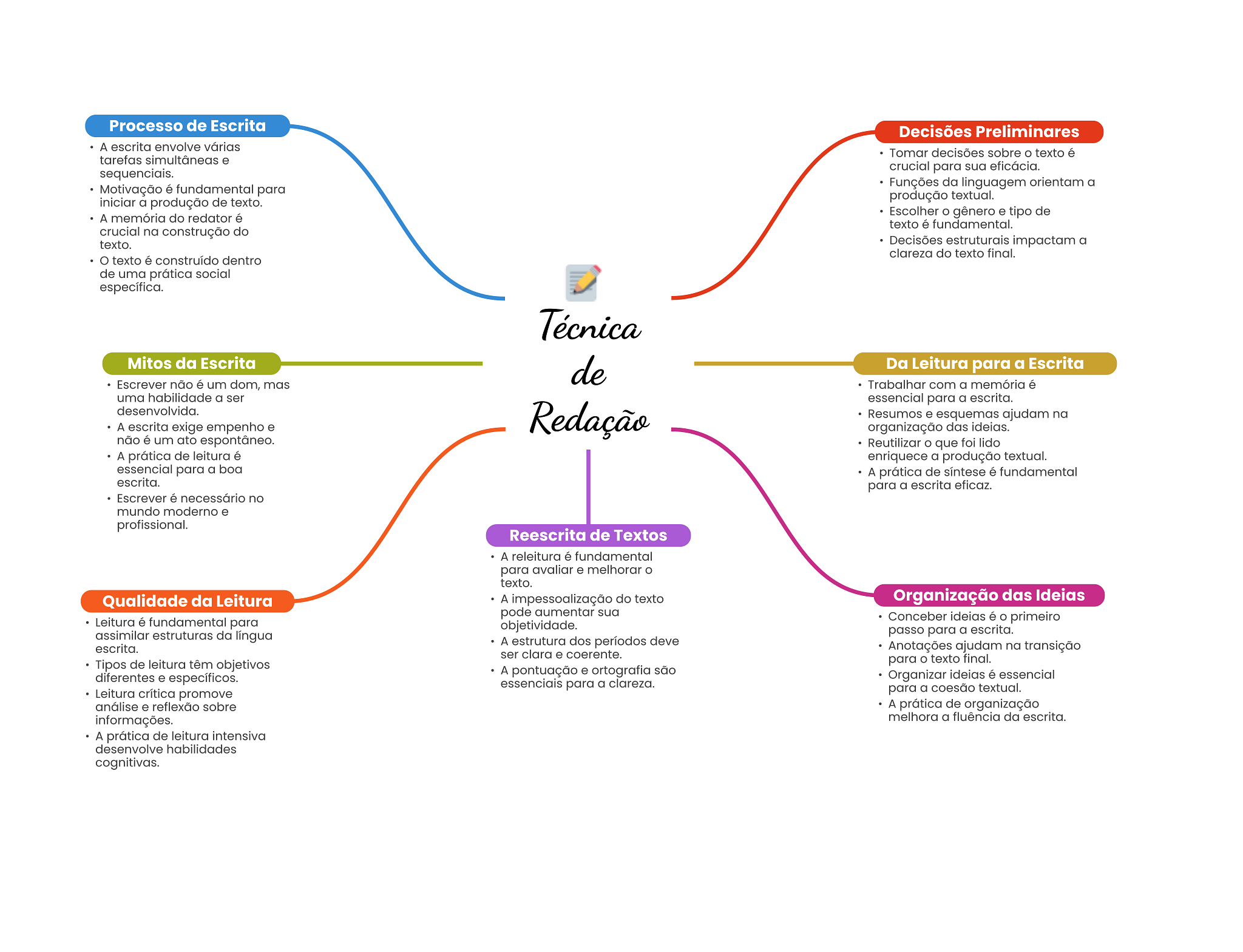 Processo de Escrita Decisões Preliminares A escrita envolve várias Tomar decisões sobre O texto é tarefas simultâneas e crucial para sua eficácia. sequenciais. Motivação é fundamental para Funções da linguagem orientam a produção textual. iniciar a produção de texto. A memória do redator é Escolher gênero e tipo de texto é fundamental. crucial na construção do texto. Decisões estruturais impactam a clareza do texto final. texto é construído dentro de uma prática social específica. Técnica Mitos da Escrita de Da Leitura para a Escrita Escrever não é um dom, mas Trabalhar com a memória é uma habilidade a ser essencial para a escrita. desenvolvida. Redação Resumos e esquemas ajudam na A escrita exige empenho e organização das ideias. não é um ato espontâneo. Reutilizar O que foi lido A prática de leitura é enriquece a produção textual. essencial para a boa A prática de síntese é fundamental escrita. para a escrita eficaz. Escrever é necessário no mundo moderno e profissional. Reescrita de Textos A releitura é fundamental para avaliar e melhorar texto. Qualidade da Leitura A impessoalização do texto Organização das Ideias pode aumentar sua Leitura é fundamental para Conceber ideias é primeiro objetividade. assimilar estruturas da língua passo para a escrita. A estrutura dos períodos deve escrita. Anotações ajudam na transição ser clara e coerente. Tipos de leitura têm objetivos para texto final. A pontuação e ortografia são diferentes e específicos. Organizar ideias é essencial essenciais para a clareza. Leitura crítica promove para a coesão textual. análise e reflexão sobre A prática de organização informações. melhora a fluência da escrita. A prática de leitura intensiva desenvolve habilidades cognitivas.
