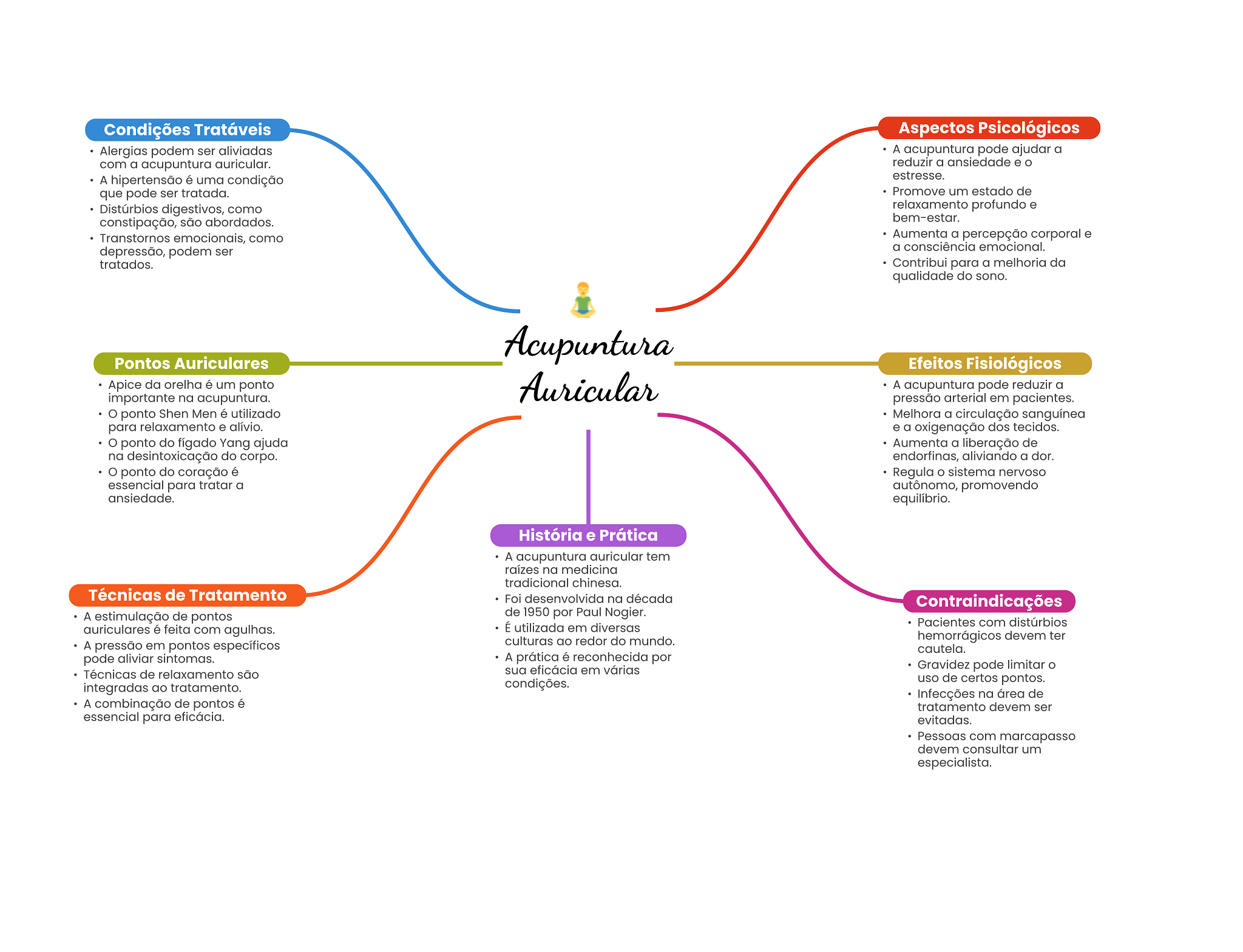 Condições Tratáveis Aspectos Psicológicos Alergias podem ser aliviadas A acupuntura pode ajudar a com a acupuntura auricular. reduzir a ansiedade e A hipertensão é uma condição estresse. que pode ser tratada. Promove um estado de Distúrbios digestivos, como relaxamento profundo e constipação, são abordados. bem-estar. Transtornos emocionais, como Aumenta a percepção corporal e depressão, podem ser a consciência emocional. tratados. Contribui para a melhoria da qualidade do sono. Acupuntura Pontos Auriculares Efeitos Fisiológicos Apice da orelha é um ponto importante na acupuntura. Auricular A acupuntura pode reduzir a pressão arterial em pacientes. ponto Shen Men é utilizado Melhora a circulação sanguínea para relaxamento e alívio. e a oxigenação dos tecidos. ponto do fígado Yang ajuda Aumenta a liberação de na desintoxicação do corpo. endorfinas, aliviando a dor. ponto do coração é Regula O sistema nervoso essencial para tratar a autônomo, promovendo ansiedade. equilíbrio. História e Prática A acupuntura auricular tem raízes na medicina tradicional chinesa. Técnicas de Tratamento Foi desenvolvida na década Contraindicações A estimulação de pontos de 1950 por Paul Nogier. auriculares é feita com agulhas. É utilizada em diversas Pacientes com distúrbios A pressão em pontos específicos culturas ao redor do mundo. hemorrágicos devem ter cautela. pode aliviar sintomas. A prática é reconhecida por sua eficácia em várias Gravidez pode limitar Técnicas de relaxamento são condições. uso de certos pontos. integradas ao tratamento. Infecções na área de A combinação de pontos é tratamento devem ser essencial para eficácia. evitadas. Pessoas com marcapasso devem consultar um especialista.