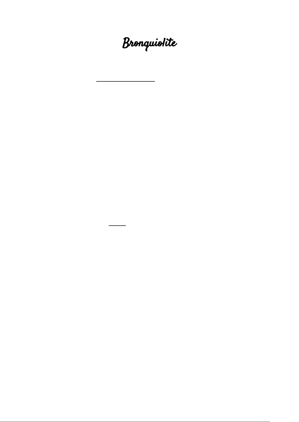 Saúde da criança III - 6° período Pablynne Serpa XXXVIII Bronquiolite Definição: É o primeiro episódio de sibilância em lactentes 70 ● Atelectasia ● Hipoxemia 90%; ● Ingesta adequada; ● Cuidadores capazes de entender as orientações fornecidas. Medidas preventivas: ● Imunização passiva: Palivizumabe (anticorpo monoclonal contra o vírus) reduz a atividade viral e transmissão do vírus entre as células, evitando as formas graves da doença. ● Medidas de higiene Complicações: ● Otite ● Atelectasias ● Pneumonia bacteriana ● Bronquiolite obliterante