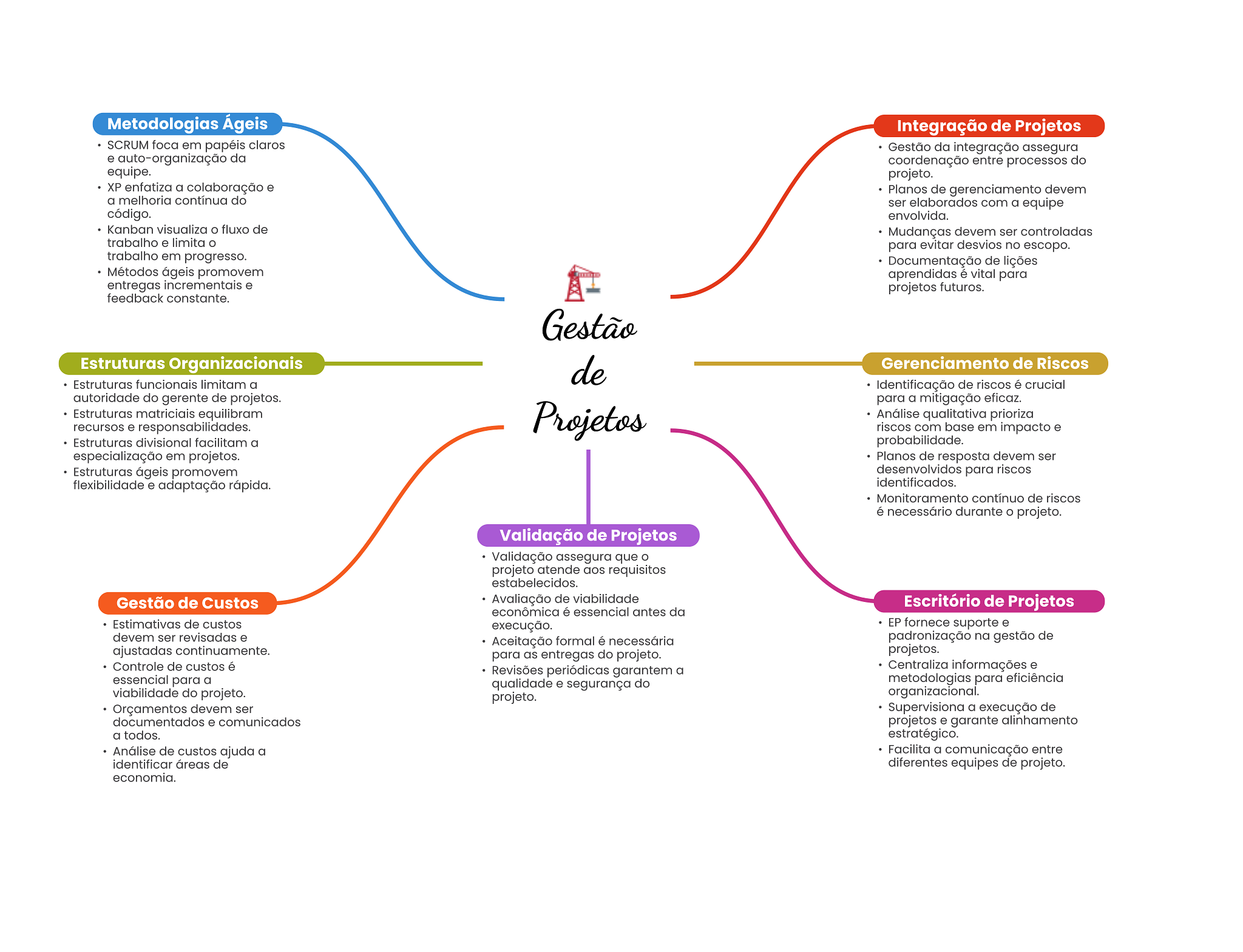 Metodologias Ágeis Integração de Projetos SCRUM foca em papéis claros Gestão da integração assegura e auto-organização da coordenação entre processos do equipe. projeto. XP enfatiza a colaboração e Planos de gerenciamento devem a melhoria contínua do ser elaborados com a equipe código. envolvida. Kanban visualiza fluxo de Mudanças devem ser controladas trabalho e limita para evitar desvios no escopo. trabalho em progresso. Documentação de lições Métodos ágeis promovem aprendidas é vital para entregas incrementais e projetos futuros. feedback constante. Gestão Estruturas Organizacionais de Gerenciamento de Riscos Estruturas funcionais limitam a Identificação de riscos é crucial autoridade do gerente de projetos. para a mitigação eficaz. Estruturas matriciais equilibram Projetos Análise qualitativa prioriza recursos e responsabilidades. riscos com base em impacto e Estruturas divisional facilitam a probabilidade. especialização em projetos. Planos de resposta devem ser Estruturas ágeis promovem desenvolvidos para riscos flexibilidade e adaptação rápida. identificados. Monitoramento contínuo de riscos é necessário durante O projeto. Validação de Projetos Validação assegura que projeto atende aos requisitos estabelecidos. Gestão de Custos Avaliação de viabilidade Escritório de Projetos econômica é essencial antes da Estimativas de custos execução. EP fornece suporte e devem ser revisadas e Aceitação formal é necessária padronização na gestão de ajustadas continuamente. para as entregas do projeto. projetos. Controle de custos é Revisões periódicas garantem a Centraliza informações e essencial para a qualidade e segurança do metodologias para eficiência viabilidade do projeto. projeto. organizacional. Orçamentos devem ser Supervisiona a execução de documentados e comunicados projetos e garante alinhamento a todos. estratégico. Análise de custos ajuda a Facilita a comunicação entre identificar áreas de diferentes equipes de projeto. economia.