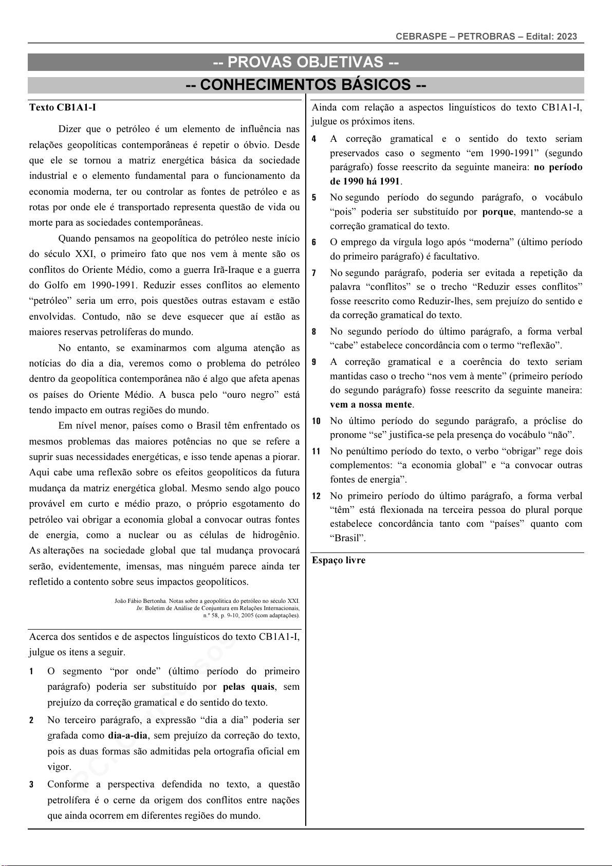 pcimarkpci MDAwMDowMDAwOjAwMDA6MDAwMDowMDAwOmZmZmY6YzA4Yzo3NzEw:VGh1LCAwOCBKYW4gMjAyNiAyMDo1MzowNyAtMDMwMA== www.pciconcursos.com.br CEBRASPE – PETROBRAS – Edital: 2023 -- PROVAS OBJETIVAS -- -- CONHECIMENTOS BÁSICOS -- Texto CB1A1-I Dizer que o petróleo é um elemento de influência nas relações geopolíticas contemporâneas é repetir o óbvio. Desde que ele se tornou a matriz energética básica da sociedade industrial e o elemento fundamental para o funcionamento da economia moderna, ter ou controlar as fontes de petróleo e as rotas por onde ele é transportado representa questão de vida ou morte para as sociedades contemporâneas. Quando pensamos na geopolítica do petróleo neste início do século XXI, o primeiro fato que nos vem à mente são os conflitos do Oriente Médio, como a guerra Irã-Iraque e a guerra do Golfo em 1990-1991. Reduzir esses conflitos ao elemento “petróleo” seria um erro, pois questões outras estavam e estão envolvidas. Contudo, não se deve esquecer que aí estão as maiores reservas petrolíferas do mundo. No entanto, se examinarmos com alguma atenção as notícias do dia a dia, veremos como o problema do petróleo dentro da geopolítica contemporânea não é algo que afeta apenas os países do Oriente Médio. A busca pelo “ouro negro” está tendo impacto em outras regiões do mundo. Em nível menor, países como o Brasil têm enfrentado os mesmos problemas das maiores potências no que se refere a suprir suas necessidades energéticas, e isso tende apenas a piorar. Aqui cabe uma reflexão sobre os efeitos geopolíticos da futura mudança da matriz energética global. Mesmo sendo algo pouco provável em curto e médio prazo, o próprio esgotamento do petróleo vai obrigar a economia global a convocar outras fontes de energia, como a nuclear ou as células de hidrogênio. As alterações na sociedade global que tal mudança provocará serão, evidentemente, imensas, mas ninguém parece ainda ter refletido a contento sobre seus impactos geopolíticos. João Fábio Bertonha. Notas sobre a geopolítica do petróleo no século XXI. In: Boletim de Análise de Conjuntura em Relações Internacionais, n.º 58, p. 9-10, 2005 (com adaptações). Acerca dos sentidos e de aspectos linguísticos do texto CB1A1-I, julgue os itens a seguir. 1 O segmento “por onde” (último período do primeiro parágrafo) poderia ser substituído por pelas quais, sem prejuízo da correção gramatical e do sentido do texto. 2 No terceiro parágrafo, a expressão “dia a dia” poderia ser grafada como dia-a-dia, sem prejuízo da correção do texto, pois as duas formas são admitidas pela ortografia oficial em vigor. 3 Conforme a perspectiva defendida no texto, a questão petrolífera é o cerne da origem dos conflitos entre nações que ainda ocorrem em diferentes regiões do mundo. Ainda com relação a aspectos linguísticos do texto CB1A1-I, julgue os próximos itens. 4 A correção gramatical e o sentido do texto seriam preservados caso o segmento “em 1990-1991” (segundo parágrafo) fosse reescrito da seguinte maneira: no período de 1990 há 1991. 5 No segundo período do segundo parágrafo, o vocábulo “pois” poderia ser substituído por porque, mantendo-se a correção gramatical do texto. 6 O emprego da vírgula logo após “moderna” (último período do primeiro parágrafo) é facultativo. 7 No segundo parágrafo, poderia ser evitada a repetição da palavra “conflitos” se o trecho “Reduzir esses conflitos” fosse reescrito como Reduzir-lhes, sem prejuízo do sentido e da correção gramatical do texto. 8 No segundo período do último parágrafo, a forma verbal “cabe” estabelece concordância com o termo “reflexão”. 9 A correção gramatical e a coerência do texto seriam mantidas caso o trecho “nos vem à mente” (primeiro período do segundo parágrafo) fosse reescrito da seguinte maneira: vem a nossa mente. 10 No último período do segundo parágrafo, a próclise do pronome “se” justifica-se pela presença do vocábulo “não”. 11 No penúltimo período do texto, o verbo “obrigar” rege dois complementos: “a economia global” e “a convocar outras fontes de energia”. 12 No primeiro período do último parágrafo, a forma verbal “têm” está flexionada na terceira pessoa do plural porque estabelece concordância tanto com “países” quanto com “Brasil”. Espaço livre pcimarkpci MDAwMDowMDAwOjAwMDA6MDAwMDowMDAwOmZmZmY6YzA4Yzo3NzEw:VGh1LCAwOCBKYW4gMjAyNiAyMDo1MzowNyAtMDMwMA== www.pciconcursos.com.br CEBRASPE – PETROBRAS – Edital: 2023 Texto CB1A1-II Há 70 anos, em 3 de outubro de 1953, era criada a PETROBRÁS, uma empresa estatal que detinha o monopólio da prospecção e exploração do petróleo no território brasileiro. A criação da empresa foi fruto da campanha “O petróleo é nosso”, iniciada após a eleição de Getúlio Vargas para seu segundo período na Presidência. Sete décadas após sua criação, ficaram para trás o acento agudo e o foco exclusivo no território brasileiro. A PETROBRAS do século XXI opera em 14 países, prioritariamente nas áreas de exploração, produção, refino, comercialização e transporte de petróleo, gás natural e seus derivados, e ganhou reputação internacional no desenvolvimento de tecnologia avançada para a exploração petrolífera em águas profundas e ultraprofundas. Ficou para trás também o caráter 100% estatal. Atualmente, a PETROBRAS está organizada como sociedade de economia mista, submete-se às regras gerais da administração pública e não mais detém o monopólio da exploração do petróleo em território nacional. Seu papel, no entanto, vai além da obtenção de lucro e envolve aspectos como geração de emprego e renda, além da promoção do desenvolvimento local nos lugares onde instala suas unidades e empreendimentos. Estes, muitas vezes, se situam em regiões remotas, que não despertam o apetite de compan