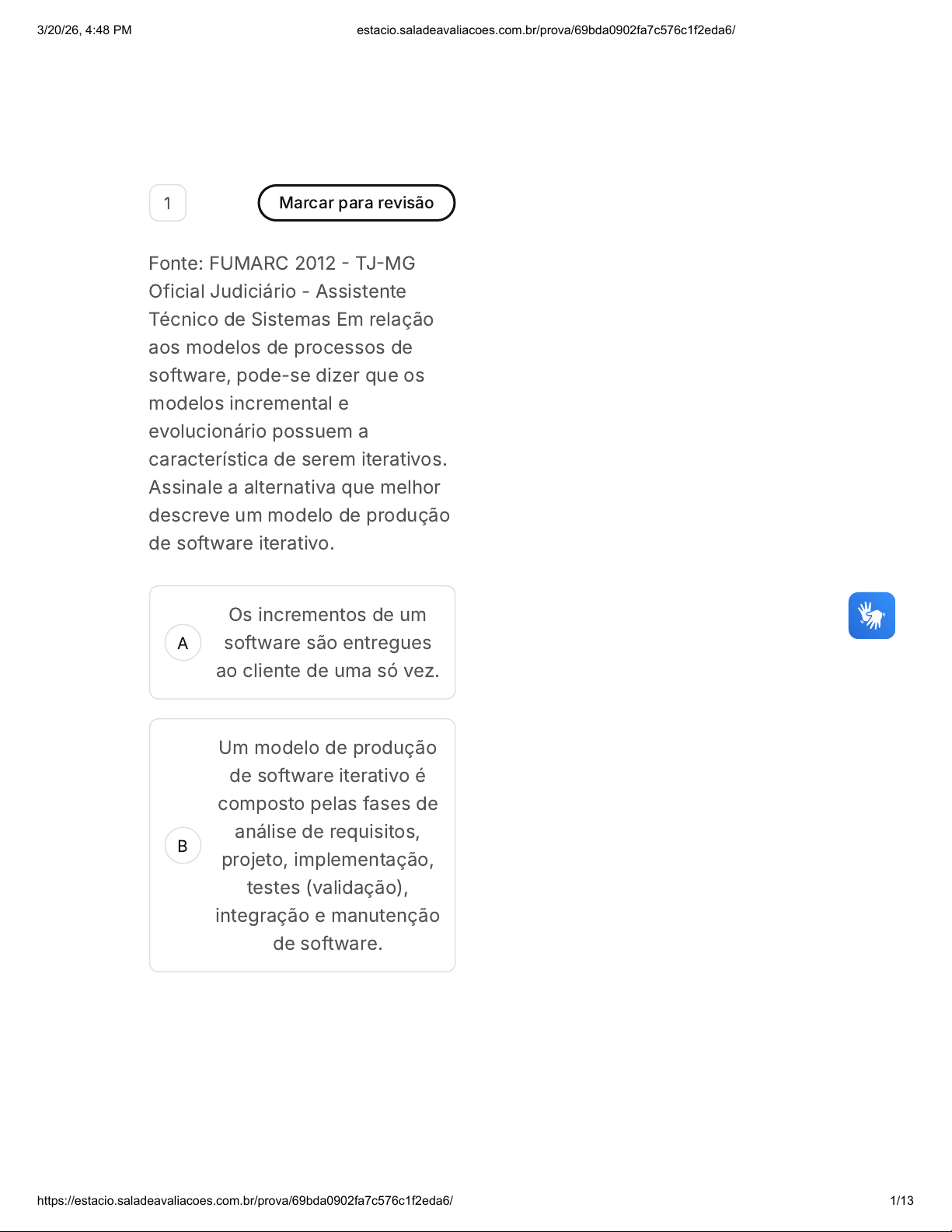 A B 1 Marcar para revisão Fonte: FUMARC 2012 - TJ-MG Oficial Judiciário - Assistente Técnico de Sistemas Em relação aos modelos de processos de software, pode-se dizer que os modelos incremental e evolucionário possuem a característica de serem iterativos. Assinale a alternativa que melhor descreve um modelo de produção de software iterativo. Os incrementos de um software são entregues ao cliente de uma só vez. Um modelo de produção de software iterativo é composto pelas fases de análise de requisitos, projeto, implementação, testes (validação), integração e manutenção de software. 3/20/26, 4:48 PM estacio.saladeavaliacoes.com.br/prova/69bda0902fa7c576c1f2eda6/ https://estacio.saladeavaliacoes.com.br/prova/69bda0902fa7c576c1f2eda6/ 1/13 C D E A abordagem iterativa possibilita desenvolver um sistema de software de forma incremental, permitindo ao desenvolvedor tirar vantagem daquilo que foi aprendido durante a fase inicial de desenvolvimento de uma versão do sistema. O aprendizado ocorre simultaneamente tanto para o desenvolvedor, quanto para o usuário do sistema. Os incrementos de um software são entregues ao cliente somente duas vezes. Um modelo de produção de software iterativo é composto pelas fases de análise de requisitos, projeto e implementação. 2 Marcar para revisão Em uma organização de matriz fraca dois gerentes de projetos acabam de perceber que seu poder é limitado. Um deles é facilitador de projetos e o outro 3/20/26, 4:48 PM estacio.saladeavaliacoes.com.br/prova/69bda0902fa7c576c1f2eda6/ https://estacio.saladeavaliacoes.com.br/prova/69bda0902fa7c576c1f2eda6/ 2/13 A B C D E atua como coordenador de projetos. Qual é a diferença entre um facilitador e um coordenador de projetos? O facilitador do projeto não pode tomar decisões. O facilitador do projeto pode tomar decisões. O facilitador do projeto tem alguma autoridade. O facilitador do projeto está subordinado a um gerente de nível mais alto. O facilitador do projeto gerencia o projeto até a entrega do produto/serviço. 3 Marcar para revisão O teste de software visa garantir a qualidade, minimizando as incertezas e sistematizando os critérios de aceitação, porém isso não pode ser feito sem uma estratégia de teste. Para que 3/20/26, 4:48 PM estacio.saladeavaliacoes.com.br/prova/69bda0902fa7c576c1f2eda6/ https://estacio.saladeavaliacoes.com.br/prova/69bda0902fa7c576c1f2eda6/ 3/13 A B C D E tenhamos uma estratégia de teste de software bem elaborada ela deve incorporar alguns testes como: I- Testes de baixo nível, necessários para verificar se um pequeno segmento de código fonte foi implementado corretamente. II- Testes de alto nível, que validam as funções principais do sistema de acordo com os requisitos do cliente. III- Documento básico para organizar a atividade de testar aplicações no contexto da empresa. Assinale a assertiva correta. Apenas o item I está correto. Apenas o item II está correto. Apenas o item III está correto. Apenas os itens I e II estão corretos. Apenas os itens II e III estão corretos. 3/20/26, 4:48 PM estacio.saladeavaliacoes.com.br/prova/69bda0902fa7c576c1f2eda6/ https://estacio.saladeavaliacoes.com.br/prova/69bda0902fa7c576c1f2eda6/ 4/13 A B C 4 Marcar para revisão A Engenharia de Software nos auxilia em muitas situações. Uma delas é a atividade de teste de software. Sobre este assunto, analise as asserções abaixo e, a seguir, assinale a alternativa correta: I. Existem dois tipos de teste de software: teste de baixo nível e teste de alto nível; II. O teste de software é o processo de executar o software de uma maneira controlada, com o objetivo de descobrir diferenças entre o comportamento previsto e o comportamento observado. III. Os testes de software podem ser usados para descobrir a ausência de erros no produto (software). Somente as asserções I e II estão corretas Somente as asserções I e III estão corretas Somente as asserções II e III estão corretas 3/20/26, 4:48 PM estacio.saladeavaliacoes.com.br/prova/69bda0902fa7c576c1f2eda6/ https://estacio.saladeavaliacoes.com.br/prova/69bda0902fa7c576c1f2eda6/ 5/13 D E A B C Somente a asserção I está correta Somente a asserção III está correta 5 Marcar para revisão O Modelo V é uma melhoria do Modelo Cascata do desenvolvimento de produto. Ele possui alguns objetivos, dentre os quais estão explicitados nas alternativas abaixo, EXCETO (ou seja, assinale a alternativa INCORRETA, isto é a que não representa um dos objetivos do Modelo V). Um dos objetivos do Modelo V é mimizar os riscos do projeto. Um dos objetivos do Modelo V é melhorar e garantir a qualidade do projeto. Um dos objetivos do Modelo V é reduzir os custos totais ao longo do ciclo de vida do projeto 3/20/26, 4:48 PM estacio.saladeavaliacoes.com.br/prova/69bda0902fa7c576c1f2eda6/ https://estacio.saladeavaliacoes.com.br/prova/69bda0902fa7c576c1f2eda6/ 6/13 D E A B Um dos objetivos do Modelo V é melhorar a comunicação entre as partes interessadas. Um dos objetivos do Modelo V é maximizar os lucros da empresa desenvolvedora. 6 Marcar para revisão Podemos conceituar Qualidade de Software como: Um processo sistemático que focaliza todas as etapas e artefatos gerados com o objetivo de garantir a conformidade e uniformidade de processos e produtos, prevenindo e eliminado defeitos. Um processo que foca em todos os produtos de software gerados pela equipe de desenvolvimento. 00 hora : 33 min : 33 seg Ocultar Questão 9 de 10 Respondidas (10) Em branco (0) Finalizar prova 1 2 3 4 5 6 7 8 9 10 SM1 Qualidade e Testes De Software 3/20/26, 4:48 PM estacio.saladeavaliacoes.com.br/prova/69bda0902fa7c576c1f2eda6/ https://estacio.saladeavaliacoes.com.br/prova/69bda0902fa7c576c1f2eda6/ 7/13 C D E Um processo que demonstra que algo funciona corretamente. Um processo para provar que determinadas coisas (funções) fazem o que devem fazer. Um processo para demonstrar que os defeitos não estão presentes. 7 Marcar p