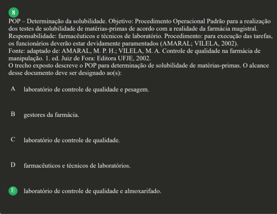 8 POP - Determinação da solubilidade. Objetivo: Procedimento Operacional Padrão para a realização dos testes de solubilidade de matérias-primas de acordo com a realidade da farmácia magistral. Responsabilidade: farmacêuticos e técnicos de laboratório. Procedimento: para execução das tarefas, os funcionários deverão estar devidamente paramentados (AMARAL; VILELA, 2002). Fonte: adaptado de: AMARAL, M. P. H.; VILELA, M.A. Controle de qualidade na farmácia de manipulação. 1. ed. Juiz de Fora: Editora UFJE, 2002. O trecho exposto descreve o POP para determinação de solubilidade de matérias-primas. alcance desse documento deve ser designado ao(s): A laboratório de controle de qualidade e pesagem. B gestores da farmácia. C laboratório de controle de qualidade. D farmacêuticos e técnicos de laboratórios. E laboratório de controle de qualidade e almoxarifado.