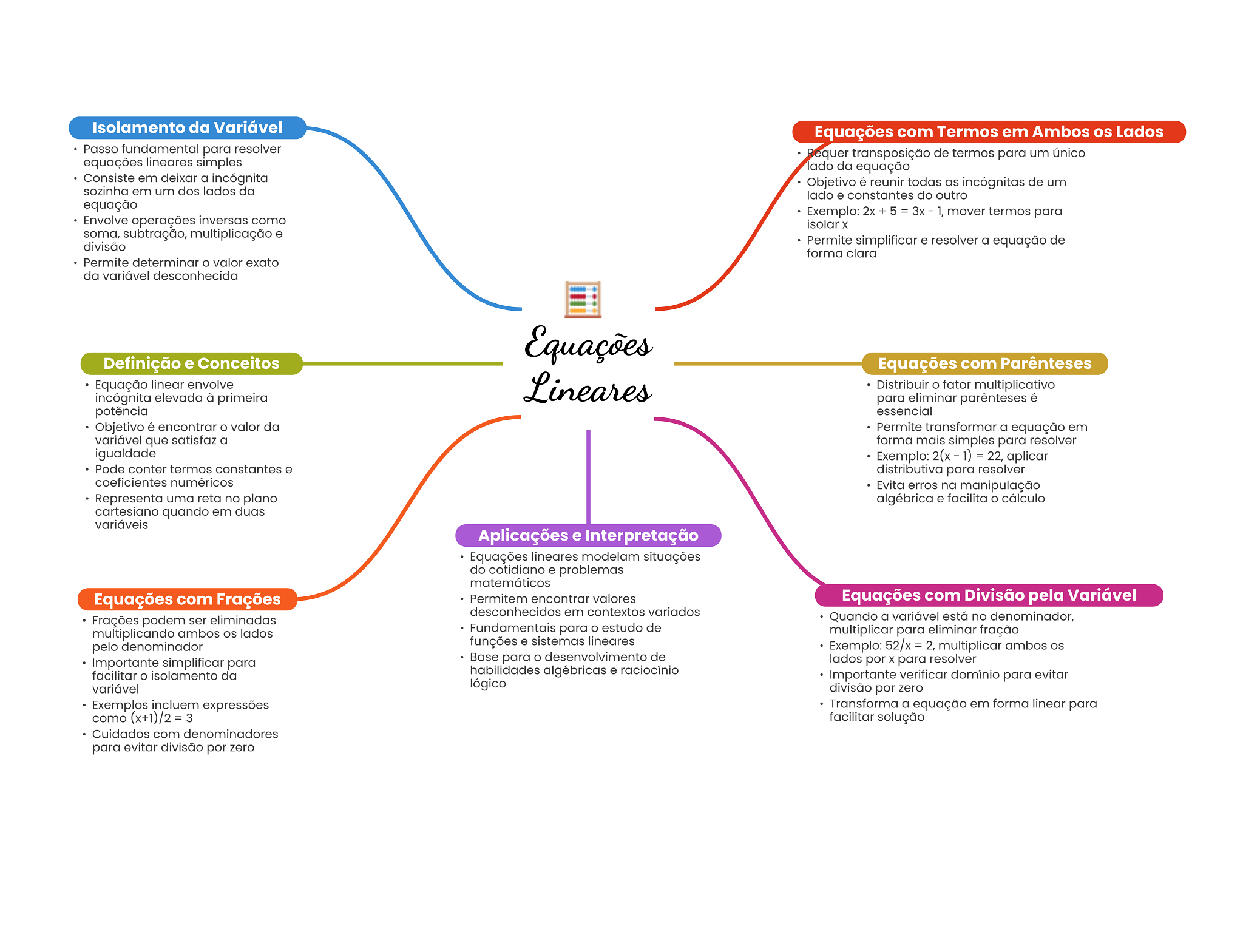 Isolamento da Variável Equações com Termos em Ambos os Lados Passo fundamental para resolver Requer transposição de termos para um único equações lineares simples lado da equação Consiste em deixar a incógnita Objetivo é reunir todas as incógnitas de um sozinha em um dos lados da lado e constantes do outro equação Exemplo: 2x + 5 = 3x 1, mover termos para Envolve operações inversas como isolar X soma, subtração, multiplicação e divisão Permite simplificar e resolver a equação de forma clara Permite determinar valor exato da variável desconhecida Equações Definição e Conceitos Equações com Parênteses Equação linear envolve Lineares Distribuir fator multiplicativo incógnita elevada à primeira para eliminar parênteses é potência essencial Objetivo é encontrar valor da Permite transformar a equação em variável que satisfaz a forma mais simples para resolver igualdade Exemplo: 2(x 1) = 22, aplicar Pode conter termos constantes e distributiva para resolver coeficientes numéricos Evita erros na manipulação Representa uma reta no plano algébrica e facilita O cálculo cartesiano quando em duas variáveis Aplicações e Interpretação Equações lineares modelam situações do cotidiano e problemas matemáticos Equações com Frações Permitem encontrar valores Equações com Divisão pela Variável desconhecidos em contextos variados Frações podem ser eliminadas Quando a variável está no denominador, multiplicando ambos os lados Fundamentais para estudo de multiplicar para eliminar fração pelo denominador funções e sistemas lineares Exemplo: 52/x = 2, multiplicar ambos Importante simplificar para Base para desenvolvimento de lados por X para resolver facilitar isolamento da habilidades algébricas e raciocínio Importante verificar domínio para evitar variável lógico divisão por zero Exemplos incluem expressões Transforma a equação em forma linear para como (x+1)/2 3 facilitar solução Cuidados com denominadores para evitar divisão por zero