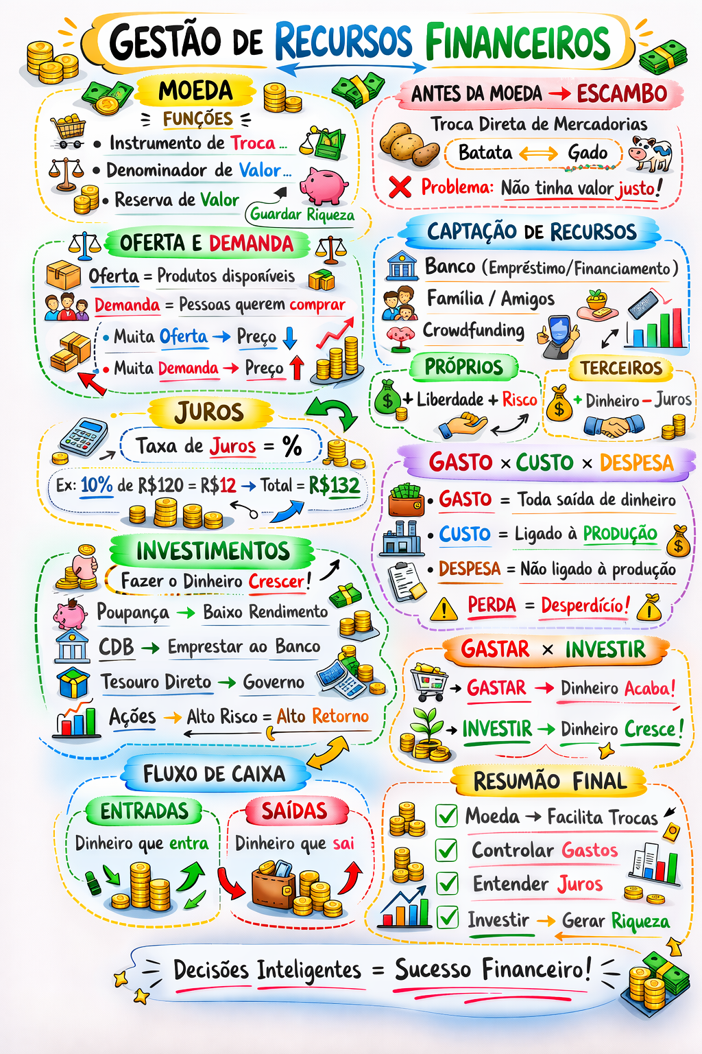GESTÃO DE RECURSOS FINANCEIROS MOEDA ANTES DA MOEDA ESCAMBO FUNÇÕES Troca Direta de Mercadorias Instrumento de Troca Batata Gado Denominador de Valor Reserva de Valor Problema: Não tinha valor justo! Guardar Riqueza OFERTA E DEMANDA CAPTAÇÃO DE RECURSOS Oferta = Produtos Banco (Empréstimo/Financiamento Demanda = Pessoas querem comprar Família / Amigos Muita Oferta Preço Crowdfunding Muita Demanda Preço PRÓPRIOS TERCEIROS $ + Liberdade + Risco Dinheiro - Juros JUROS $ Taxa de Juros = % GASTO CUSTO DESPESA Ex: 10% de R$120 = R$12 Total = R$132 GASTO = Toda saída de dinheiro CUSTO = Ligado à PRODUÇÃO INVESTIMENTOS $ Fazer Dinheiro Crescer ! DESPESA = Não ligado à produção Poupança Baixo Rendimento PERDA = Desperdícío! ! CDB Emprestar ao Banco GASTAR INVESTIR Tesouro Direto Governo GASTAR Dinheiro Acaba! Ações Alto Risco = Alto Retorno INVESTIR Dinheiro Cresce FLUXO DE CAIXA RESUMÃO FINAL ENTRADAS SAÍDAS Moeda Facilita Trocas Dinheiro que entra Dinheiro que sai Controlar Gastos Entender Juros Investir Gerar Riqueza Decisões Inteligentes = Sucesso Financeiro!