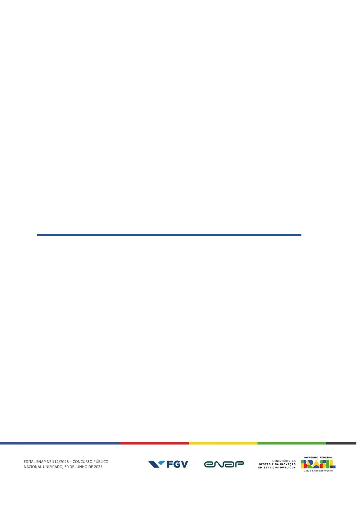 1 ESCOLA NACIONAL DE ADMINISTRAÇÃO PÚBLICA CONCURSO PÚBLICO NACIONAL UNIFICADO 2 DO GOVERNO FEDERAL PARA O PROVIMENTO DE VAGAS E A FORMAÇÃO DE BANCO DE CANDIDATOS APROVADOS EM LISTA DE ESPERA PARA CARGOS DE NÍVEL SUPERIOR E NÍVEL INTERMEDIÁRIO EDITAL ENAP Nº 114/2025 – CONCURSO PÚBLICO NACIONAL UNIFICADO, 30 DE JUNHO DE 2025 RETIFICADO EM 17/07/2025 A PRESIDENTA DA ESCOLA NACIONAL DE ADMINISTRAÇÃO PÚBLICA, no uso da atribuição que lhe confere o art. 19, Anexo I, do Decreto n.º 10.369, de 22 de maio de 2020, c/c art. 13-D do Decreto n.º 12.526, de 24 de junho de 2025, tendo em vista as autorizações concedidas por meio da Portaria MGI nº 7.780, de 13 de novembro de 2024, Portaria MGI nº 6.726, de 17 de dezembro de 2024, Portaria MGI nº 9.726, de 26 de dezembro de 2024, Portaria MGI nº 9.790, de 27 de dezembro de 2024, Portaria MGI nº 9.814, de 30 de dezembro de 2024, Portaria MGI nº 1.174, de 13 de fevereiro de 2025, Portaria MGI nº 2.787, de 25 de abril de 2025, Portaria MGI nº 4.264, de 2 de junho de 2025, Portaria MGI nº 4.265, de 2 de junho de 2025, Portaria MGI nº 4.266, de 2 de junho de 2025, o disposto no art. 32, caput, incisos I, II, III e V, da Lei nº 14.600, de 19 de junho de 2023, no art. 27, caput, inciso III, e no art. 44 do Decreto nº 9.739, de 28 de março de 2019, no Decreto nº 11.722, de 28 de setembro de 2023, RESOLVE divulgar a abertura das inscrições e estabelecer normas para a realização da segunda edição do Concurso Público Nacional Unificado para o provimento de vagas e a formação de Banco de Candidatos Aprovados em Lista de Espera para cargos de Nível Superior e Nível Intermediário, mediante as condições estabelecidas neste Edital. 1. DAS DISPOSIÇÕES PRELIMINARES 1.1. O Concurso Público Nacional Unificado 2 regido por este Edital, pelos diplomas legais e regulamentares, por seus anexos e suas posteriores retificações, caso existam, será executado pela Fundação Getulio Vargas (FGV) sob a coordenação da Escola Nacional de Administração Pública (Enap) e visa ao preenchimento de vagas e à formação de um Banco de Candidatos Aprovados em Lista de Espera para cargos de Nível Superior e Nível Intermediário, conforme indicado no subitem 1.2 e nos Anexos deste Edital. 1.2. As informações sobre os Blocos Temáticos, os órgãos participantes do Concurso Púbico Nacional Unificado, os cargos/especialidades e as vagas, encontram-se no: a) Anexo I, que contempla o Bloco Temático 1 – Seguridade Social: Saúde, Assistência Social e Previdência Social; b) Anexo II, que contempla o Bloco Temático 2 – Cultura e Educação; c) Anexo III, que contempla o Bloco Temático 3 – Ciência e Tecnologia; d) Anexo IV, que contempla o Bloco Temático 4 – Engenharia e Arquitetura; e) Anexo V, que contempla o Bloco Temático 5 – Administração; f) Anexo VI, que contempla o Bloco Temático 6 – Desenvolvimento Socioeconômico; g) Anexo VII, que contempla o Bloco Temático 7 – Justiça e Defesa; 2 h) Anexo VIII, que contempla o Bloco Temático 8 – Intermediário – Saúde; e i) Anexo IX, que contempla o Bloco Temático 9 – Intermediário – Regulação. 1.3. O prazo de validade do Concurso Público Nacional Unificado é de 12 (doze) meses, contados a partir data da publicação da homologação de seu Resultado Final no Diário Oficial da União, podendo ser prorrogado, uma única vez, por igual período, com base no art. 43, § 1º, do Decreto nº 9.739, de 28 de março de 2019. 1.4. O Concurso Público Nacional Unificado apresentará as seguintes modalidades de concorrência de vagas: Ampla Concorrência (AC), Pessoas com Deficiência (PcD), Pessoas Negras (PN), Pessoas Indígenas (PI) e Pessoas Quilombolas (PQ). 1.4.1. Considera-se Pessoas Negras (PN) o conjunto de pessoas que se autodeclaram negras, conforme o quesito cor ou raça usado pela Fundação Instituto Brasileiro de Geografia e Estatística (IBGE), nos termos da Lei nº 12.288, de 20 de julho de 2010. 1.4.2. Das vagas ofertadas e das que vierem a ser criadas durante o prazo de validade do Concurso Público Nacional Unificado, 5% (cinco por cento) serão reservadas a Pessoas com Deficiência (PcD), providas na forma do § 2º do art. 5º da Lei nº 8.112, de 11 de dezembro de 1990, do § 1º do art. 1º do Decreto nº 9.508, de 24 de setembro de 2018, e as suas alterações, e da Instrução Normativa Conjunta MGI/MDHC nº 260, de 26 de junho de 2025, do Ministério da Gestão e da Inovação em Serviços Públicos e do Ministério dos Direitos Humanos e da Cidadania. 25% (vinte e cinco por cento) das vagas serão reservadas aos que concorrerem a cotas para Pessoas Negras, 3% (três por cento) para Indígenas e 2% (dois por cento) para Quilombolas, com fundamento na Lei nº 15.142, de 3 de junho de 2025, no Decreto nº 12.536, de 27 de junho de 2025, e na Instrução Normativa Conjunta MGI/MIR/MPI nº 261, de 27 de junho de 2025, do Ministério da Gestão e de Inovação em Serviços Públicos, do Ministério da Igualdade Racial e do Ministério dos Povos Indígenas. 2. DO CONCURSO 2.1.O Concurso Público Nacional Unificado será realizado em até 2 (duas) etapas, conforme descrito a seguir: I – Primeira etapa, dividida nas seguintes fases: a) Fase 1: Prova Objetiva, de caráter eliminatório e classificatório; b) Fase 2: Prova Discursiva, de caráter eliminatório e classificatório; c) Fase 3: Avaliação de Títulos, de caráter classificatório, aplicada apenas às pessoas candidatas que concorrerem aos cargos/especialidades com previsão nos Anexos I a IX; d) Fase 4: 1. Procedimento de caracterização da deficiência das pessoas candidatas que optaram por concorrer às vagas reservadas, bem como de aferição da compatibilidade entre as atribuições do cargo e a deficiência apresentada por essas pessoas, na forma do item 6 deste Edital; e 2. Procedimento de confirmação/verificação complementar da autodeclaração para concorrer 