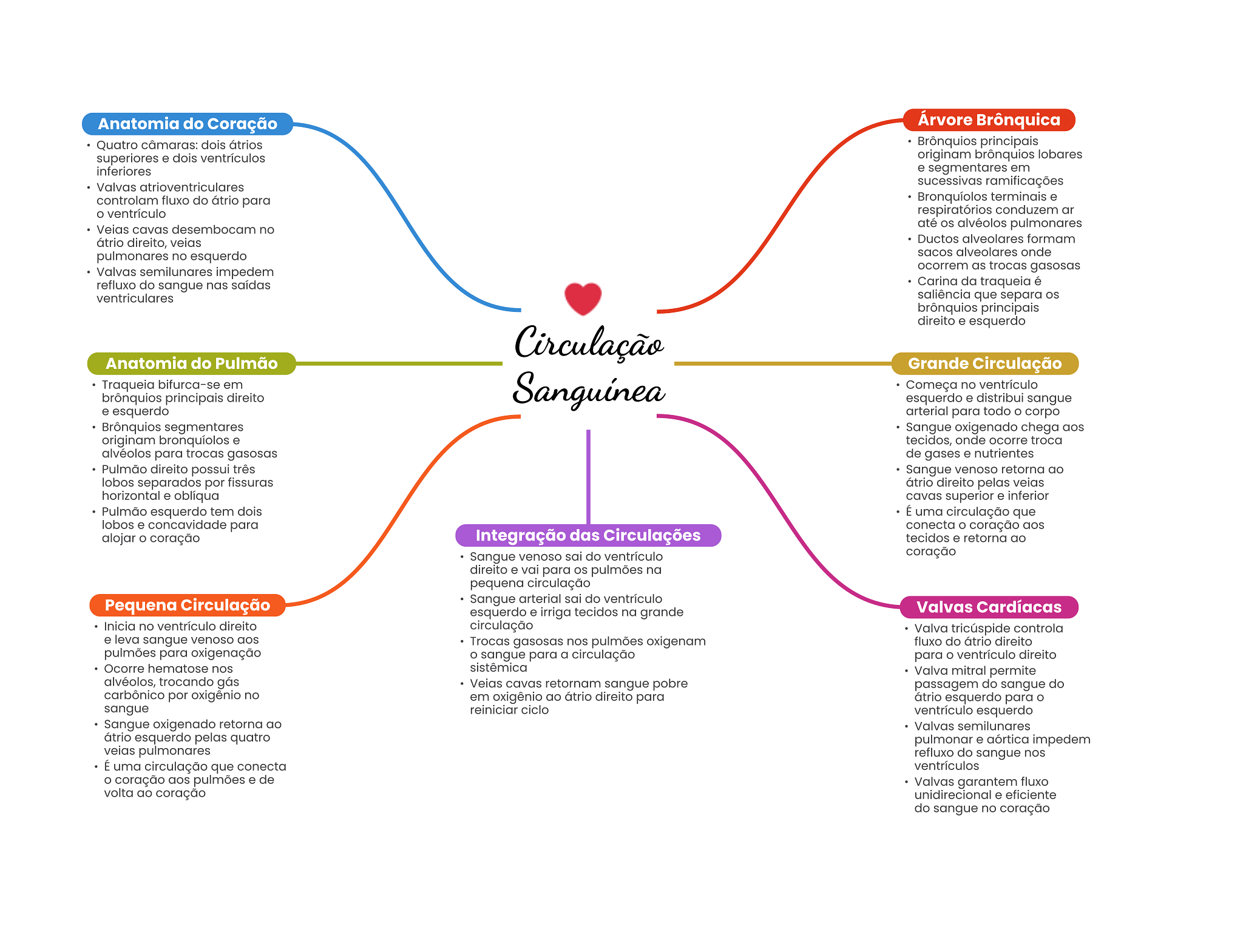 Anatomia do Coração Árvore Brônquica Quatro câmaras: dois átrios Brônquios principais superiores e dois ventrículos originam brônquios lobares inferiores e segmentares em Valvas atrioventriculares sucessivas ramificações controlam fluxo do átrio para Bronquíolos terminais e ventrículo respiratórios conduzem ar Veias cavas desembocam no até alvéolos pulmonares átrio direito, veias Ductos alveolares formam pulmonares no esquerdo sacos alveolares onde Valvas semilunares impedem ocorrem as trocas gasosas refluxo do sangue nas saídas Carina da traqueia é ventriculares saliência que separa brônquios principais direito e esquerdo Circulação Anatomia do Pulmão Grande Circulação Traqueia bifurca-se em brônquios principais direito Sanguínea Começa no ventrículo esquerdo e distribui sangue e esquerdo arterial para todo corpo Brônquios segmentares Sangue oxigenado chega aos originam bronquíolos e tecidos, onde ocorre troca alvéolos para trocas gasosas de gases e nutrientes Pulmão direito possui três Sangue venoso retorna ao lobos separados por fissuras átrio direito pelas veias horizontal e oblíqua cavas superior e inferior Pulmão esquerdo tem dois É uma circulação que lobos e concavidade para conecta O coração aos alojar coração Integração das Circulações tecidos e retorna ao Sangue venoso sai do ventrículo coração direito e vai para OS pulmões na pequena circulação Pequena Circulação Sangue arterial sai do ventrículo esquerdo e irriga tecidos na grande Valvas Cardíacas Inicia no ventrículo direito circulação Valva tricúspide controla e leva sangue venoso aos Trocas gasosas nos pulmões oxigenam fluxo do átrio direito pulmões para oxigenação O sangue para a circulação para O ventrículo direito Ocorre hematose nos sistêmica Valva mitral permite alvéolos, trocando gás Veias cavas retornam sangue pobre passagem do sangue do carbônico por oxigênio no em oxigênio ao átrio direito para átrio esquerdo para sangue reiniciar ciclo ventrículo esquerdo Sangue oxigenado retorna ao Valvas semilunares átrio esquerdo pelas quatro pulmonar e aórtica impedem veias pulmonares refluxo do sangue nos É uma circulação que conecta ventrículos coração aos pulmões e de Valvas garantem fluxo volta ao coração unidirecional e eficiente do sangue no coração