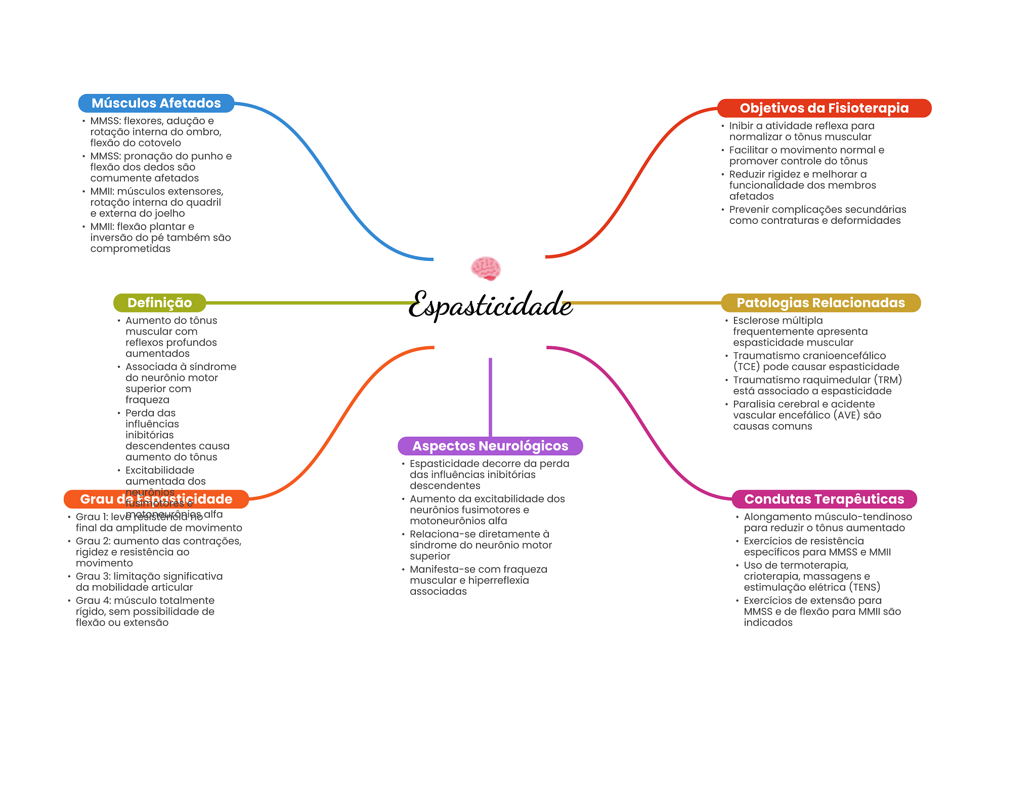 Músculos Afetados Objetivos da Fisioterapia MMSS: flexores, adução e Inibir a atividade reflexa para rotação interna do ombro, normalizar tônus muscular flexão do cotovelo Facilitar movimento normal e MMSS: pronação do punho e flexão dos dedos são promover controle do tônus comumente afetados Reduzir rigidez e melhorar a funcionalidade dos membros MMII: músculos extensores, afetados rotação interna do quadril e externa do joelho Prevenir complicações secundárias como contraturas e deformidades MMII: flexão plantar e inversão do pé também são comprometidas Definição Espasticidade Patologias Relacionadas Aumento do tônus Esclerose múltipla muscular com frequentemente apresenta reflexos profundos espasticidade muscular aumentados Traumatismo cranioencefálico Associada à síndrome (TCE) pode causar espasticidade do neurônio motor Traumatismo raquimedular (TRM) superior com está associado a espasticidade fraqueza Paralisia cerebral e acidente Perda das vascular encefálico (AVE) são influências causas comuns inibitórias descendentes causa Aspectos Neurológicos aumento do tônus Espasticidade decorre da perda Excitabilidade das influências inibitórias aumentada dos descendentes Grau de Espasticidade Aumento da excitabilidade dos Condutas Terapêuticas neurônios fusimotores e Grau 1: motoneurônios alfa Alongamento músculo-tendinoso final da amplitude de movimento Relaciona-se diretamente à para reduzir tônus aumentado Grau 2: aumento das contrações, síndrome do neurônio motor Exercícios de resistência rigidez e resistência ao superior específicos para MMSS e MMII movimento Manifesta-se com fraqueza Uso de termoterapia, Grau 3: limitação significativa muscular e hiperreflexia crioterapia, massagens e da mobilidade articular associadas estimulação elétrica (TENS) Grau 4: músculo totalmente Exercícios de extensão para rígido, sem possibilidade de MMSS e de flexão para MMII são flexão ou extensão indicados