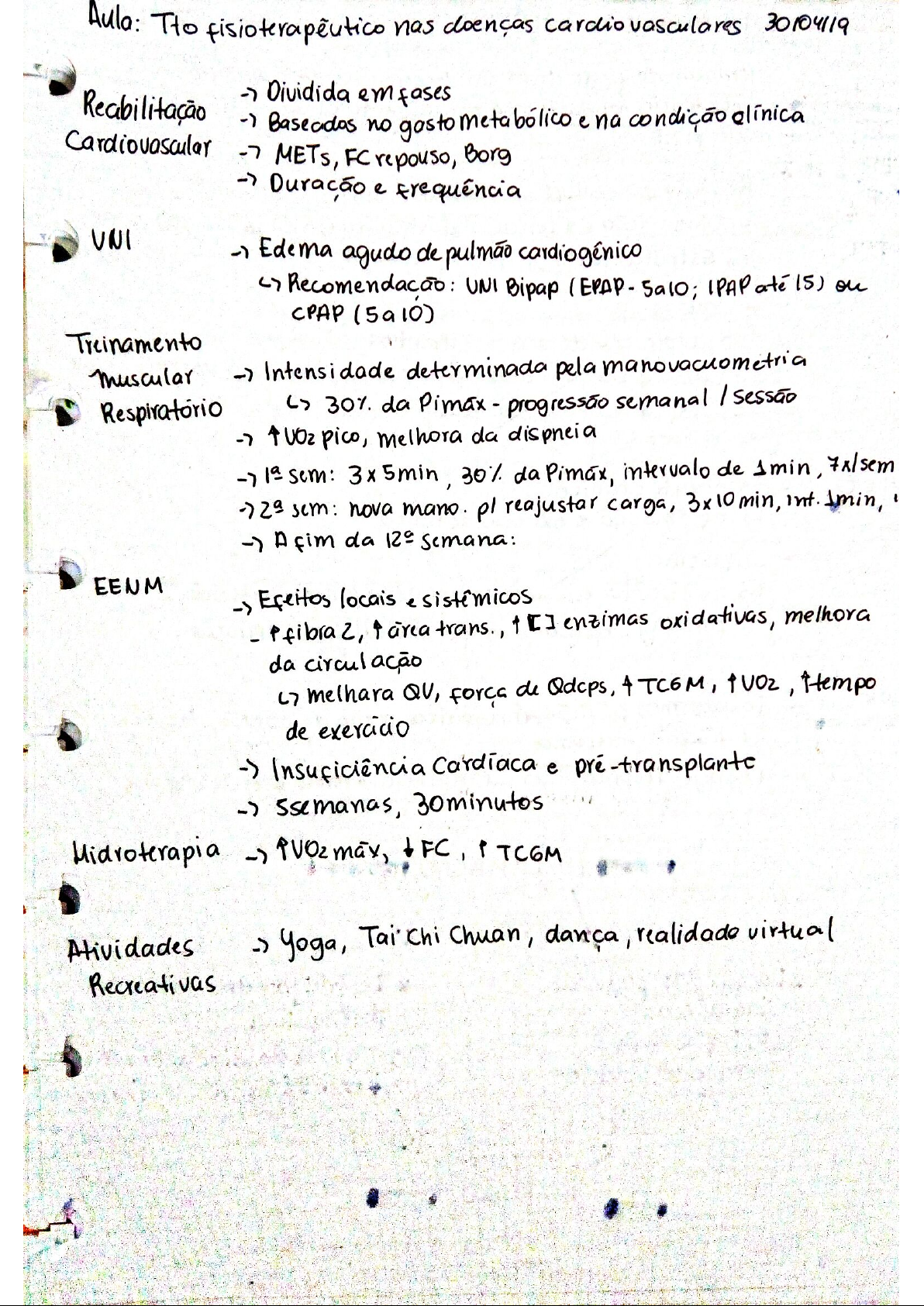 Aula: Tto doenças cardiovasculares 30/04/19 Reabilitação Dividida emfases no gasto e na condição Cardiovascular METs, FC repouso, Borg Duração e Edema agudo de pulmão cardiogénico UNI Bipap (EPAP- IPAP até (5) on CPAP (5a10) Treinamento muscular Intensidade determinada pela manovacuometria Respiratorio 30% da Pimax progressão semanal / UO2 pico, melhora da dispneia 1a sem: 3x 5min, 30% da Pimax, intervalo de 1min, 7x/sem 2a sem: nova mano. pl reajustar carga, 3x min, int. fim da EENM locais e fibra 2, cirea trans., [] enzimas oxidativas, melhora da circul melhara QV, forca de Qdcps, 4 TC6M, Hempo de exercicio Insuficiência Cardiaca e pré-transplante ssemanas, 30minutos Midroterapia FC, Atividades Tai Chuan, realidade virtual RecreativasAula: Doencas Respiratórias Obstrutivas do de ar em decorrencia do aumento na por fluxo obstrução parcial outotal das VAs em qual- L 80% quer nivel VEG L70% CUF - Reducão do calibre da UA da retração elástica do parenquima pulmonar Estreitamento direto da luz - Causas fibrose cística, bronquiectasias, tumores invasivos aspiração de corpos estranhos Asma e bronquiolite DPOC - Bronquite crônica inflamação e excesso de muco - Enfisema os alveó los crescem, Se uneme perdem a elasticidade ea força pl expulsar ar, que dificulta a respiração Etiologia - Tabagismo, poluição atmosférica, poeira de carvão, deficiência de a1 anti-tripsina - Doenças respiratórias na infância, renda e escolaridade INFLAMAÇÃO Doença das pequenas Destruição do vias aéreas inflamação e remodelamento ruptura das alveolares encolhimento elástica LIMITAÇÃO AO FLUXO AÉREO- Agressão inflamação, broncoespasmo e hiper- Fisiopatologia trofia das cél. calciformes - Obstrução por de muco Enfisema: aco- - Aprisionamento distal (auto-peep) metimento a da - Miperinsuflação Bronquiectasia: - da ciliar e modificação na reologia do muco - Miperreatividade brônquica componente - Destruição da membrana capilar dos alvéolos inflamatório - Destruição do tecido pulmonar com perda da elastância Secreção - Destruição da membrana capilar dos - Assincronia da levando a hipoxemia e hipercapnia - Insuficiência cardíaca do (cor pulmonale) - podegerar uma TUP Quadro - Tosse produtiva tosse crônica (73m) - Dispneia MRC - Sibilância por - Escarro Efeitos - Caquexia da DPOC - Disf. muscular - Sintomas - Reducão da capacidade - Doencas cardio- de exercício vasculares - osteoporose fadiga Efeitos - Estado de saúde - Exarcebações - - Prognóstico - câncer Diagnóstico - Dificil em etapa precoce - Enfisema: dispneia continua - Bronquite crônica: dispneia esporádica, tosse produtiva Exame físico tx em tonel, hiper timpanismo, SP sibilos, ICDCAT Questionarios escore > 10 SGRQ "importante" quando Espirometria - 80% 70% - Resposta ao BD - reduzida Gasometria - hipoxemia e hipercapnia Testede Estadiamento (Leve): VEF1 dispneia nas exarcebações e normais Gold - Gold 2 50k dispneia leve normais Pacientes com - Gold 3 (severa): 30% ≤ VEF1 L 50%, sem dispneia incapacitante PaOz sem hipercapnia 470% - Gold 4 (muito grave): L 30% dispneia incapacitante com hipercapnia Avaliação Radidog. hiperinsuflação, bolhas, rebaixamento das coração em gota Bronquite crônica em crise espessamento da parede bronquica Tratamento Cessação do tabagismo Tratar componente reversivel - : anticoligergicos (Brometo anti-Ach e agonistas, agonistas longa duração)Corticoeste- controverso Indicado quando há componente - roides das ou em casos Inalatório oral - : PaO2 entre 56 e 59 presenca ae cor pulmonale) de pelo menos - vacina pneumococo), reabilitação pulmonar - Internação grave - dispneia piora dos níveis de presença de acidose respiratória de complicações PNM, TEP, pneumotorax descompensação de condições associadas ICC, DM internação social VNI com em Caso - i primeira escolha na exarcebação (acidose em + nivel resolução da IRpA de intubação e mortalidade (relacionada cl extubação hipercapnia) - UMI a tempo atentar. se a possibilidade de assincronia objetivo: da musc. 4 8h de evitar lesão induzida pelo ventilador, melhorar agudo de troca ga sosa, hiper- insuflação pulmonar, melhorar sincronia Evitar: VC = do peso predito ≤ 7,2 Fluxo = 40-60L min I.E 1:3 menor possivel =- Processo de inflamação crônica das associada a hiper- Asma responsividade das com sintomas de obstrução de intra pulmonar generalizado e reversivel espontanea- mente ou com tratamento PROCESSO Estreitamento brônquico Miperresponsividade ereversivel brônquica resposta contração do m. liso tora exagerada ao esti- edema de mucosa mulo Ciclo de agressão reparo pode levar a frequentes alt. estruturais irreversiveis - Gravidade da doenca, atopia, tabagismo, Q persistência natural da asma no adulto alergias Sibilância recorrente na criança: de eczema nos primeiros 3 anos de vida, MF de asma, rinite alêrgica nos primeiros 3anos de vida, sibilância sem resfriado e nofilia sanguínea 3% - Tosse principalmente a noite ou início da manhã - Dispncia - Sibilância - Opressão torácica Diagnóstico - ou mais sintomas - Espirometria BD 200mL on 12% do previsto CVF - Teste de broncoprovocação - seriadas de PFE matinais e vespertinas, > 20% + diferença entre valores e dividida pelo expressa em %Tratamento - manter normal - Aliviar obstrução de fluxo aéreo - Reduzir inflamação das UAS Oxigenoterapia SaOz gestantes e cardiopatas 94% Broncodilatadores 12 linha de tto pl crise aerossol dosimetrado nebulizador de fluxo continuo + Bz agonista exarcebação grave Persistência da sibilância após BD, PFE 70% UNI desconforto respiratório e hiper capnia Objetivos: adequada oxigenação, Umin suficiente pl manter pll adequado, cuidado com a pulmonar (VC, fr, v) Parâmetros: VC = Pinspmaxima Pplato L 30cm M2O Auto-peep L Fluxo = 60/100 min Bronquiectasia - e dos brônquios, em decorrência da destruição dos componentes e muscular de sua parede com supuraçãol