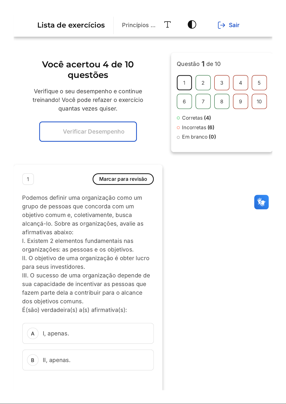 Você acertou 4 de 10 questões Verifique o seu desempenho e continue treinando! Você pode refazer o exercício quantas vezes quiser. Verificar Desempenho A B 1 Marcar para revisão Podemos definir uma organização como um grupo de pessoas que concorda com um objetivo comum e, coletivamente, busca alcançá-lo. Sobre as organizações, avalie as afirmativas abaixo: I. Existem 2 elementos fundamentais nas organizações: as pessoas e os objetivos. II. O objetivo de uma organização é obter lucro para seus investidores. III. O sucesso de uma organização depende de sua capacidade de incentivar as pessoas que fazem parte dela a contribuir para o alcance dos objetivos comuns. É(são) verdadeira(s) a(s) afirmativa(s): I, apenas. II, apenas. Questão 1 de 10 Corretas (4) Incorretas (6) Em branco (0) 1 2 3 4 5 6 7 8 9 10 Lista de exercícios Princípios … Sair C D E III, apenas. I e II apenas. II e III apenas. Resposta incorreta Opa! A alternativa correta é a letra C. Confira o gabarito comentado! Gabarito Comentado As organizações são compostas por três elementos fundamentais: as pessoas, a comunicação e os objetivos e propósitos. A afirmativa I está parcialmente correta, pois desconsidera a comunicação como um elemento fundamental. A afirmativa II é limitada, pois embora muitas organizações busquem lucro, existem organizações, como as não-governamentais, cujo objetivo principal não é o lucro. A afirmativa III está correta, pois o sucesso de uma organização realmente depende de sua capacidade de incentivar as pessoas que a compõem a contribuírem para os objetivos comuns. Portanto, a alternativa correta é a C, que afirma que apenas a afirmativa III é verdadeira. 2 Marcar para revisão As lideranças são fundamentais no desenvolvimento das organizações. Considerando a importância do papel das A B C D E lideranças nas organizações, analise quais dessas funções são normalmente assumidas por elas: I. Coordenar o trabalho com outras áreas. II. Transmitir os valores da organização no grupo. III. Identificar os talentos dos seguidores. IV. Redigir os contratos dos trabalhadores. V. Avaliar o desempenho dos colaboradores. Estão corretos apenas os itens: I e II. II e III. III e IV. I, II, III e IV. IV e V. Resposta correta Parabéns, você selecionou a alternativa correta. Confira o gabarito comentado! Gabarito Comentado Redigir os contratos dos trabalhadores cabe ao RH após as lideranças terem deliberado favoravelmente acerca da contratação. 3 Marcar para revisão A B C D E O estilo de liderança adotado nas empresas vem mudando ao longo dos anos, com o líder deixando de ser uma figura autocrática e passando a ser uma figura que direciona seus liderados em torno de um propósito através de níveis de confiança essenciais. Segundo Erlich, esses níveis são: Confiança ética, confiança emocional e confiança técnica. Confiança ética, confiança emocional e confiança hierárquica. Confiança hierárquica, confiança emocional e confiança técnica. Confiança comportamental, confiança ética e confiança emocional. Confiança hierárquica, confiança emocional e confiança comportamental. Resposta incorreta Opa! A alternativa correta é a letra A. Confira o gabarito comentado! Gabarito Comentado De acordo com Erlich, os três níveis de confiança essenciais na liderança são: ética, emocional e técnica. A confiança ética se refere à crença dos liderados na integridade do líder e na adesão a um conjunto de princípios aceitáveis. A confiança emocional é estabelecida quando o liderado percebe que o líder A B C D E deseja o melhor para ele, sem esperar nada em troca. Por fim, a confiança técnica é conquistada quando o liderado reconhece que o líder possui o conhecimento e a habilidade necessários para desenvolvê-lo em seu campo de atuação. 4 Marcar para revisão Em uma organização que adota a holocracia, os gestores passam a atuar como facilitadores, e não mais como figuras centralizadoras de poder. Considerando esse cenário, qual seria um impacto direto dessa prática sobre as equipes de trabalho? Redução da necessidade de especialização técnica entre os colaboradores Aumento da dependência de ordens superiores para execução de tarefas. Diminuição do envolvimento coletivo nos processos decisórios Fortalecimento da corresponsabilidade e da agilidade nos processos Reforço do controle disciplinar através de regras padronizadas. Resposta incorreta A B C Opa! A alternativa correta é a letra D. Confira o gabarito comentado! Gabarito Comentado Na holocracia, a descentralização das decisões permite que as equipes se tornem mais responsáveis por suas entregas e mais ágeis, já que não há necessidade de esperar por aprovações hierárquicas 5 Marcar para revisão "Na Southwest Airlines o departamento de recursos humanos é um dos mais importantes da companhia - com 125 membros. O departamento de recursos humanos controla todas as contratações da empresa, tendo estado muito ocupado ultimamente. Em dez anos, o quadro de pessoal da Southwest aumentou 97%. A administração da companhia adota uma abordagem informal para entrevistar candidatos." (Zellner, Business Welk,1995, p.69). Neste caso, o procedimento utilizado pela companhia ocorre no processo de: Recrutamento Promoção Avaliação do desempenho D E Análise de currículo Seleção Resposta incorreta Opa! A alternativa correta é a letra E. Confira o gabarito comentado! Gabarito Comentado A questão trata de entrevista de pessoas para contratação. Esta atividade é realizada no processo de seleção, quando são avaliadas as qualificações e as competências dos recrutados e sua adequação aos cargos disponíveis para preenchimento. 6 Marcar para revisão Uma organização é constituída por várias áreas que se integram para contribuir para o objetivo comum. Analise as afirmativas abaixo acerca das principais áreas de uma organização: I. A 