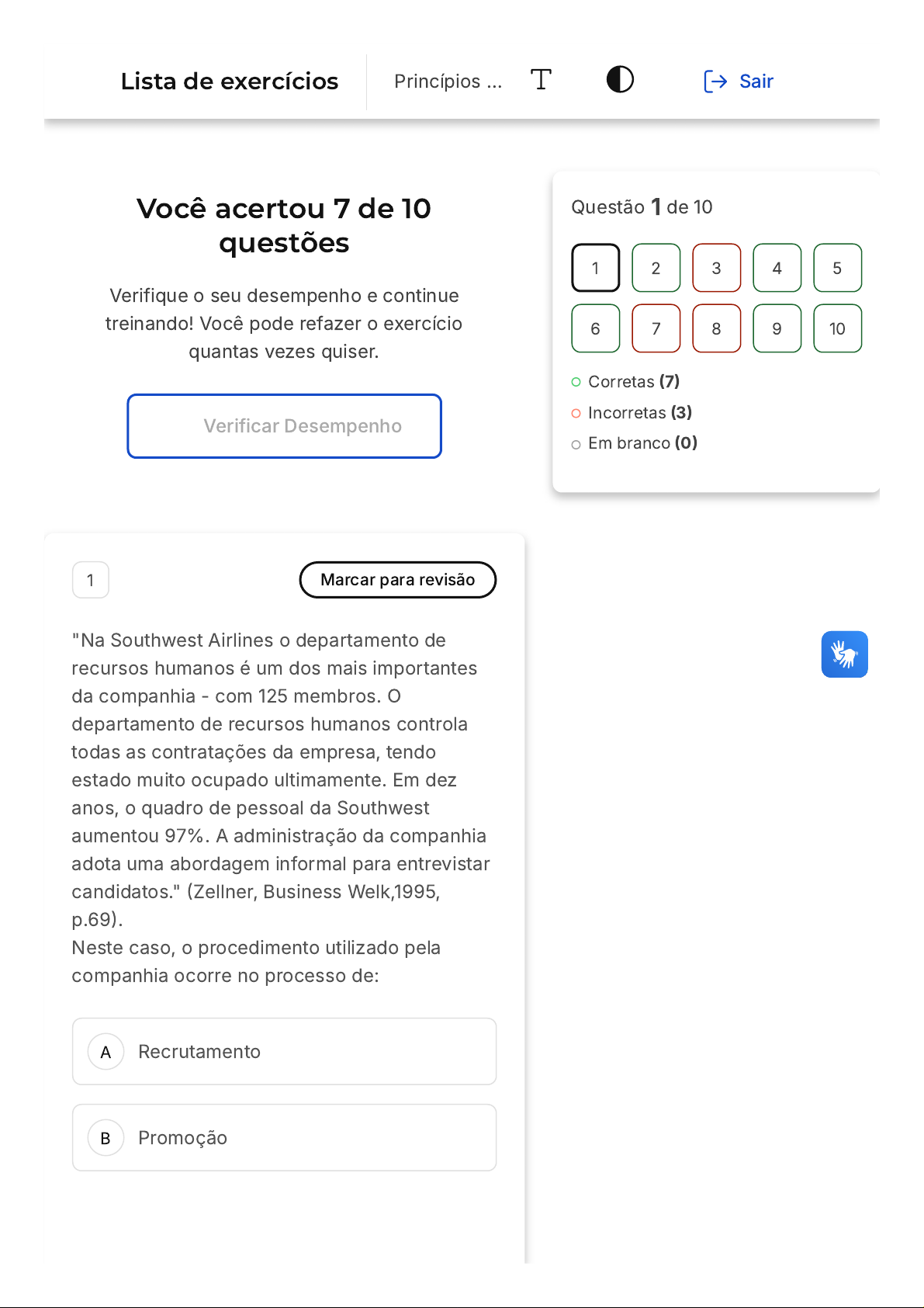 Você acertou 7 de 10 questões Verifique o seu desempenho e continue treinando! Você pode refazer o exercício quantas vezes quiser. Verificar Desempenho A B 1 Marcar para revisão "Na Southwest Airlines o departamento de recursos humanos é um dos mais importantes da companhia - com 125 membros. O departamento de recursos humanos controla todas as contratações da empresa, tendo estado muito ocupado ultimamente. Em dez anos, o quadro de pessoal da Southwest aumentou 97%. A administração da companhia adota uma abordagem informal para entrevistar candidatos." (Zellner, Business Welk,1995, p.69). Neste caso, o procedimento utilizado pela companhia ocorre no processo de: Recrutamento Promoção Questão 1 de 10 Corretas (7) Incorretas (3) Em branco (0) 1 2 3 4 5 6 7 8 9 10 Lista de exercícios Princípios … Sair C D E Avaliação do desempenho Análise de currículo Seleção Resposta correta Parabéns, você selecionou a alternativa correta. Confira o gabarito comentado! Gabarito Comentado A questão trata de entrevista de pessoas para contratação. Esta atividade é realizada no processo de seleção, quando são avaliadas as qualificações e as competências dos recrutados e sua adequação aos cargos disponíveis para preenchimento. 2 Marcar para revisão Juliana é gestora de uma empresa de cosméticos que dá a seus colaboradores um bônus de 10% do salário ao final do mês quando a meta de vendas é batida. O tipo de autoridade que Juliana exerce sobre seus colaboradores é de: A B C D E Coerção Legitimidade Recompensa Competência Carisma Resposta correta Parabéns, você selecionou a alternativa correta. Confira o gabarito comentado! Gabarito Comentado Existem diferentes tipos de autoridade que podem ser exercidas em uma organização, cada uma refletindo uma base de poder específica. A autoridade coercitiva é aquela que se baseia em punições ou sanções, utilizando a força e a capacidade de uma pessoa para impor regras. A autoridade legitimada, por sua vez, tem sua base de poder na hierarquia da organização. Já a autoridade de recompensa, que é o caso de Juliana, se estabelece no reconhecimento de certos comportamentos ou metas atingidas por meio de recompensas materiais ou sociais, como o bônus de 10% do salário. A autoridade baseada na competência se apoia na competência, conhecimentos e atitudes distintivas que a pessoa possui. Por fim, a autoridade carismática tem seu poder baseado em uma imagem favorável, A B C D E que leva os demais a acreditarem e admirarem suas ideias. 3 Marcar para revisão José trabalha na área de Gestão de Pessoas da empresa SERVIÇOS LTDA. Entre suas atividades, encontra(m)-se: I - Determinar as necessidades de recursos humanos; II - Avaliar o impacto das novas tecnologias e de novas formas de organização do trabalho; III - Coordenar, monitorar e avaliar todas as atividades e os fluxos financeiros internos. Está correto o que é afirmado em: I, apenas. III, apenas. I e II, apenas. I, II e III. II e III, apenas. Resposta incorreta Opa! A alternativa correta é a letra C. Confira o gabarito comentado! Gabarito Comentado A B C As atividades de José, que trabalha na área de Gestão de Pessoas, incluem a determinação das necessidades de recursos humanos (I) e a avaliação do impacto das novas tecnologias e de novas formas de organização do trabalho (II). Essas duas afirmações estão corretas. No entanto, a coordenação, monitoramento e avaliação de todas as atividades e fluxos financeiros internos (III) não fazem parte das responsabilidades de sua função. Essas atividades são, na verdade, responsabilidades da área de Finanças da organização. Portanto, a alternativa correta é a C, que afirma que apenas as atividades I e II estão corretas. 4 Marcar para revisão Pedro é gestor de uma startup na área de saúde e permite que empregados tomem decisões acerca de suas áreas de atuação e apenas lhe informem da decisão tomada. Podemos dizer que Pedro é um líder: Autocrático Carismático Democrático D E Persuasivo Liberal Resposta correta Parabéns, você selecionou a alternativa correta. Confira o gabarito comentado! Gabarito Comentado De acordo com a teoria dos estilos de liderança, existem três tipos principais de líder: Autocrático, Democrático e Liberal. O líder Autocrático é aquele que toma todas as decisões sozinho, sem a participação dos colaboradores. O líder Democrático, por outro lado, busca a participação ativa de seus colaboradores na tomada de decisões. Já o líder Liberal, como é o caso de Pedro, descentraliza a tomada de decisões, permitindo que os colaboradores tomem decisões acerca de suas áreas de atuação e apenas o informem sobre a decisão tomada. Os termos Persuasivo e Carismático, embora possam descrever características de um líder, não são considerados estilos de liderança de acordo com essa teoria. 5 Marcar para revisão As lideranças são fundamentais no desenvolvimento das organizações. Considerando a importância do papel das lideranças nas organizações, analise quais A B C D E dessas funções são normalmente assumidas por elas: I. Coordenar o trabalho com outras áreas. II. Transmitir os valores da organização no grupo. III. Identificar os talentos dos seguidores. IV. Redigir os contratos dos trabalhadores. V. Avaliar o desempenho dos colaboradores. Estão corretos apenas os itens: I e II. II e III. III e IV. I, II, III e IV. IV e V. Resposta correta Parabéns, você selecionou a alternativa correta. Confira o gabarito comentado! Gabarito Comentado Redigir os contratos dos trabalhadores cabe ao RH após as lideranças terem deliberado favoravelmente acerca da contratação. 6 Marcar para revisão A B C D E Podemos definir uma organização como um grupo de pessoas que concorda com um objetivo comum e, coletivamente, busca alcançá-lo. Sobre as organizações, avalie as afirmativas abaixo: I. Existem 2 elementos fundamentais nas organ