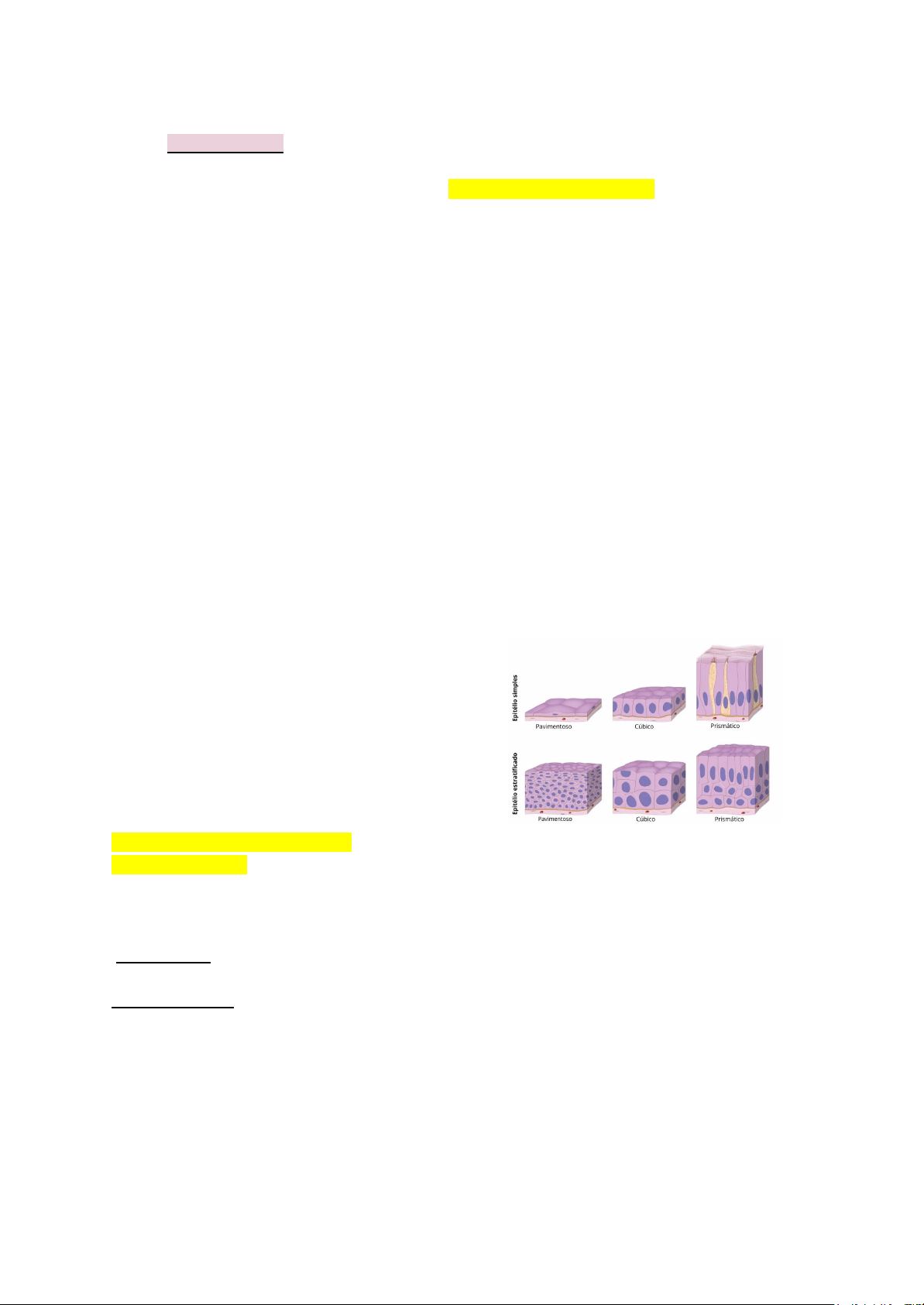 Revisão - histologia geral - Tecido epitelial: função de revestimento e secreção (glândulas) Principal característica: Células justapostas com quase ausência de substâncias intracelulares (auxilia na barreira de patógenos) + entre as células justapostas tem o glicocálix, que tem o papel de adesão. Vai apresentar um complexo unitivo bem desenvolvido - conjunto de especializações de membrana celular p/ promover adesão entre as células vizinhas - principal componente: desmossomos (constituído de proteínas associadas a membrana celular) Outras especializações do téc. epitelial: - Microvilosidade: projeções digitiformes na borda livre da MP, com o papel de aumentar a superfície de membrana. Absorção, excreção, secreção…. Interdigitações - projeções na borda lateral da membrana complementares a projeções equivalentes nas células vizinhas. - Junções comunicantes: proteínas que possibilitam a passagem de substância entre citoplasma de células vizinhas - Avascular: não apresenta vasos sanguíneos. Sua nutrição acontece por difusão célula a célula a partir dos capilares sanguíneos do tecido conjuntivo subjacente (lâmina própria do epitélio: tecido conjuntivo) Entre o tecido epitelial e o conjuntivo fica a lâmina basal (camada de proteínas), que vai conectar o epitélio ao conjuntivo! - Tecido epitelial tem que ser delgado ou fino com menos camadas. obs: o epitélio mais espesso é o da sola do pé e mesmo assim tem um acúmulo de tecido algumas vezes. - Células poliédricas: por causa da justaposição das células, que acabam gerando interfaces planas entre elas. Colunar ou cilíndricas: núcleo alongado Cúbica: núcleo esférico Pavimentosa: núcleo achatado Obs: a forma do núcleo indica o formato da célula. Classificação dos tecidos epiteliais: 1. Revestimento: serve para revestimento e função de troca com o meio. (trocas gasosas, absorção, excreção...) 1.1 Simples: 1 camada de célula que é mais fácil de atravessar, facilitando trocas. + frágil. ex:aovelos pulmonares, intestino 1.2 Estratificado: várias camadas de células, sendo mais difícil de atravessar, dificultando as trocas. + resistentes. ex: pele Epitélios simples pavimentoso (mais frágil): alvéolos pulmonares, endotélio capilar Epitélio simples cúbico: túbulos renais. Epitélio simples colunar: intestino com microvilosidades Epitélio estratificado pavimentoso: *pode ser queratinizado (impermeável à água): epiderme da pele * não queratinizado (não é impermeável à água): mucosa de boca. mucosa: MP que vai revestir o órgão por dentro. serosa: MP que vai revestir o órgão por fora. Epitélio estratificado cúbico: ovário. Epitélio estratificado colunar (mais resistente de todos): uretra. 1.3 pseudoestratificado: uma única camada de células com núcleos em alturas variadas. Por isso que vai ter a falsa impressão de que ele é estratificado Epitélio pseudoestratificado colunar ciliado (revestimento das vias aéreas): traqueia, brônquios. c/ presença de células caliciformes: presença de muco para reter as células do ar. cilios com o papel de "varrer” o muco. Epitélio estratificado pavimentoso queratinizado - pele Tecido epitelial de transição: com número de camadas de células e a forma das células variando de acordo com o grau de contração do órgão - exclusivo da bexiga. - Distendidas: poucas camadas; células pavimentosas. - Contraídas: muitas camadas, células cúbicas. 2. Secreção ou glandular: Acontece em órgãos especializados em secreção. 2.1: Exócrinas: com ductos secretor; eliminam secreção fora do corpo ou em cavidades do corpo. Ex.: sudoríparas, sebáceas e salivares. Obs: em formato de tubo: tubulada. Envelada no final: tubular enovelada. Acinosa (porção secretora arredondada): sebácea. 2.2 Endócrinas: sem ducto secretor; eliminam a secreção no sangue. 2.3 Anfícrinas ou mistas: pâncreas parte exo: ácinos e a parte endo: ilhotas de langerhans Glândula endócrina. Classificação das glândulas: - podem ser unicelulares e pluricelulares. - mucosas (secreção pastosa; base de glicoproteínas; células caliciformes) e serosas (com secreção fluida (glândulas salivares) Holócrinas: eliminam todo o citoplasma da célula na secreção. Ex: sebácea: secretam lipídios; papel de impermeabilizar; várias "gotas” de lipídios e acabam rompendo. Merócrina: não eliminam citoplasma na secreção. Células permanecem intactas; glândulas salivares e sudoríparas. Apócrina: um pouquinho das anteriores; elimina parte do citoplasma na secreção. Ex.: glândulas mamárias e sudoríparas (axilas e perianais) - Tecido conjuntivo: células espaçadas com abundância de material intracelular; Apresentam variedades de funções: preenchimento de espaços e conexão entre outros tecidos; reserva, isolamento térmico (tecido adiposo) Componentes dos tecidos conjuntivos 1.Substâncias intercelulares: líquido intersticial: constituído de água e sais. substâncias amorfas - geleia de Wharton Fibras proteicas: proteínas alongadas. Colágenas: colágeno - resistência. Elásticas: elastina - elasticidade. Reticulares: forma uma rede para abrigar as células. 2. Células c/ grande diversidade celular Fibroblastos: + abundantes para produzir substâncias intercelulares (substância amorfa +fibras proteicas). Apresentam um núcleo grande e circular fibrocitos:inativo; podem voltar a ser fibroblastos para atuarem na cicatrização. Sem ramificações, núcleos fusiformes, pequenos e escuros. Mastócitos: células irregulares com gânglios de heparina e histamina (principais anticoagulantes e mediador de alergia) com núcleo reniforme. obs:diapedese: saída do leucócito do vaso sanguíneo. Plasmócitos: células ovaladas com núcleo esférico para defesa de produção de anticorpo. Células mesenquimais indiferenciadas: células-tronco com o papel de originar algumas células do tecido conjuntivo. Tecido conjuntivo