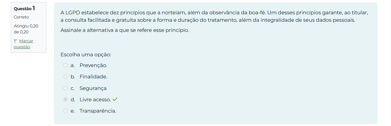 Questão 1 A LGPD estabelece dez princípios que a norteiam, além da observância da boa-fé. Um desses princípios garante, ao titular, Correto a consulta facilitada e gratuita sobre a forma e duração do tratamento, além da integralidade de seus dados pessoais. Atingiu 0,20 de 0,20 Assinale a alternativa a que se refere esse princípio. P Marcar questão Escolha uma opção: a. Prevenção. b. Finalidade. C. Segurança d. Livre acesso. e. Transparência.