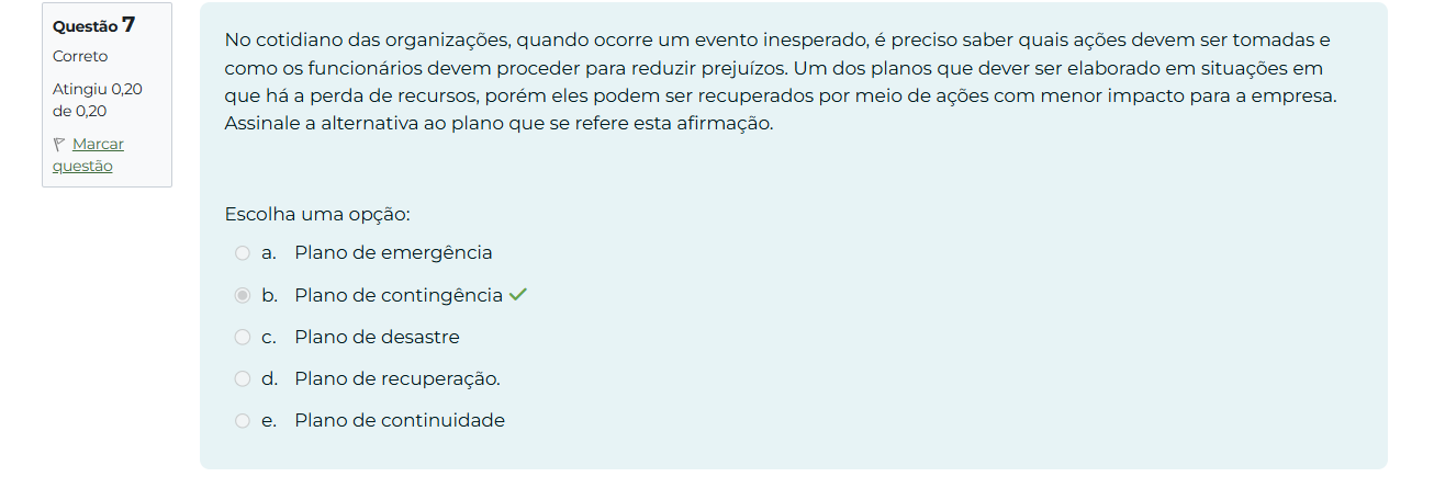 Questão 7 No cotidiano das organizações, quando ocorre um evento inesperado, é preciso saber quais ações devem ser tomadas e Correto como OS funcionários devem proceder para reduzir prejuízos. Um dos planos que dever ser elaborado em situações em Atingiu 0,20 que há a perda de recursos, porém eles podem ser recuperados por meio de ações com menor impacto para a empresa. de 0,20 Assinale a alternativa ao plano que se refere esta afirmação. Marcar questão Escolha uma opção: a. Plano de emergência b. Plano de contingência C. Plano de desastre d. Plano de recuperação. e. Plano de continuidade