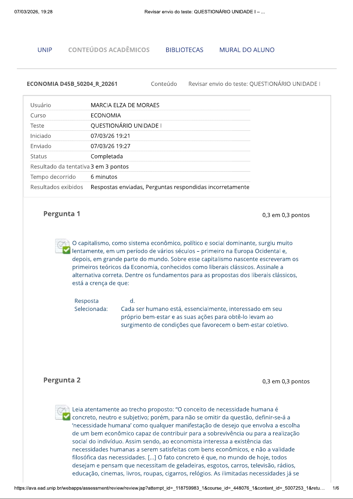 07/03/2026, 19:28 Revisar envio do teste: QUESTIONÁRIO UNIDADE UNIP CONTEÚDOS ACADÊMICOS BIBLIOTECAS MURAL DO ALUNO ECONOMIA D45B_50204_R_20261 Conteúdo Revisar envio do teste: QUESTIONÁRIO UNIDADE I Usuário MARCIA ELZA DE MORAES Curso ECONOMIA Teste QUESTIONÁRIO UNIDADE Iniciado 07/03/26 19:21 Enviado 07/03/26 19:27 Status Completada Resultado da tentativa 3 em 3 pontos Tempo decorrido 6 minutos Resultados exibidos Respostas enviadas, Perguntas respondidas incorretamente Pergunta 1 0,3 em 0,3 pontos O capitalismo, como sistema econômico, político e social dominante, surgiu muito lentamente, em um período de vários séculos primeiro na Europa Ocidental e, depois, em grande parte do mundo. Sobre esse capitalismo nascente escreveram os primeiros teóricos da Economia, conhecidos como liberais clássicos. Assinale a alternativa correta. Dentre os fundamentos para as propostas dos liberais clássicos, está a crença de que: Resposta d. Selecionada: Cada ser humano está, essencialmente, interessado em seu próprio bem-estar e as suas ações para obtê-lo levam ao surgimento de condições que favorecem bem-estar coletivo. Pergunta 2 0,3 em 0,3 pontos Leia atentamente ao trecho proposto: "O conceito de necessidade humana é concreto, neutro e subjetivo; porém, para não se omitir da questão, definir-se-á a 'necessidade humana' como qualquer manifestação de desejo que envolva a escolha de um bem econômico capaz de contribuir para a sobrevivência ou para a realização social do indivíduo. Assim sendo, ao economista interessa a existência das necessidades humanas a serem satisfeitas com bens econômicos, e não a validade filosófica das necessidades. [...] fato concreto é que, no mundo de hoje, todos desejam e pensam que necessitam de geladeiras, esgotos, carros, televisão, rádios, educação, cinemas, livros, roupas, cigarros, relógios. As ilimitadas necessidades já se 1/607/03/2026, 19:28 Revisar envio do teste: QUESTIONÁRIO UNIDADE expandem para fora da esfera biológica da sobrevivência". (SILVA, C.R. L. da; LUIZ, S. Economia e mercados: introdução à economia. ed. São Paulo: Saraiva, 2010, p. 6-7). A partir da leitura do trecho proposto, é possível: I. Perceber que se trata de uma das primeiras investigações da Ciência Econômica, ou seja, da questão relacionada ao atendimento às necessidades humanas; II. Dizer que as necessidades humanas são ilimitadas, surgindo, então, problema econômico fundamental; III. Entender que as necessidades humanas renovam-se com tempo em função da criação de novos desejos. Considerado isso, é possível afirmar que: Resposta Selecionada: Estão corretas a I, a II e a III. e. Pergunta 3 0,3 em 0,3 pontos Observe a seguinte definição de bens econômicos e bens livres: "Tudo aquilo que tem utilidade, com ou sem valor econômico. ar, por exemplo, é um bem livre, mas minério de ferro é um bem econômico, porque é escasso e depende do trabalho humano para ser obtido. Os bens econômicos se dividem em cinco grupos principais. São eles: bens de capital ou de produção (máquinas e equipamentos); bens de consumo (brinquedos, um par de sapatos aqueles que podem ser comprados pelas pessoas depois de um processo de produção ou industrialização); bens de consumo durável (máquina de lavar roupa, imóvel que só são trocados após períodos longos de uso); bens de consumo semidurável (carro, roupa os que precisam ser trocados periodicamente); bens de consumo não durável (alimentos)". Disponível em: http://www.portalbrasil.net/economia_glossario.htm. Acesso em: 23 jan. 2019. Consideremos, agora, que as necessidades humanas fundamentais são muito maiores do que somente as biológicas, como dormir, respirar etc. Nesse sentido, podemos admitir que as necessidades humanas fundamentais: I. Dependem, por completo, da produção de bens econômicos pela respectiva sociedade; II. Nunca demandam bens econômicos para a sua satisfação; III. Podem ser, muitas vezes, resolvidas com a própria disponibilidade de bens livres na natureza. Com base nessas opções, podemos considerar que: Resposta Selecionada: b. Apenas a III está correta. Pergunta 4 0,3 em 0,3 pontos 2/607/03/2026, 19:28 Revisar envio do teste: QUESTIONÁRIO UNIDADE Para Juarez B. Rizzieri, "em economia tudo se resume a uma restrição quase física a lei da escassez, isto é, produzir máximo de bens e serviços com os recursos escassos disponíveis a cada sociedade". (Manual de economia: equipe de professores da USP. ed. São Paulo: Saraiva, 2004, p. 10). Leia as seguintes afirmativas: I. A preocupação central da economia é a análise da produção de bens e da distribuição da renda, dado problema da escassez de recursos e dadas as necessidades ilimitadas dos indivíduos; II. As empresas, diferentemente dos consumidores, não sofrem com a limitação de recursos à disposição diante de suas categorias de despesas; III. O governo, diferentemente dos consumidores e das empresas, não necessita alocar da melhor forma os seus recursos disponíveis diante da grande quantidade de itens de gastos que tem à sua frente. Pode-se afirmar que: Resposta Selecionada: a. Apenas a afirmativa está correta. Pergunta 5 0,3 em 0,3 pontos "É sabido que nem todos os desejos da humanidade podem ser satisfeitos, embora, de forma geral, a sua capacidade produtiva seja elevada, porém, limitada. Existe certo número de pessoas na força de trabalho, e dispomos de uma quantidade determinada de máquinas e fábricas. Em outras palavras, nossos recursos são limitados". (Wonnacott, P; Wonnacott, R. Economia. ed. São Paulo: Makron Books, 1994, p. 24). Leia as seguintes afirmativas a respeito dos recursos para a produção de bens e serviços: I. Os recursos de que trata texto anterior são os insumos básicos utilizados na produção de bens e serviços, também chamados de fatores de produção; II. Os elementos indispensáveis ao processo produtivo de bens materiais sã