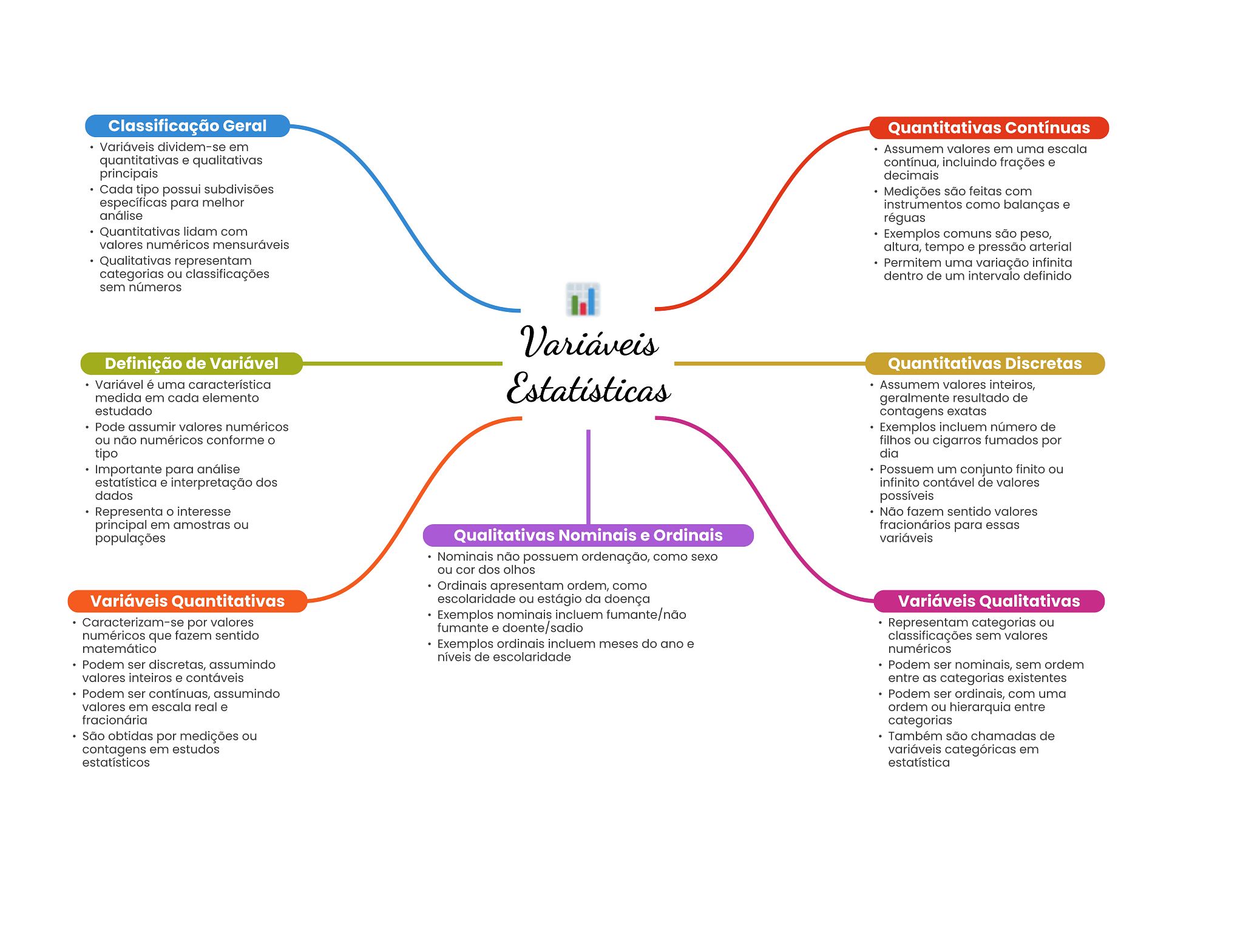 Classificação Geral Quantitativas Contínuas Variáveis dividem-se em Assumem valores em uma escala quantitativas e qualitativas contínua, incluindo frações e principais decimais Cada tipo possui subdivisões Medições são feitas com específicas para melhor instrumentos como balanças e análise réguas Quantitativas lidam com Exemplos comuns são peso, valores numéricos mensuráveis altura, tempo e pressão arterial Qualitativas representam Permitem uma variação infinita categorias ou classificações dentro de um intervalo definido sem números Variáveis Definição de Variável Quantitativas Discretas Variável é uma característica Estatísticas Assumem valores inteiros, medida em cada elemento geralmente resultado de estudado contagens exatas Pode assumir valores numéricos Exemplos incluem número de ou não numéricos conforme filhos ou cigarros fumados por tipo dia Importante para análise Possuem um conjunto finito ou estatística e interpretação dos infinito contável de valores dados possíveis Representa interesse Não fazem sentido valores principal em amostras ou fracionários para essas populações Qualitativas Nominais e Ordinais variáveis Nominais não possuem ordenação, como sexo ou cor dos olhos Ordinais apresentam ordem, como Variáveis Quantitativas escolaridade ou estágio da doença Variáveis Qualitativas Exemplos nominais incluem fumante/não Caracterizam-se por valores fumante e doente/sadio Representam categorias ou numéricos que fazem sentido classificações sem valores matemático Exemplos ordinais incluem meses do ano e numéricos níveis de escolaridade Podem ser discretas, assumindo Podem ser nominais, sem ordem valores inteiros e contáveis entre as categorias existentes Podem ser contínuas, assumindo Podem ser ordinais, com uma valores em escala real e ordem ou hierarquia entre fracionária categorias São obtidas por medições ou Também são chamadas de contagens em estudos variáveis categóricas em estatísticos estatística