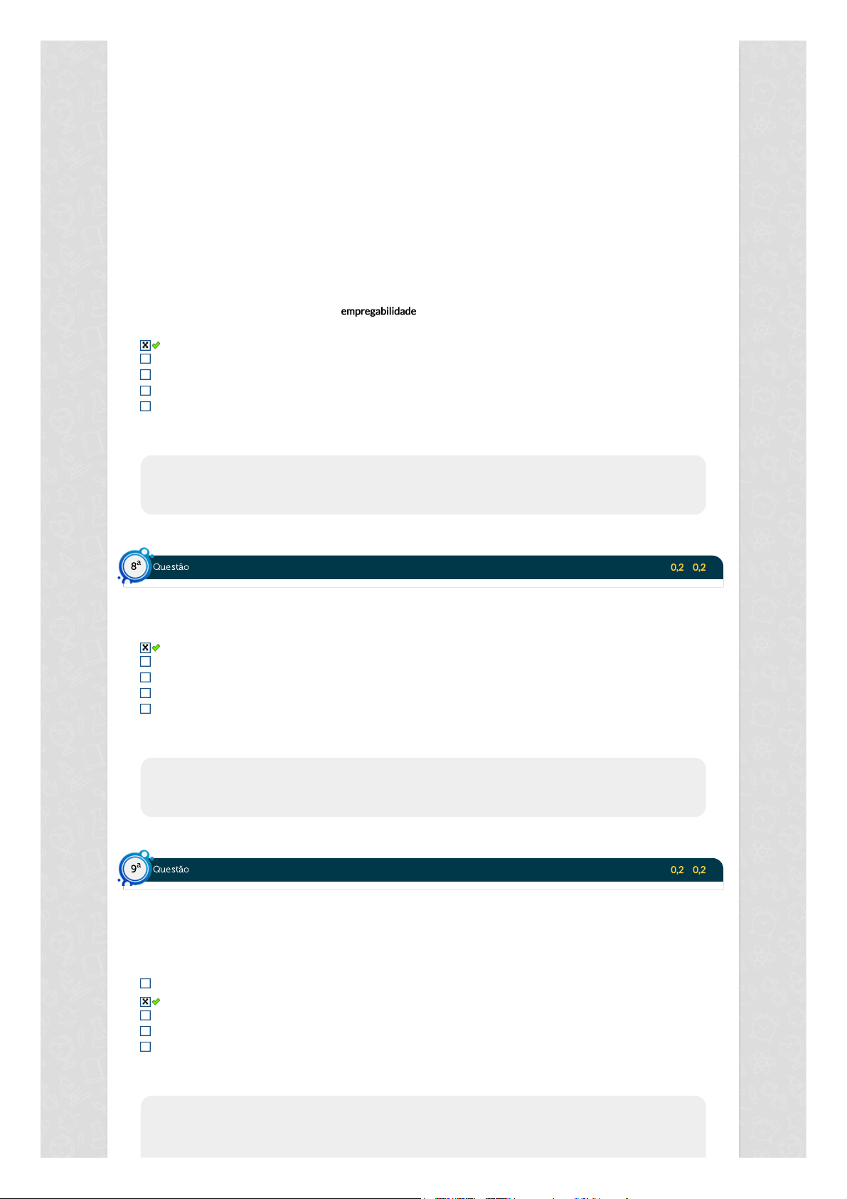 26/09/23, 19:37 Estácio: Alunos https://simulado.estacio.br/alunos/ 3/4 Um trabalho em conjunto entre aqueles que querem aprender e aqueles que podem ensinar só resultaria num círculo virtuoso. Escolas, universidades e a experiência pro�ssional em uma organização favorecem o processo de socialização e a aprendizagem. Imagine a responsabilidade e a oportunidade que essas instituições, seus gestores e líderes têm nas mãos de fazer um excelente trabalho, no sentido de informar sobre as melhores práticas, motivar, in�uenciar e desenvolver o espírito do que é ser um excelente pro�ssional. O que eu vejo, entretanto, é que falta a muitas empresas e instituições de ensino essa visão de propósito, de fazer o melhor. Muitos se perdem no caminho, realizando a sua atividade de maneira estanque: aos olhos do aprendiz, as ações parecem sem sentido e desconectadas. As pessoas atuam como reprodutores, sem sentido e sem emoção. Educar vai muito além do ato de transmitir conhecimento: implica estimular o raciocínio, ajudar a aprimorar o senso crítico e as faculdades intelectuais e morais. Quem educa deve oferecer o necessário para que a outra pessoa consiga desenvolver plenamente a sua personalidade. Agindo como educadores, empresa e escolas poderão contribuir imensamente para o aprimoramento das competências comportamentais tão desejadas. Essa é uma visão de longo prazo. É preciso investir para poder colher. Disponível em:http://www1.folha.uol.com.br/colunas/adrianagomes/2014/12/1558384 educar-para-colher.shtml>- . Acesso em: 15 abr. 2016. No contexto do segundo parágrafo, a palavra empregabilidade signi�ca: Capacidade de ter e manter um emprego no mercado de trabalho. Quantidade de emprego oferecida pelo mercado de trabalho temporário. Escolha de empregos com horários �exíveis. Per�l das empresas quanto à oferta de oportunidades no mercado de trabalho. Competência comportamental desejada pelas empresas empregadoras. Respondido em 26/09/2023 19:21:12 Explicação: Empregabilidade: Pode ser compreendida como a capacidade de aprender coisas novas e também como a conquista de um emprego ou um trabalho, tal como as habilidades para se manter nele e conseguir uma nova recolocação ou fonte de renda quando necessário. Acerto: 0,2 / 0,2 Aos Recursos Humanos Estratégico foram atribuídas novas atividades, entre elas a administração da transformação e mudança. Essa etapa consiste em gerenciar a mudança na organização, realizando todas suas etapas, desde o planejamento até sua implementação. Sobre gestão da mudança, assinale a alternativa que melhor justi�ca sua implementação na organização Responder ao ambiente mutável Fazer a Reengenharia Aumentar o Lucro Defender interesses institucionais Mercado pouco competitivo Respondido em 26/09/2023 19:22:18 Explicação: Gerenciar administração da transformação e mudança é a melhor forma da organização responder ao atual ambiente, que se apresenta cada vez mais mutável. Assim, ao exercer essa etapa, a organização consegue se preparar melhor às alterações de cenário. Acerto: 0,2 / 0,2 Uma determinada empresa precisa contratar um gestor para a área de vendas. Para isso, João, o colaborador responsável pelo processo de recrutamento, deverá recrutar candidatos que possuem escolaridade de nível superior e no mínimo cinco anos de experiência na área de vendas. O orçamento para essa contratação é baixo, por isso, João terá que realizar um processo de recrutamento externo com baixo custo para encontrar potenciais candidatos para essa vaga. Assinale a opção que indica as ferramentas de recrutamento adequada para atender as necessidades dessa organização. Cartazes na porta da Empresa e Entidades Governamentais. Consulta a bancos de dados e Site da empresa. Feira de Empregos e Palestras em Universidades. Indicação e anúncio em jornais e revistas especializados. Headhunters e agência de recrutamento. Respondido em 26/09/2023 19:23:16 Explicação: A resposta correta é: Consulta a bancos de dados e Site da empresa. Questão8 a Questão9 a