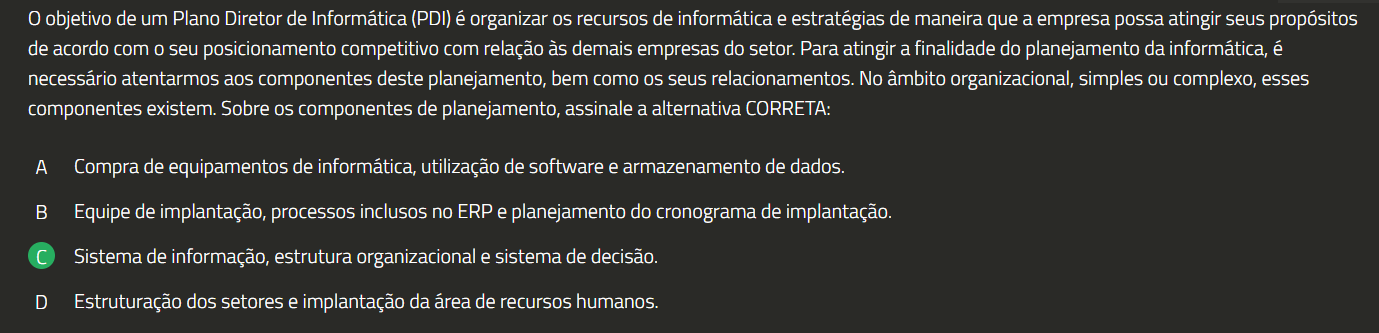 0 objetivo de um Plano Diretor de Informática (PDI) é organizar recursos de informática e estratégias de maneira que a empresa possa atingir seus de acordo com 0 seu posicionamento competitivo com relação às demais empresas do setor. Para atingir a finalidade do planejamento da informática, é necessário atentarmos aos componentes deste planejamento, bem como seus relacionamentos. No âmbito organizacional, simples ou complexo, esses componentes existem. Sobre componentes de planejamento, assinale a alternativa CORRETA: A Compra de equipamentos de informática, utilização de software e armazenamento de dados. Equipe de implantação, processos inclusos no ERP e planejamento do cronograma de implantação. Sistema de informação, estrutura organizacional e sistema de decisão. D Estruturação dos setores e implantação da área de recursos humanos.